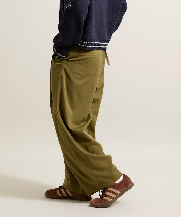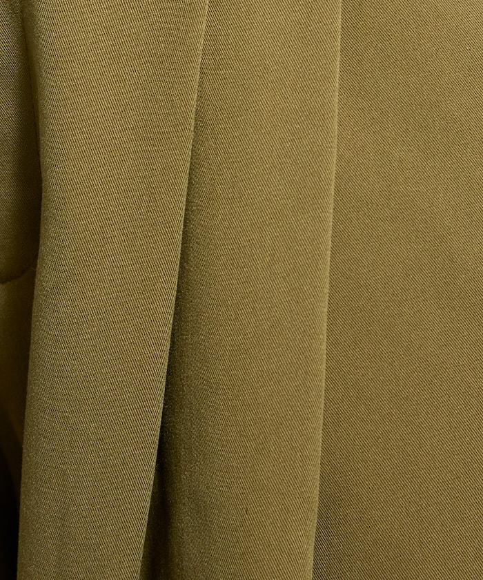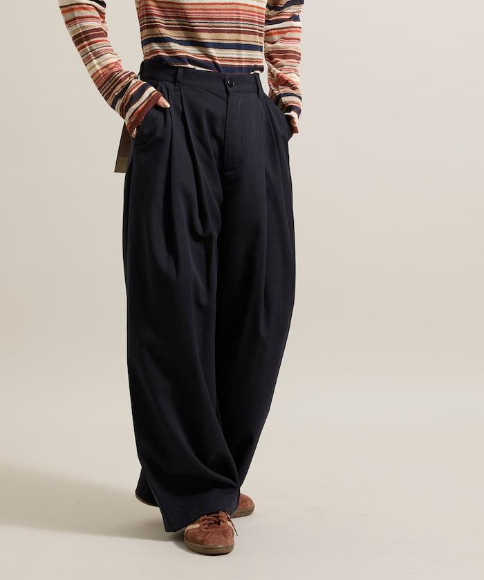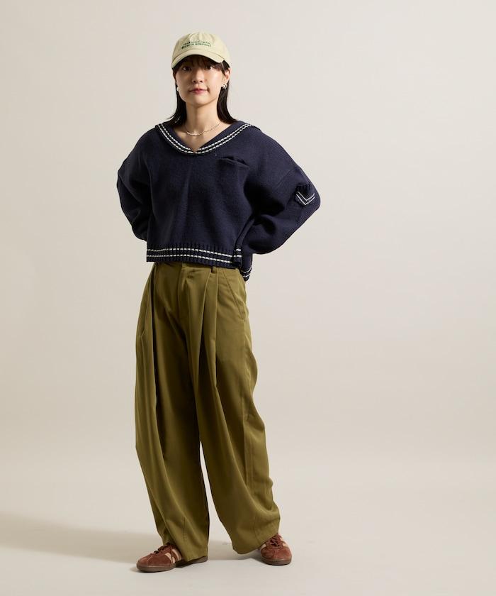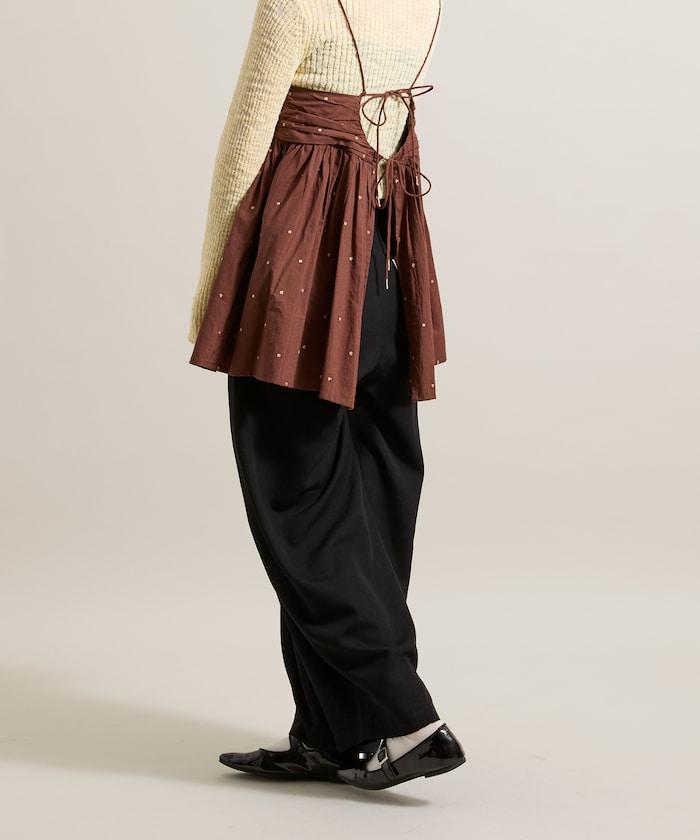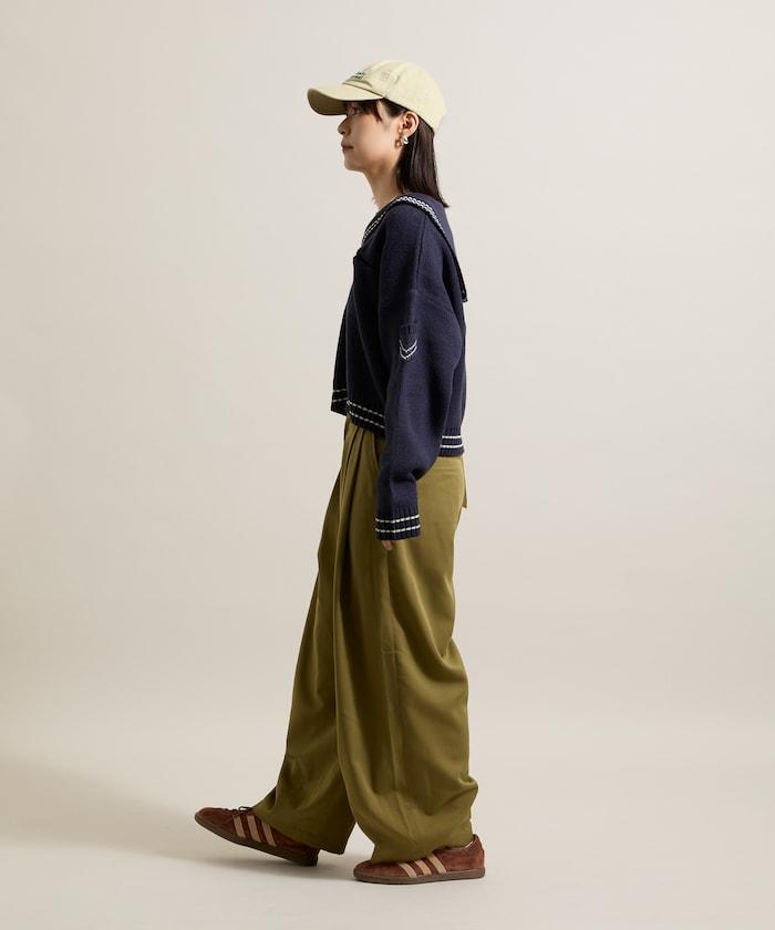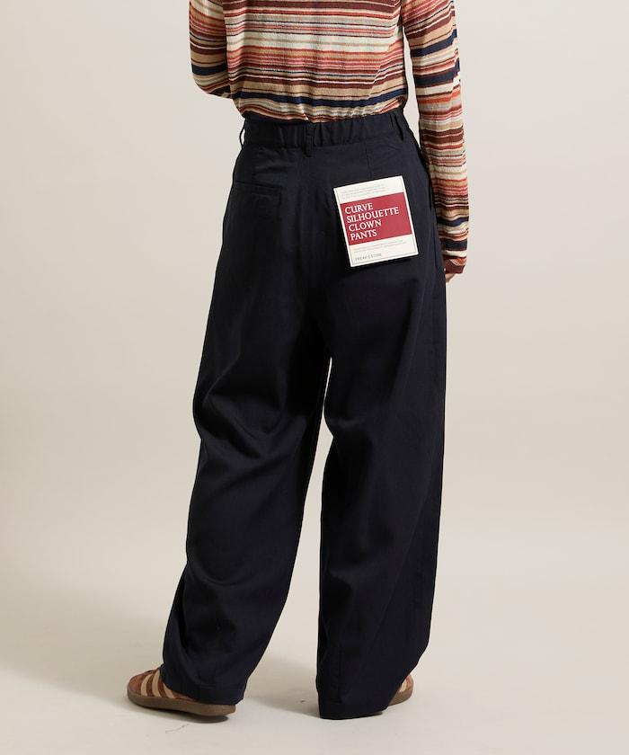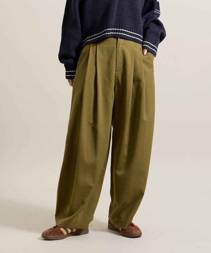 腰部的兩個收褶和下襬處的褶襉使大腿至膝蓋處的體積感更加明顯,營造出圓潤、立體的寬大輪廓。