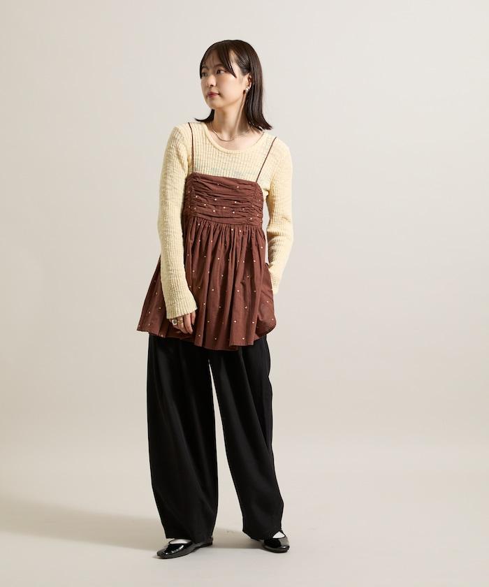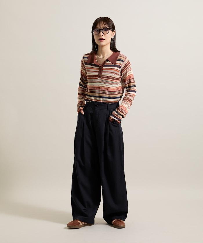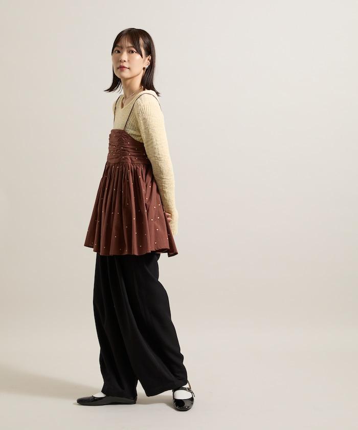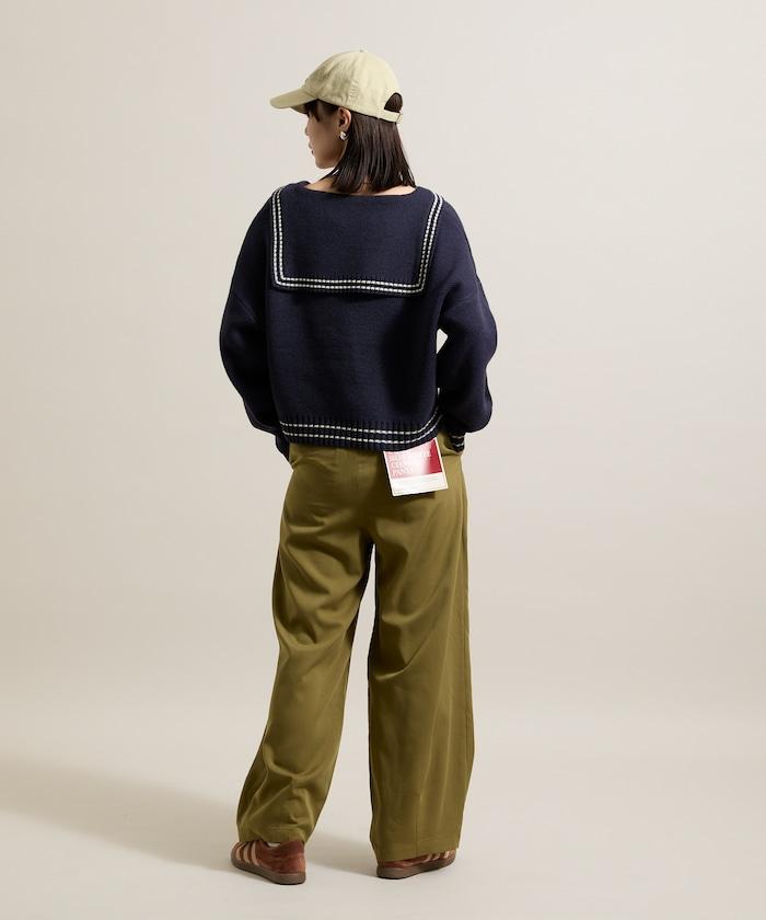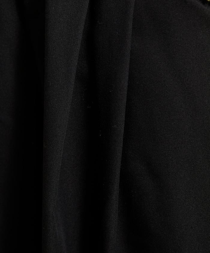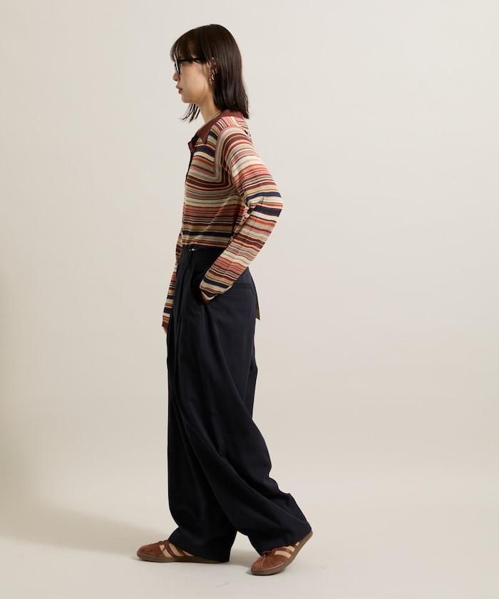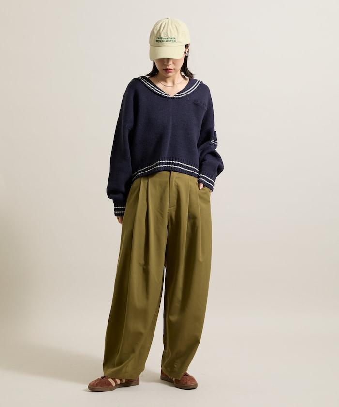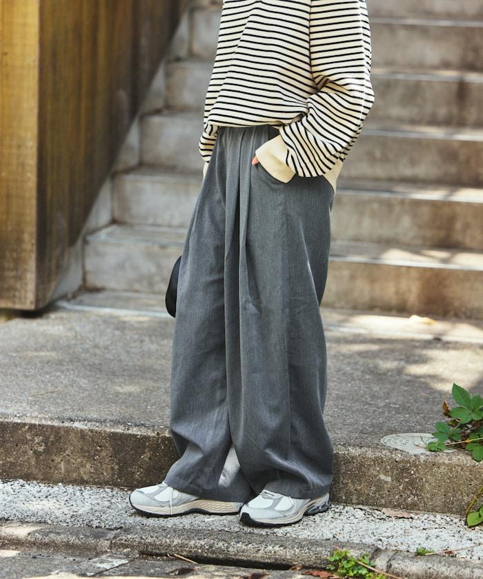 腰部的兩個收褶和下襬處的褶襉使大腿至膝蓋處的體積感更加明顯,營造出圓潤、立體的寬大輪廓。