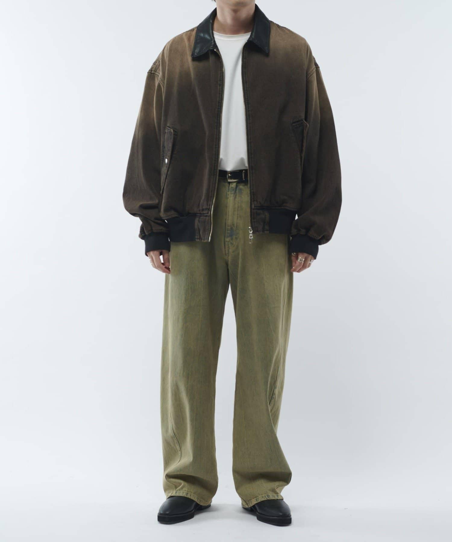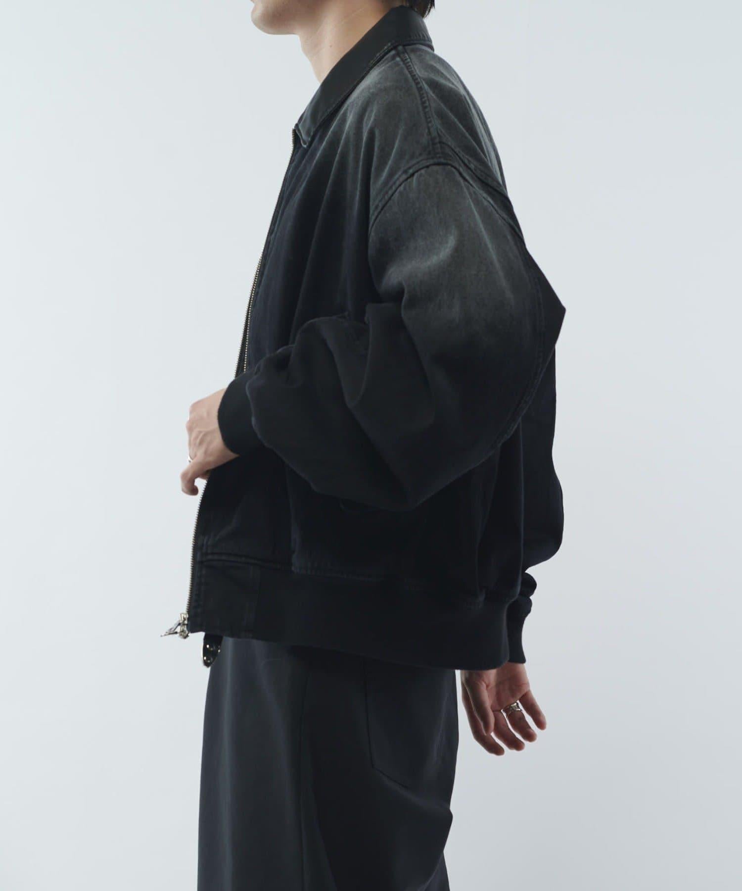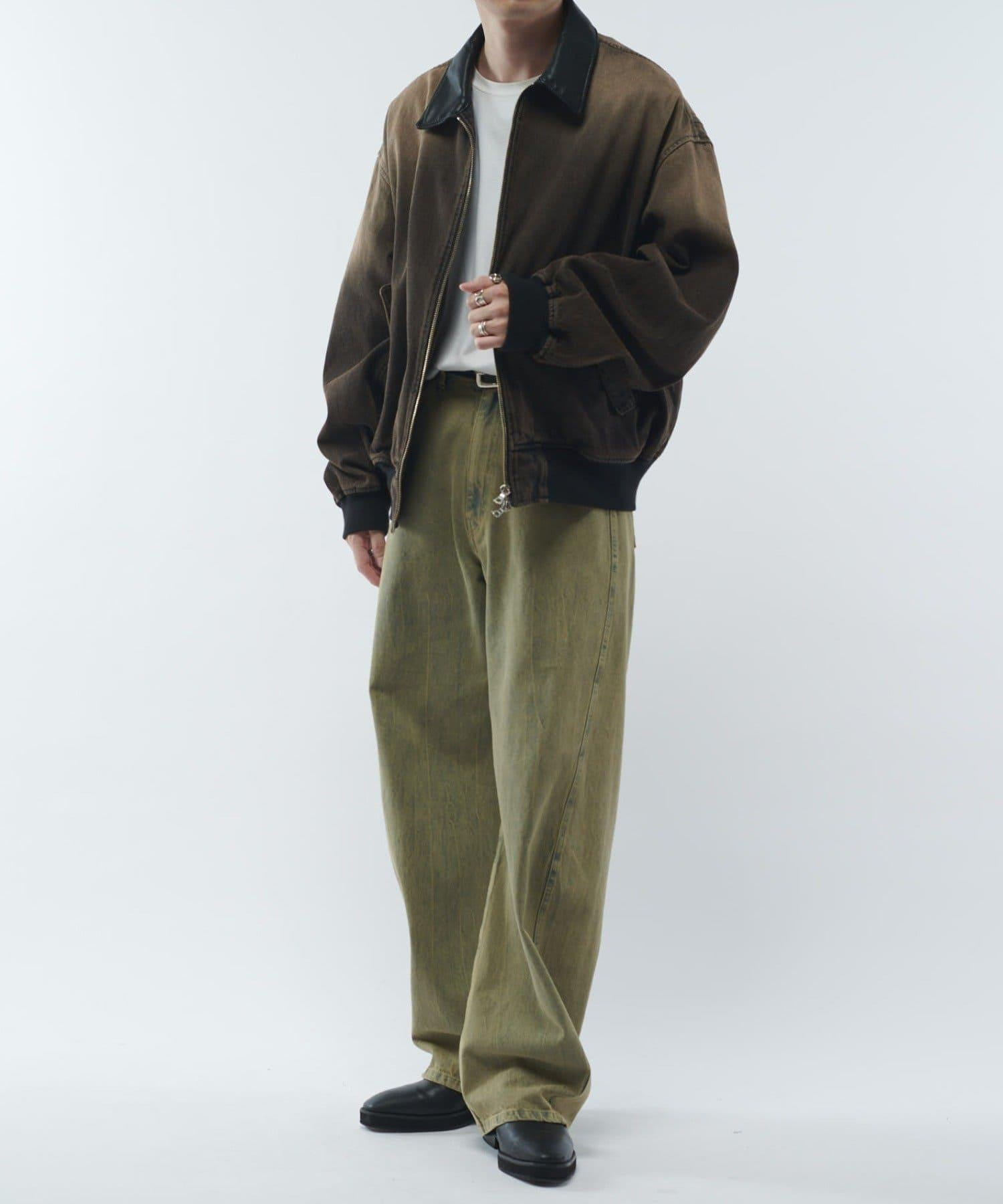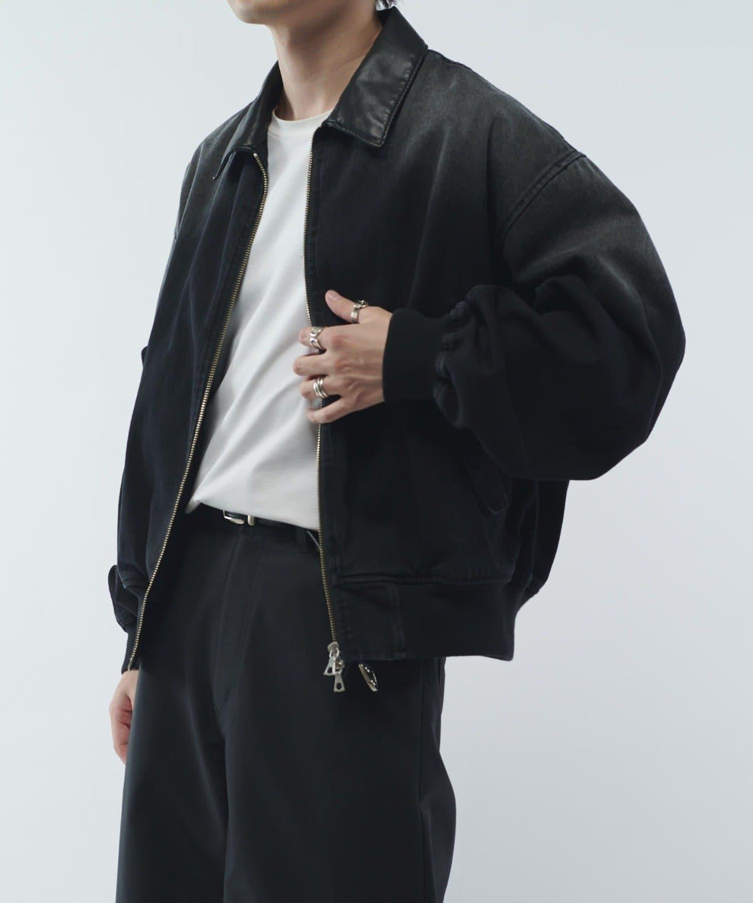 這款夾克的領子是皮質的。寬鬆的版型,衣身寬度相對於長度較寬。袖口也很寬,穿著時能形成立體輪廓。表面經過水洗和顏料處理,給人一種復古的感覺。