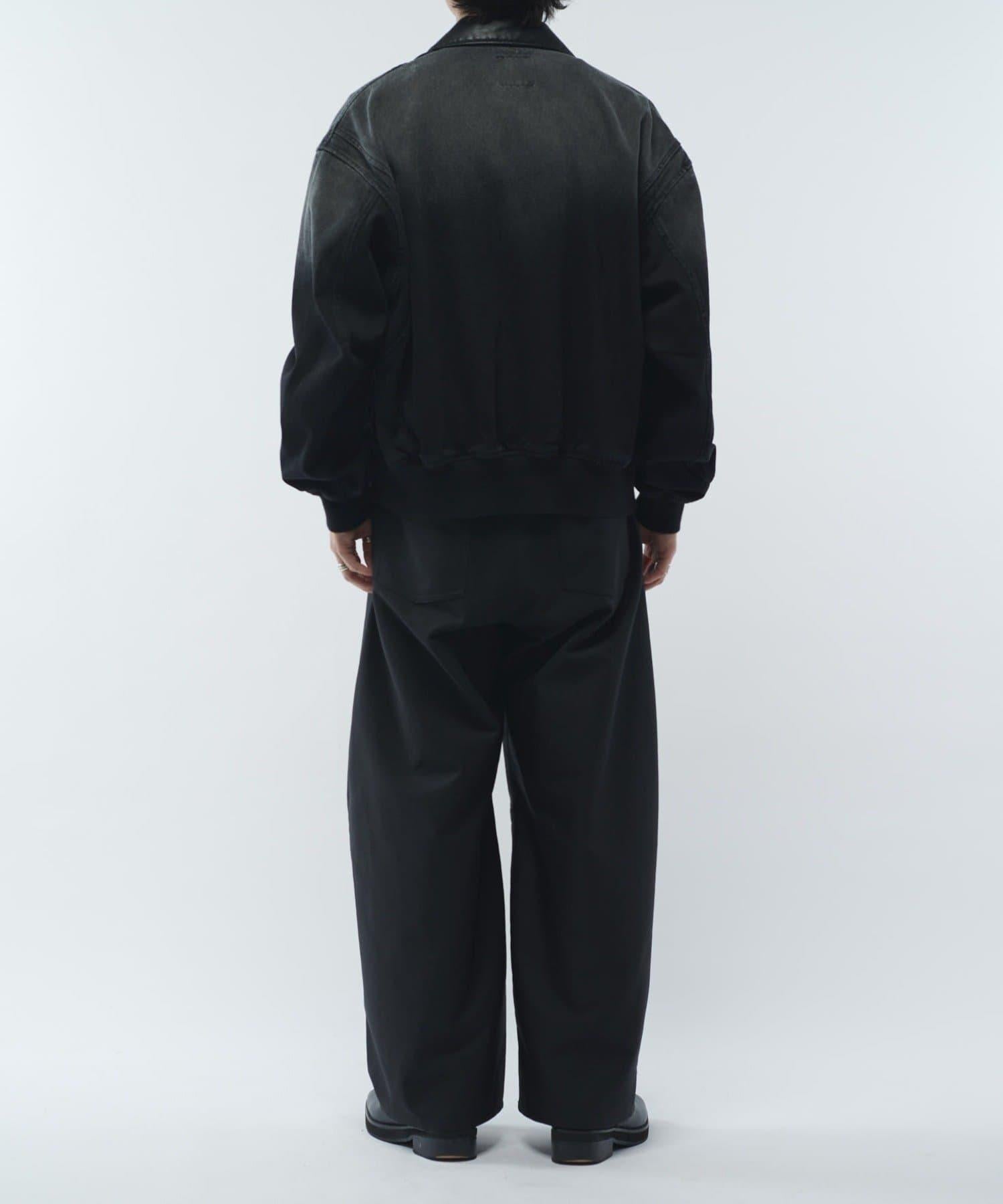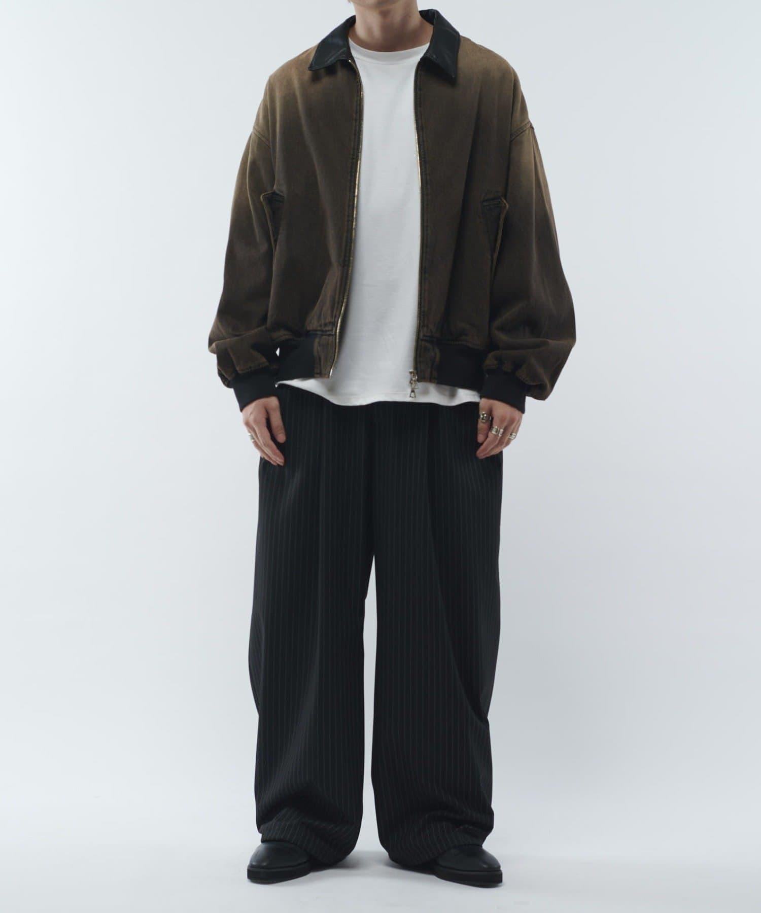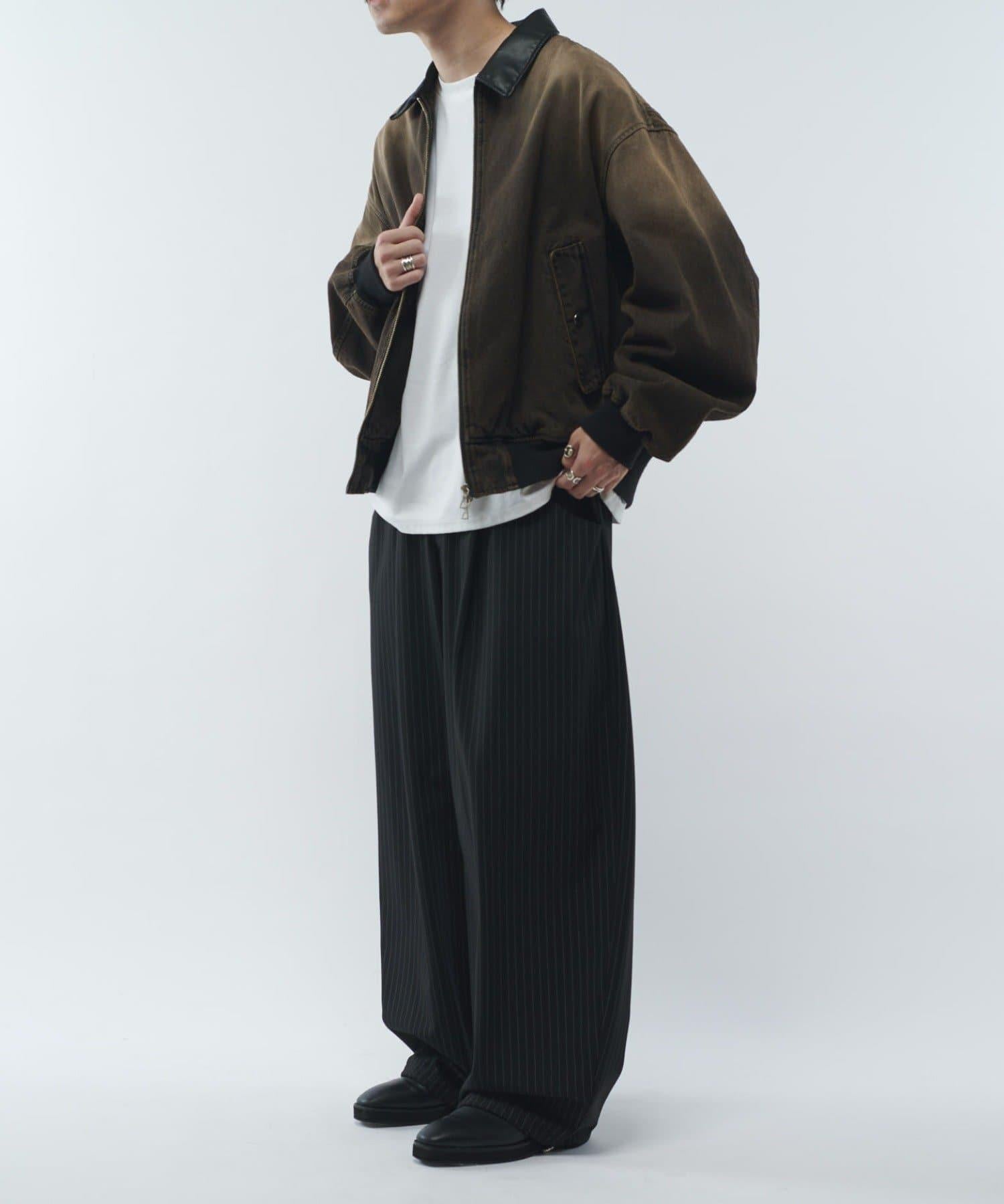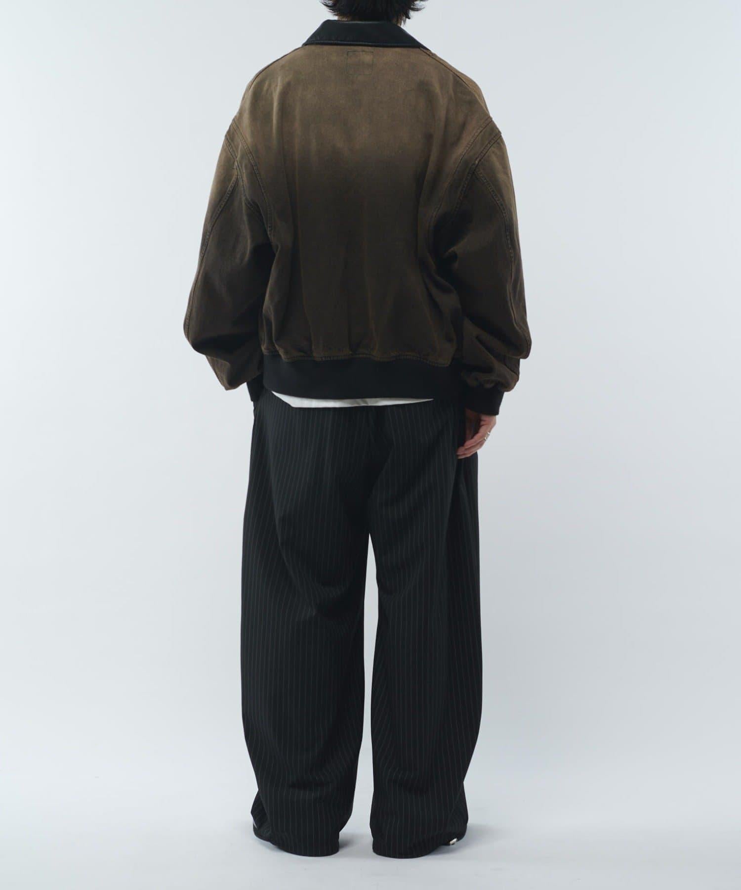 這款夾克的領子是皮質的。寬鬆的版型,衣身寬度相對於長度較寬。袖口也很寬,穿著時能形成立體輪廓。表面經過水洗和顏料處理,給人一種復古的感覺。