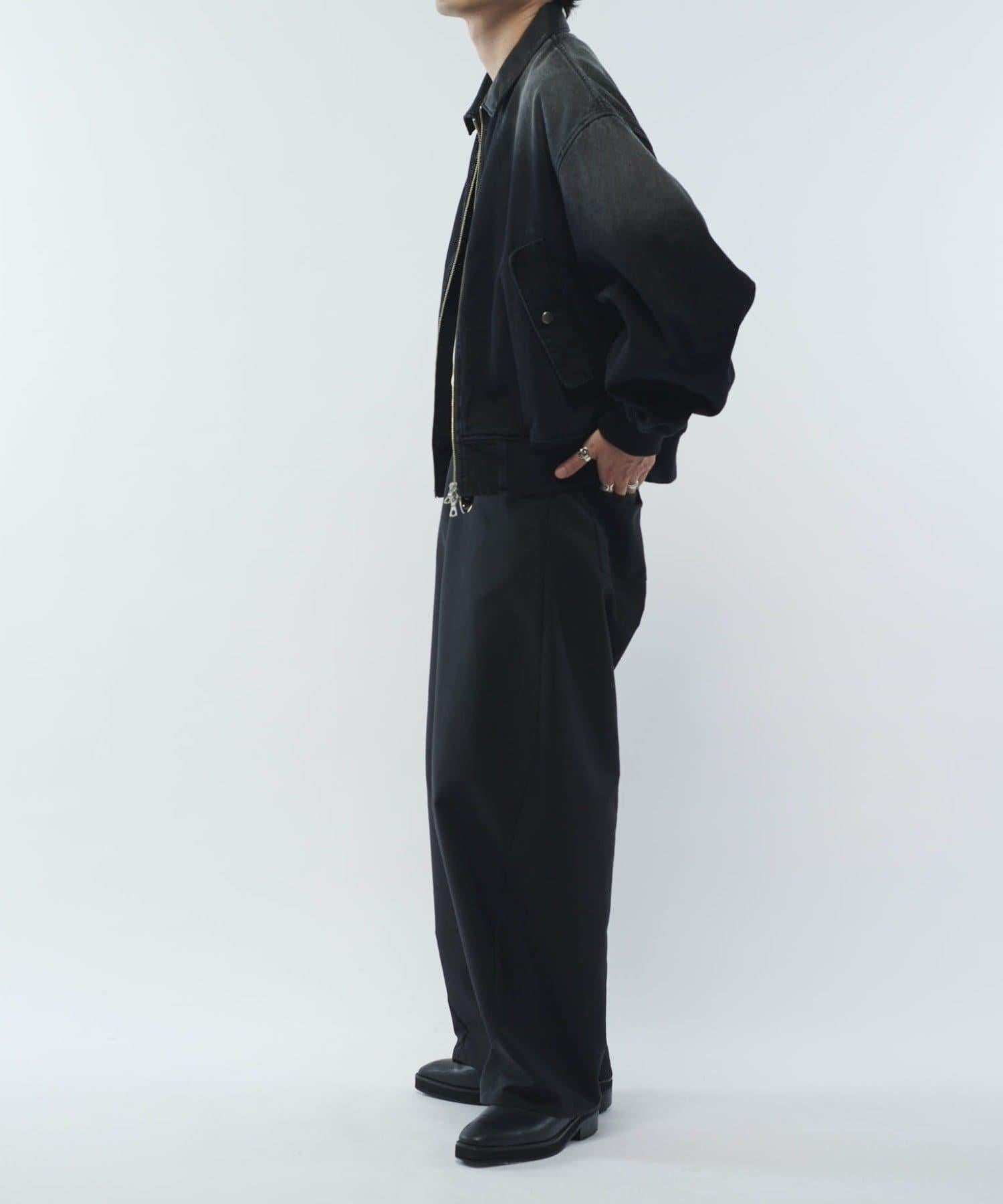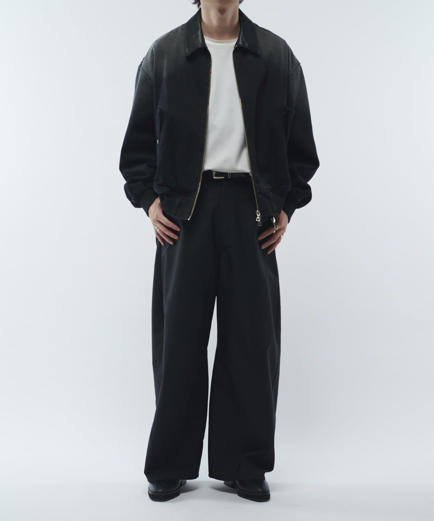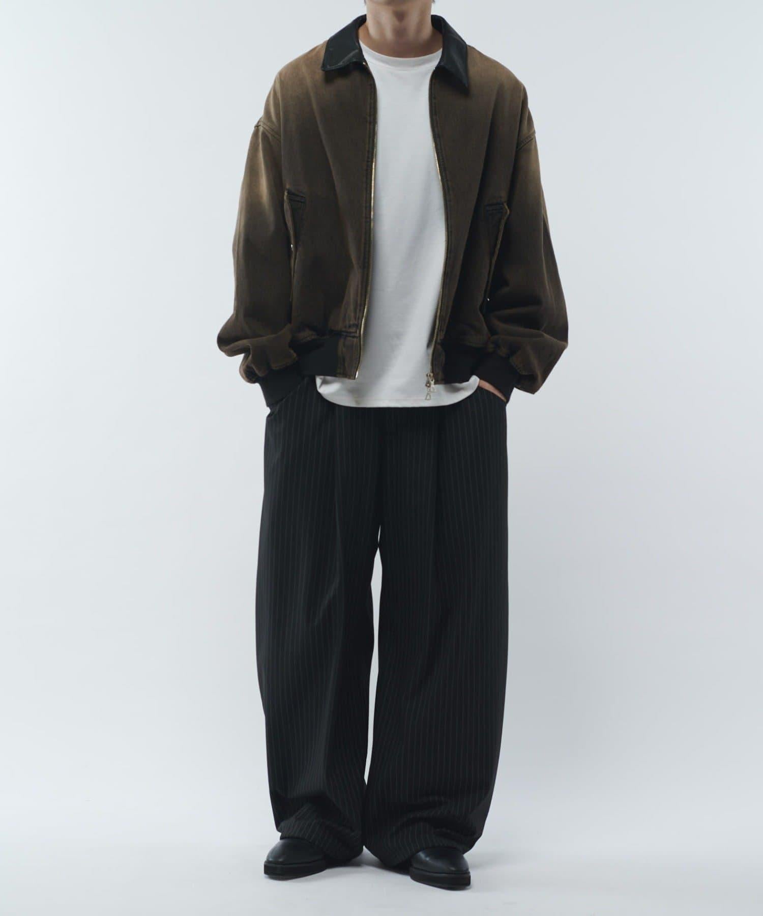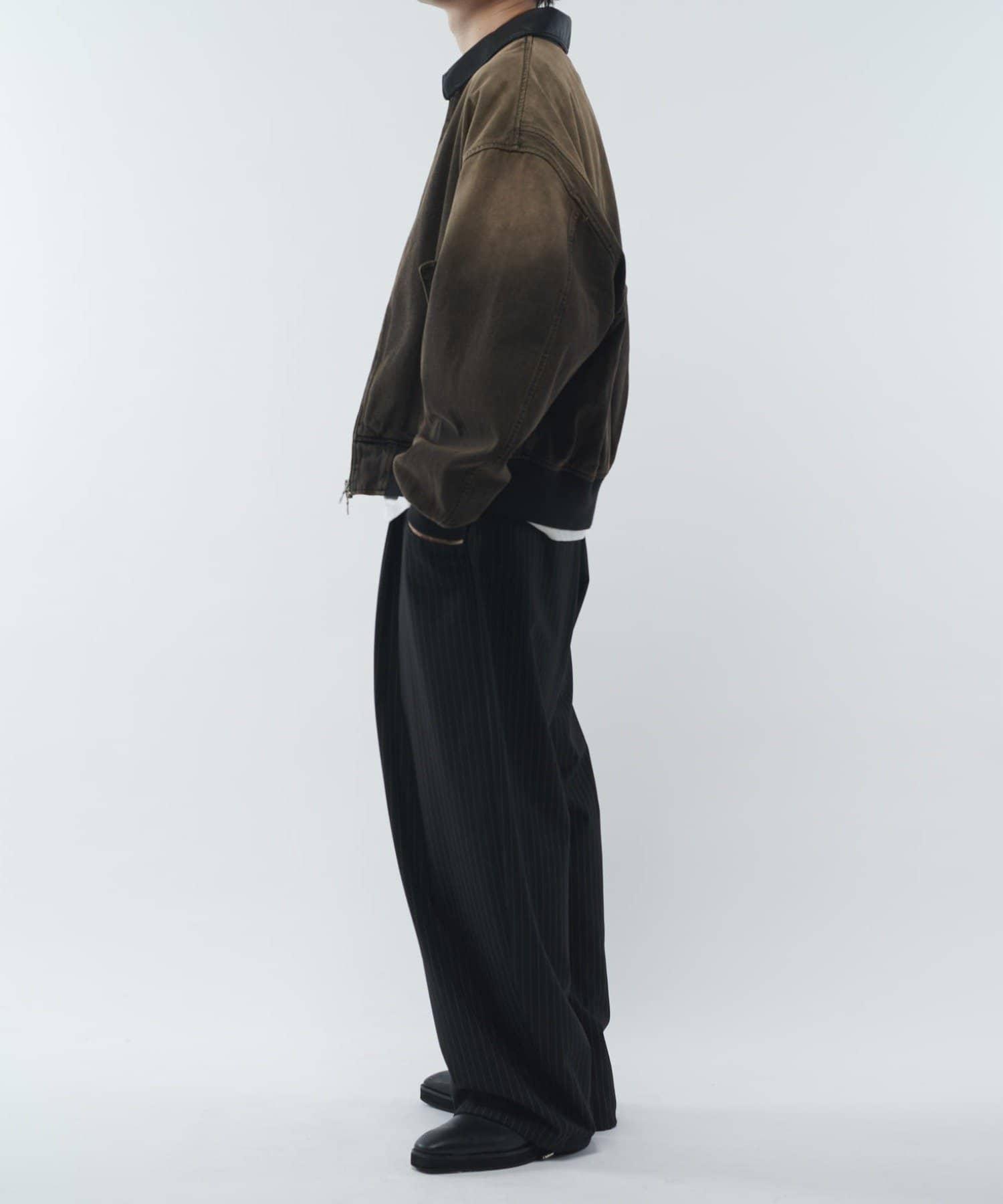 這款夾克的領子是皮質的。寬鬆的版型,衣身寬度相對於長度較寬。袖口也很寬,穿著時能形成立體輪廓。表面經過水洗和顏料處理,給人一種復古的感覺。