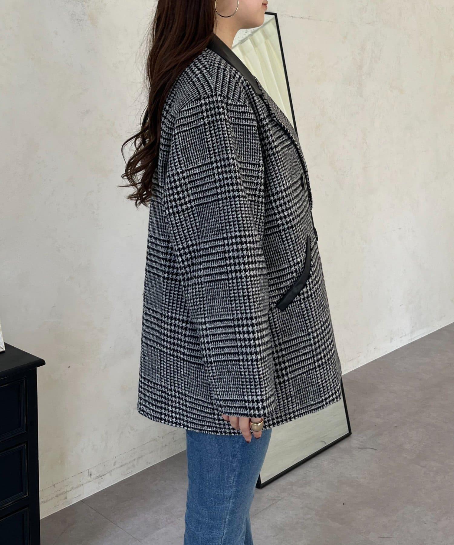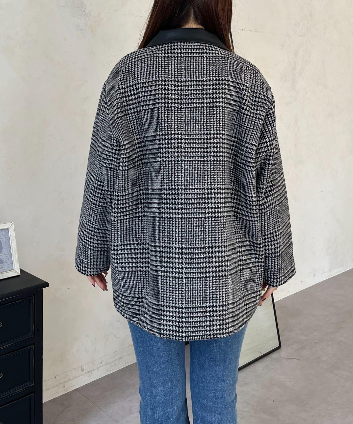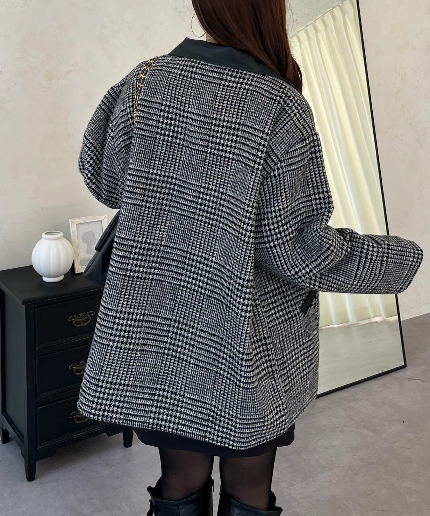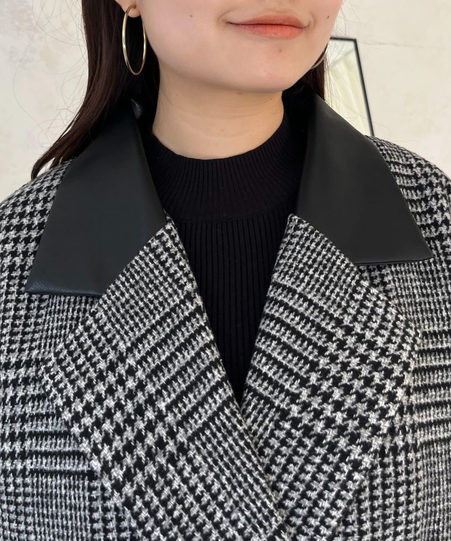 皮革領拼接內襯絎縫格紋大衣