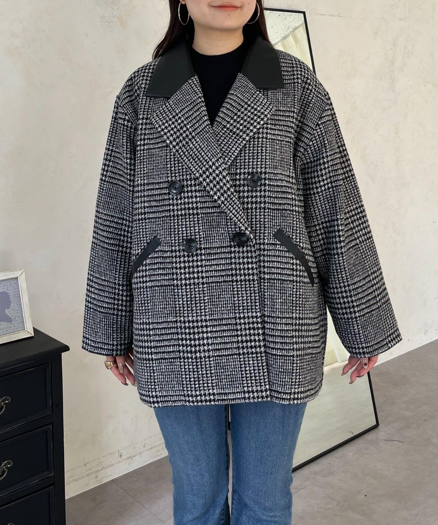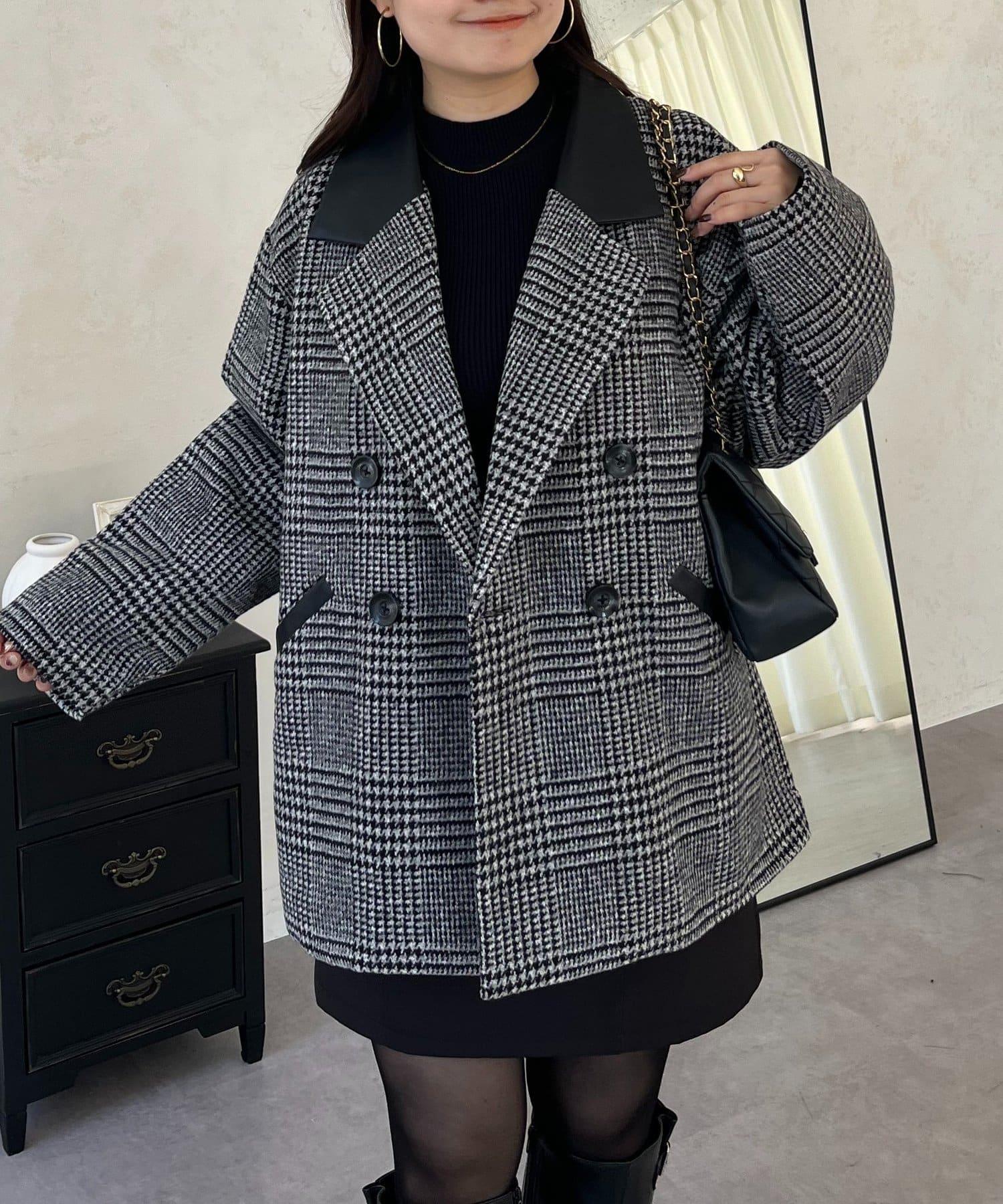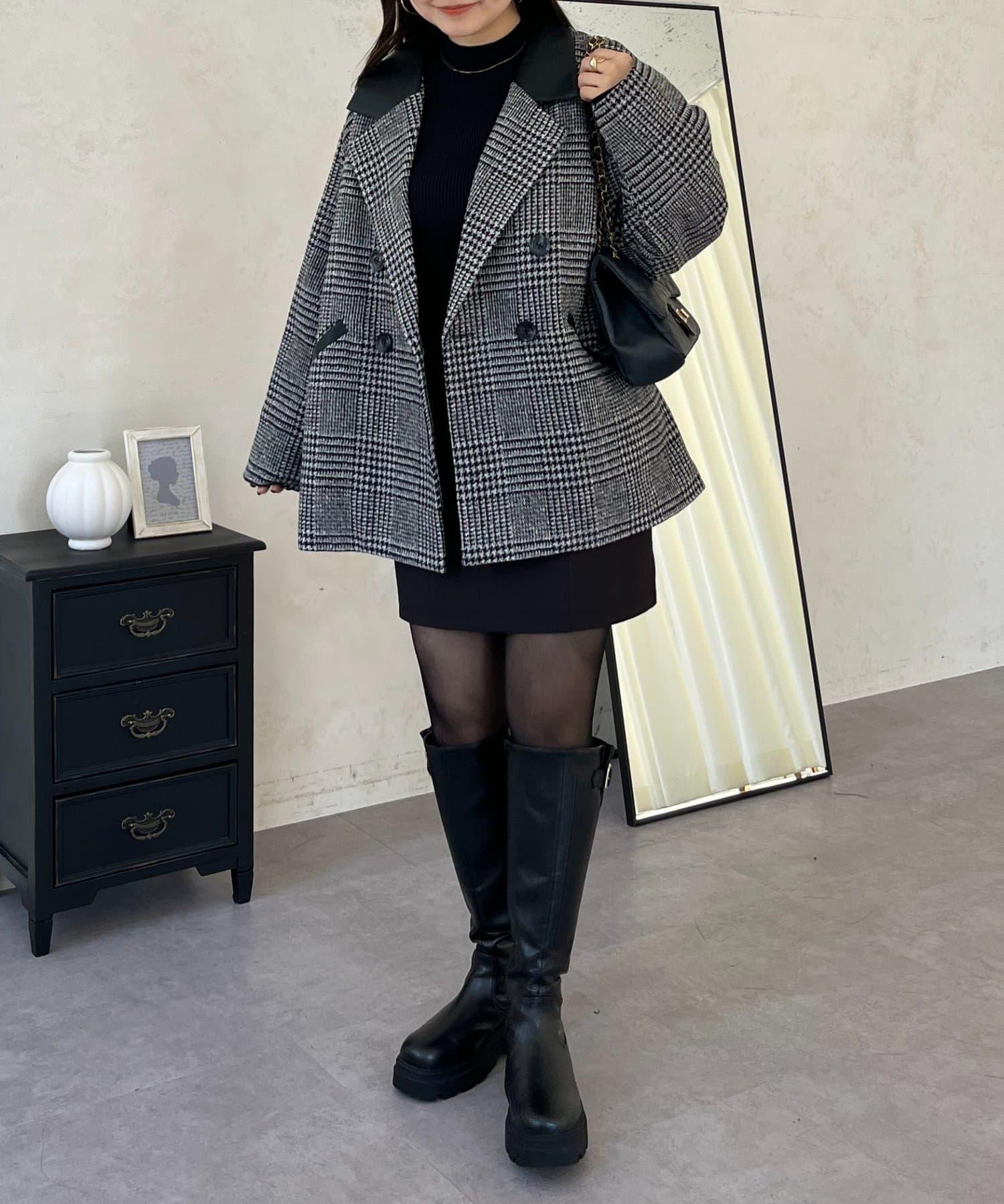 皮革領拼接內襯絎縫格紋大衣