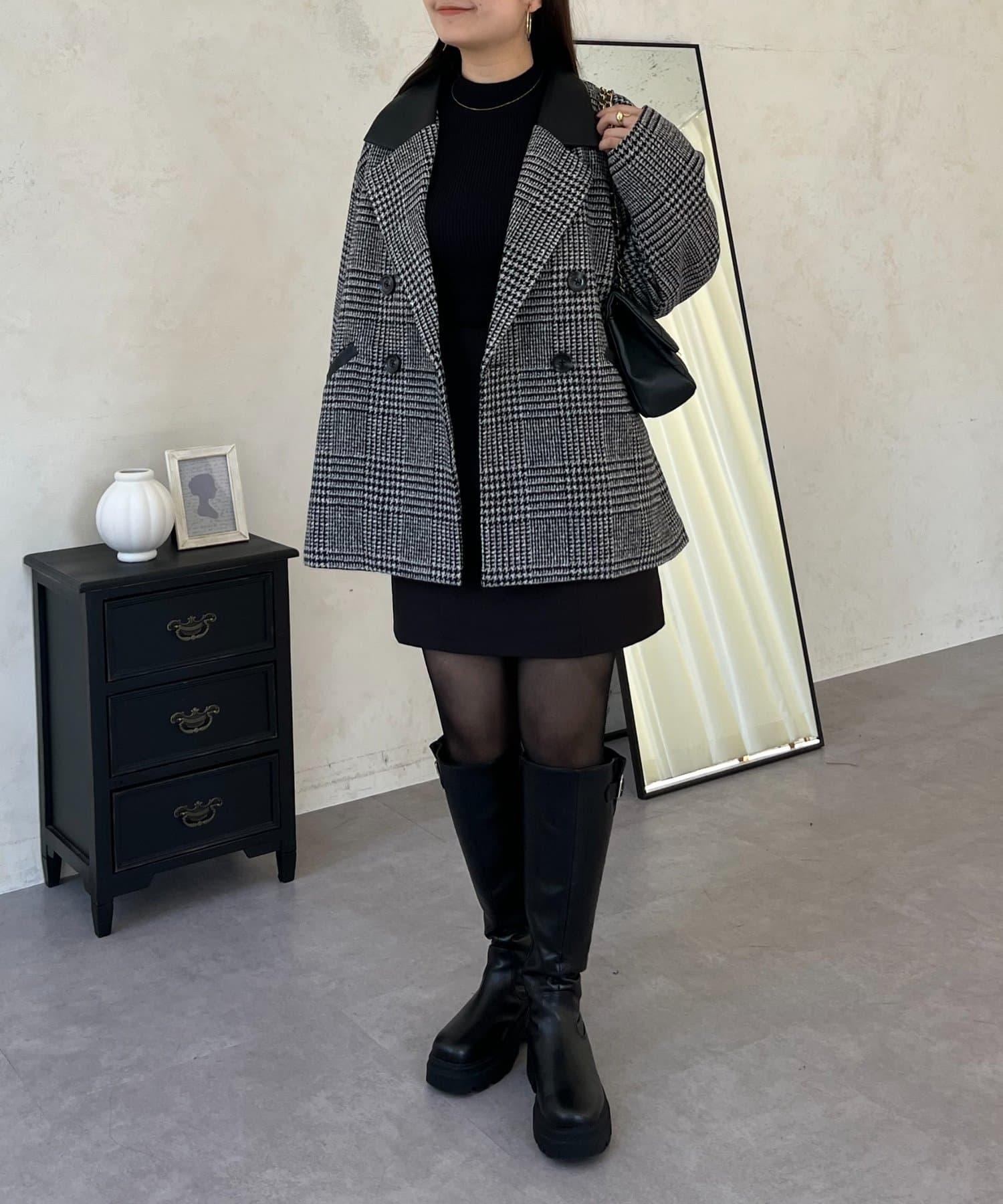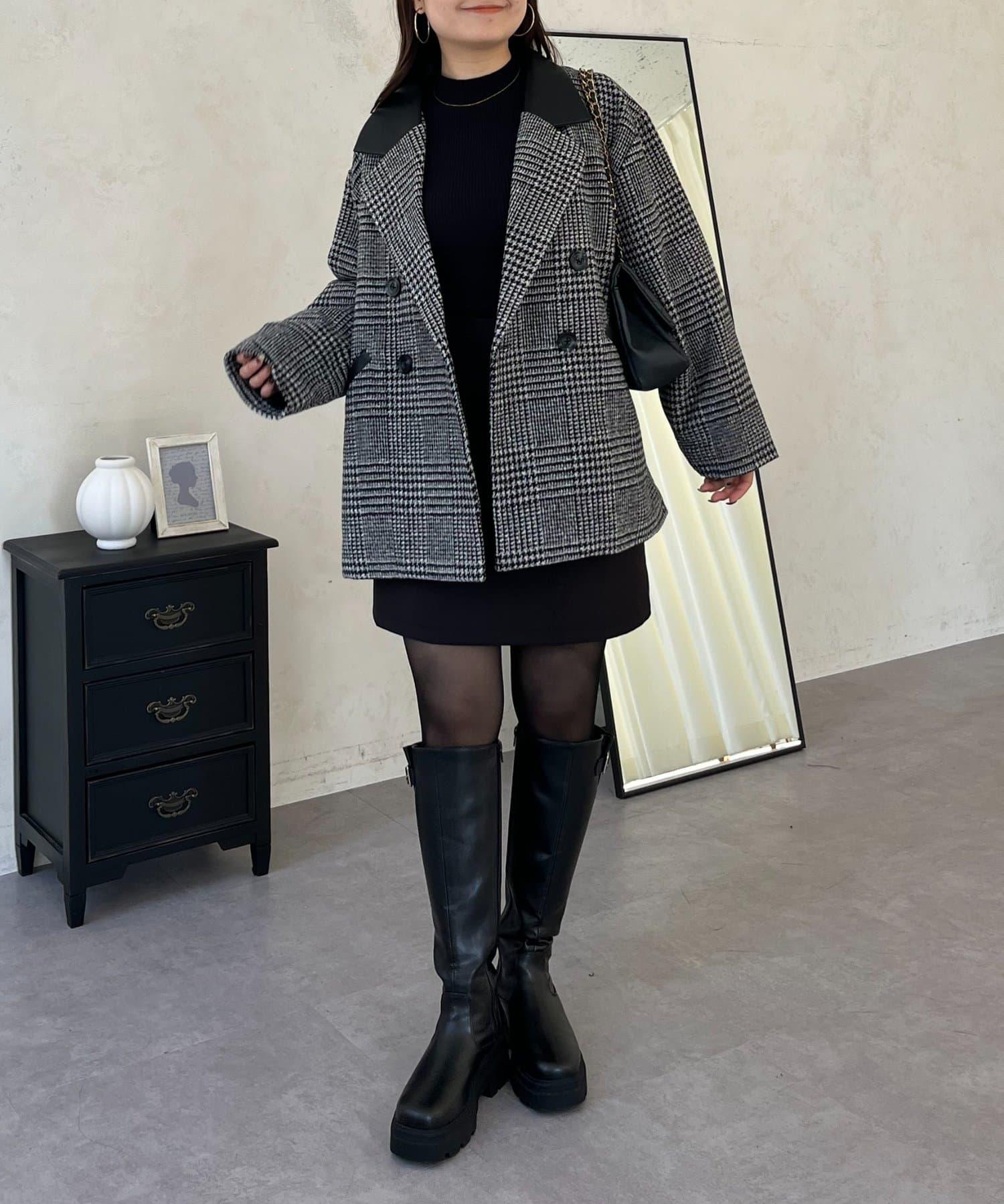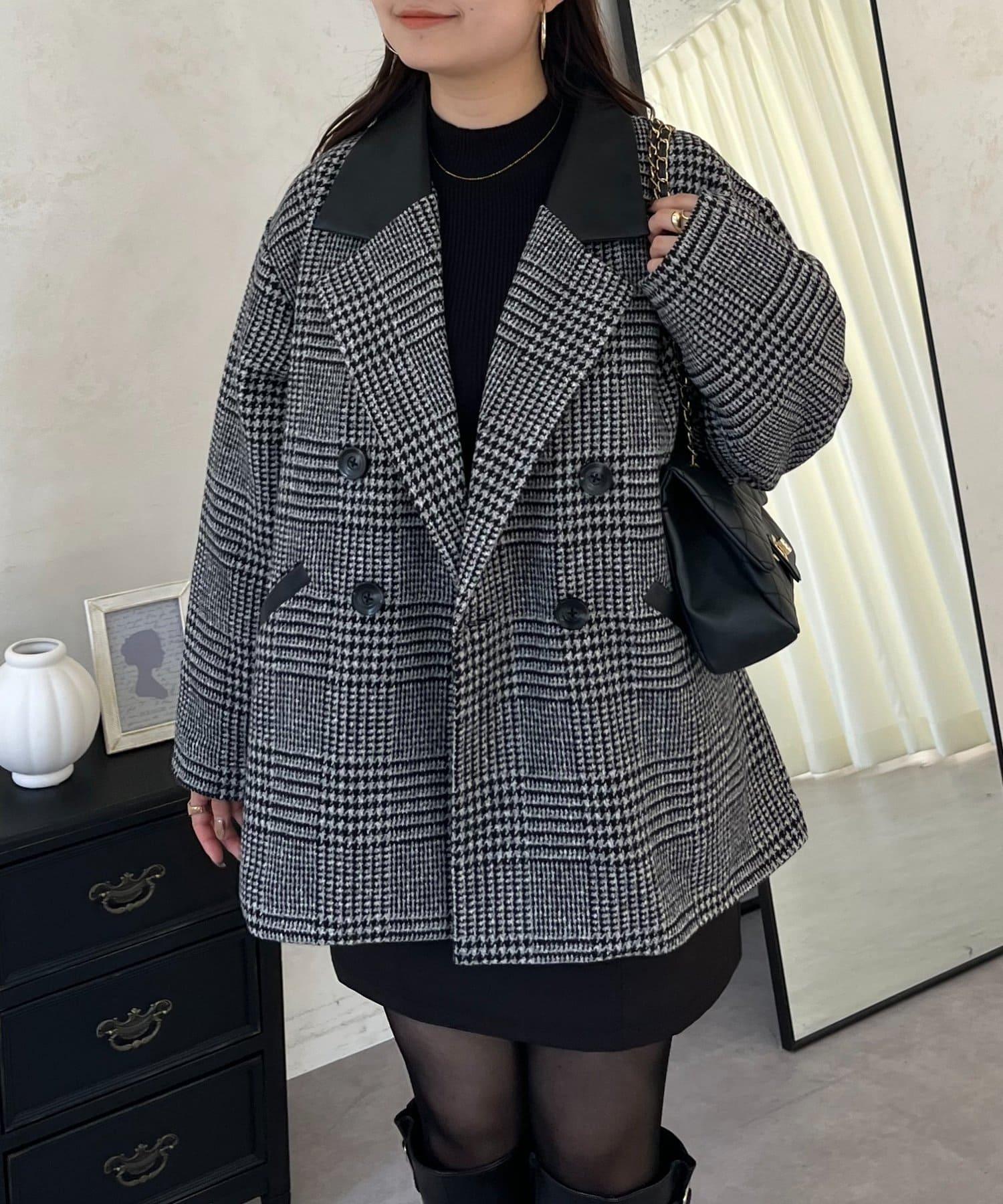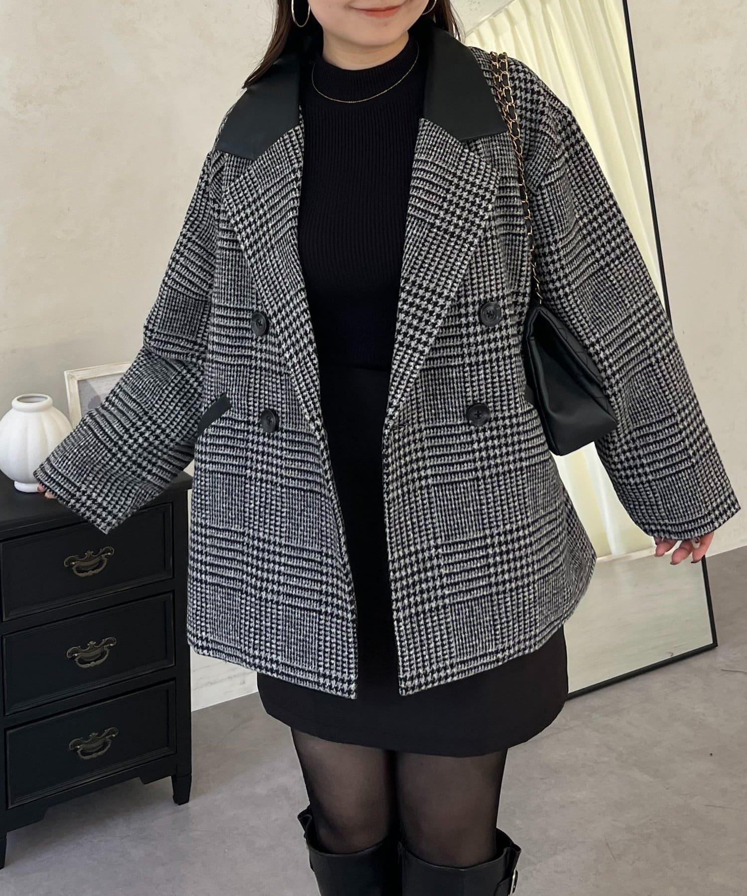 皮革領拼接內襯絎縫格紋大衣