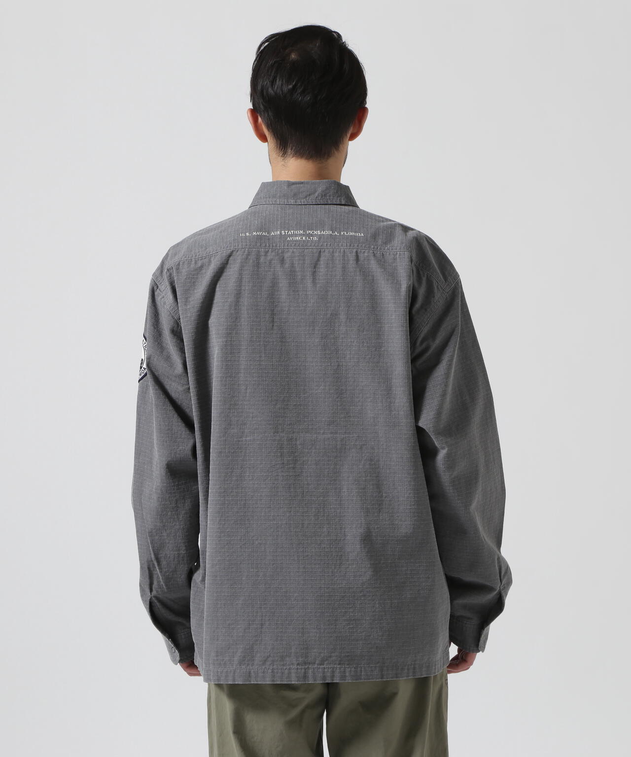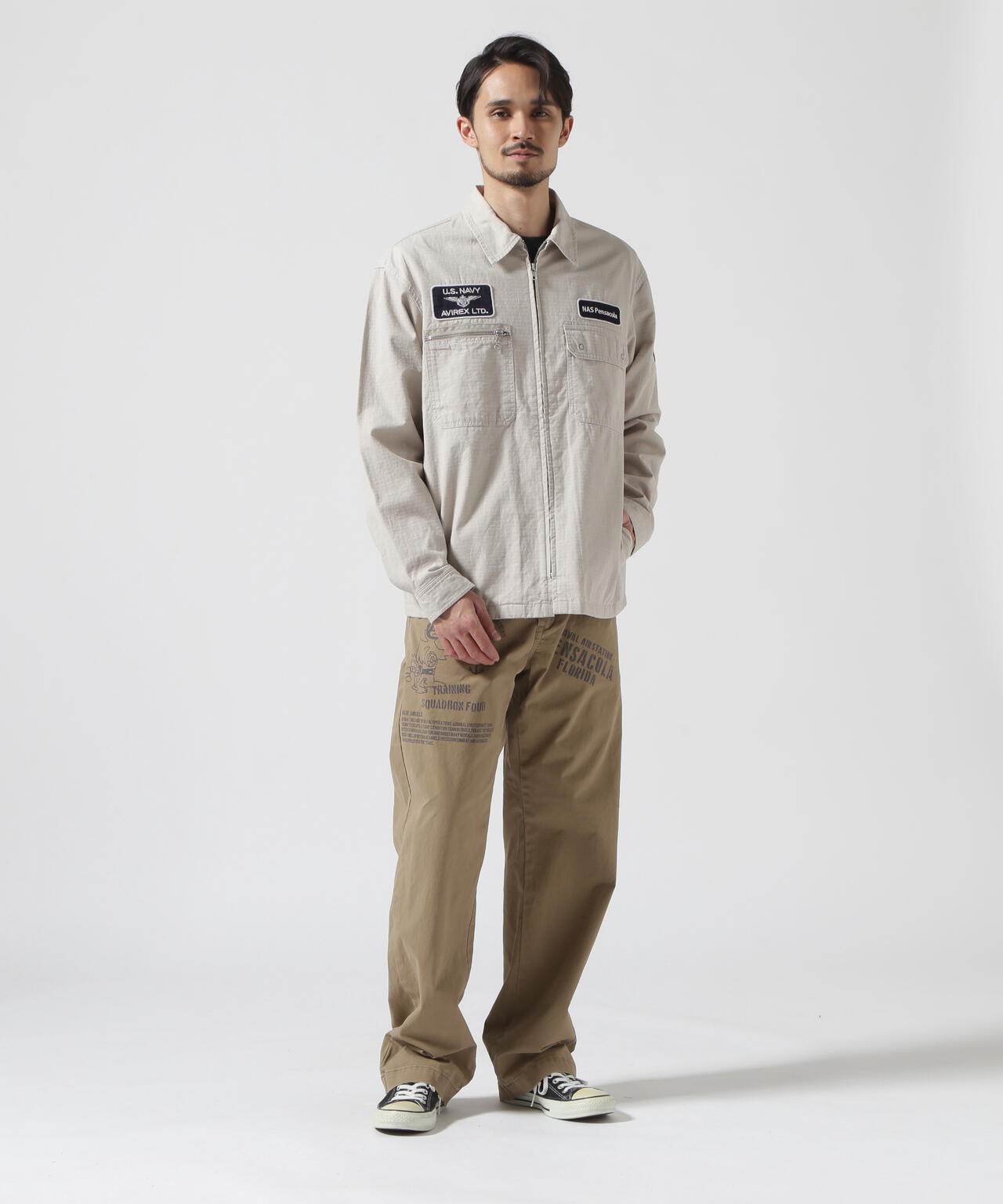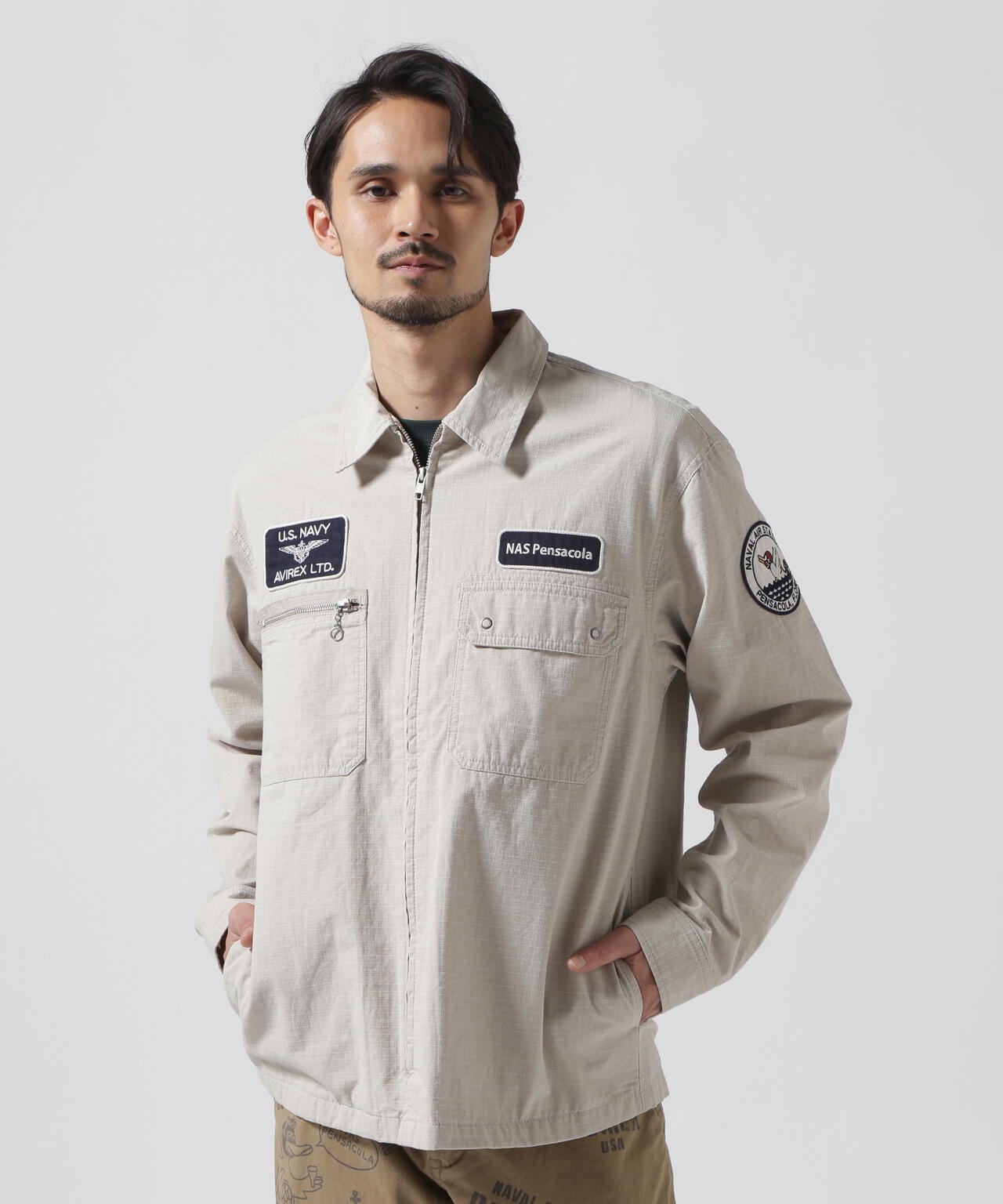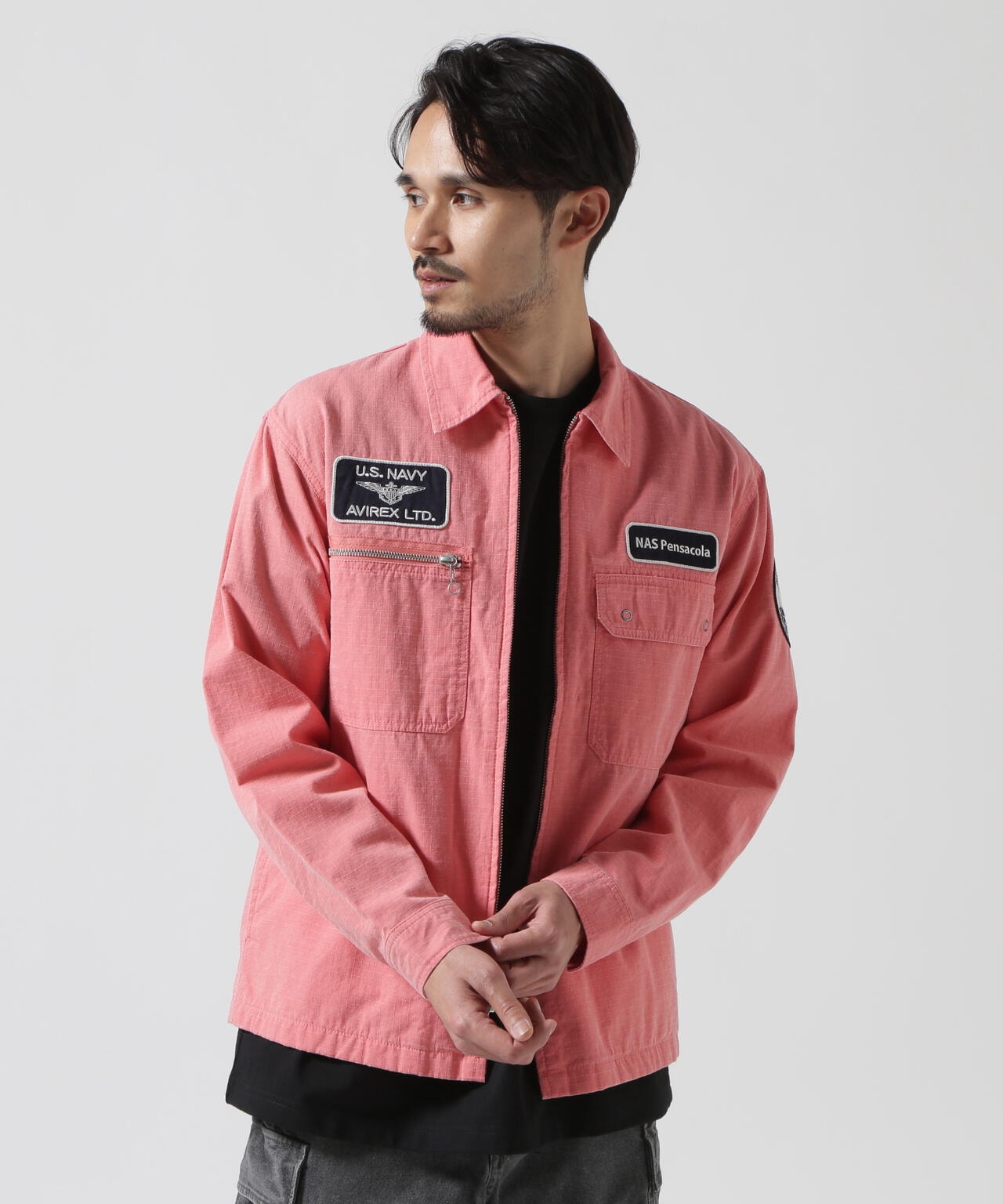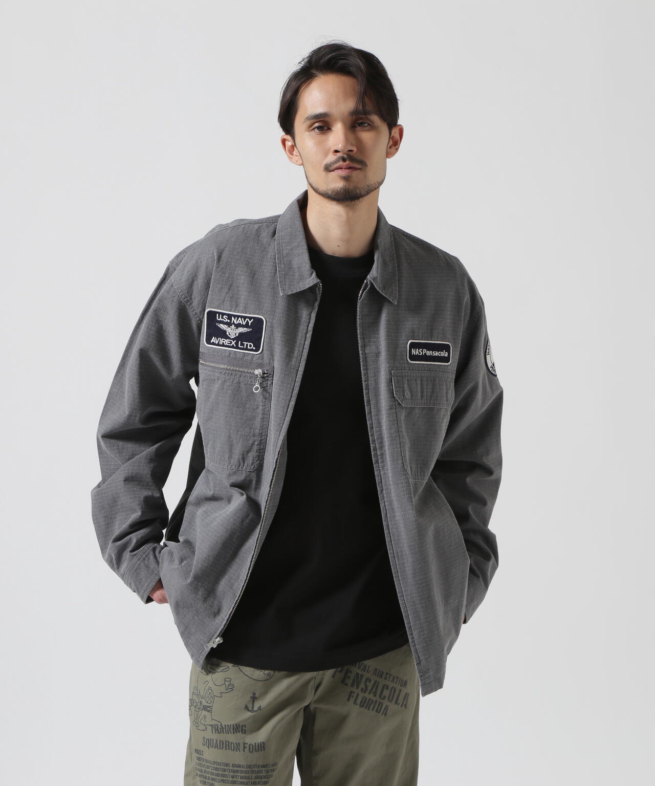<顏料染色紋理 100%全棉抗撕裂面料,箱型廓形,拉鍊前襟,基於 2024 年春夏主題的 NAVAL AIR STASION PENSACOLA 圖案設計。以 2024 春夏為主題的 NAVAL AIR STASION PENSACOLA 圖案設計融入刺繡徽章中,彰顯工作品味。