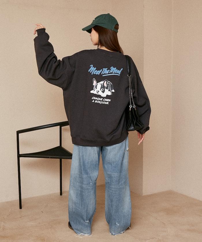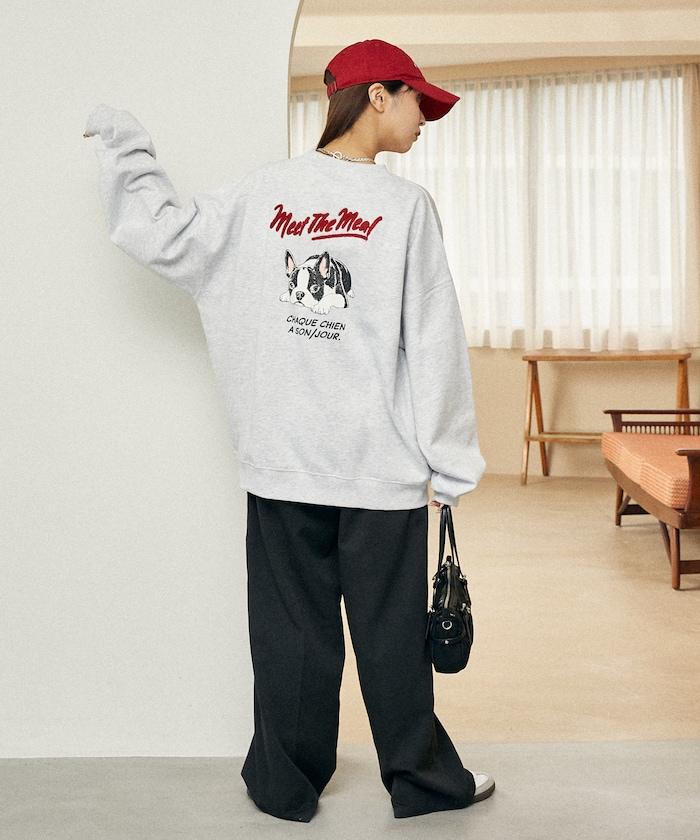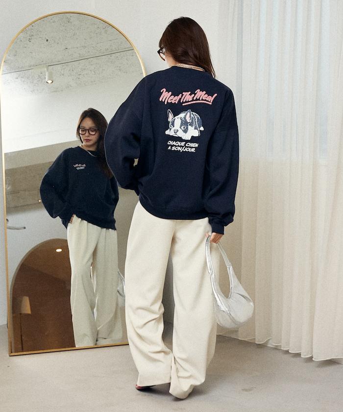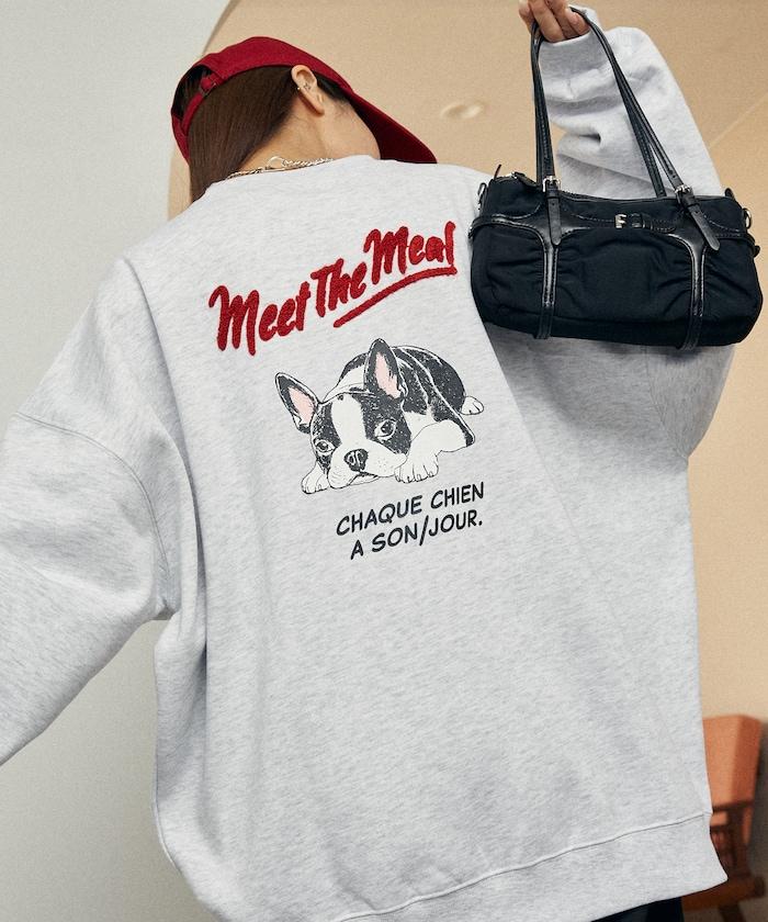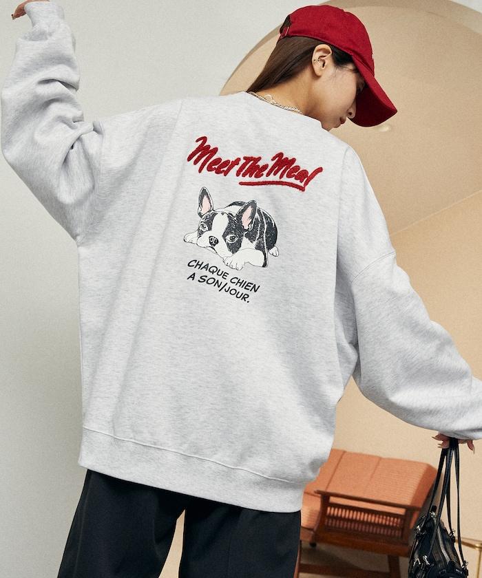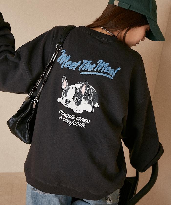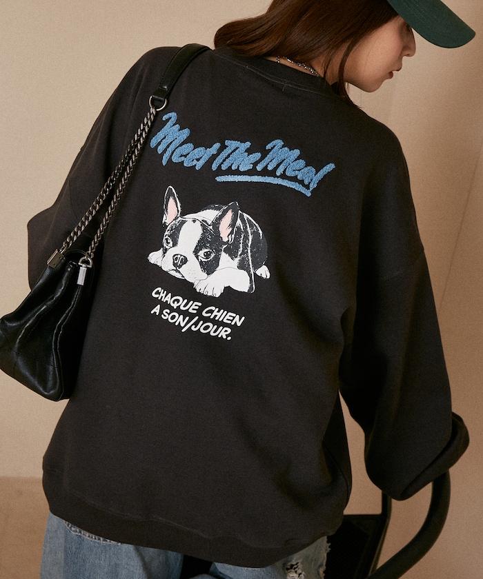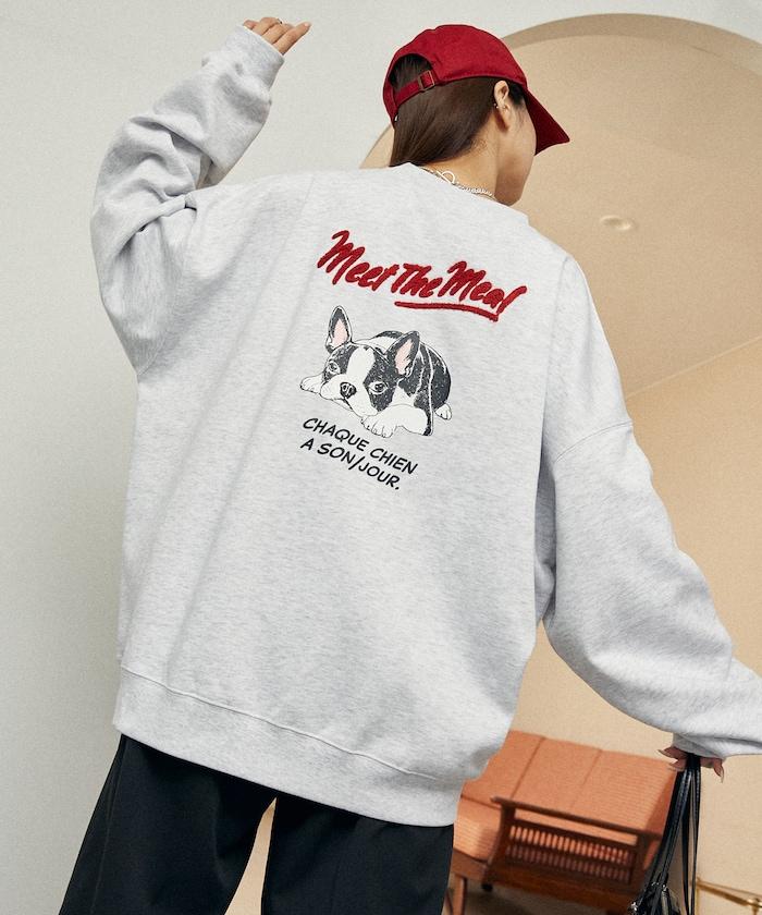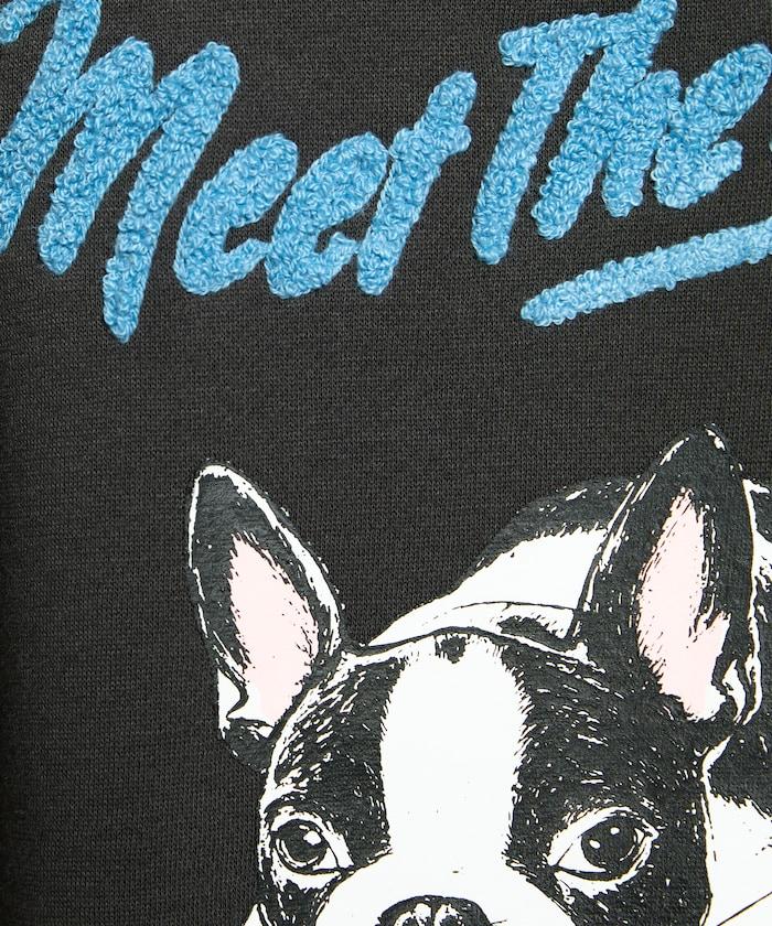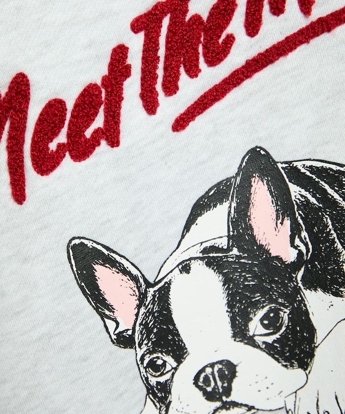 這款圓領運動衫的設計令人印象深刻,背部的法國鬥牛犬動物印花與相良刺繡的英文字母相結合。