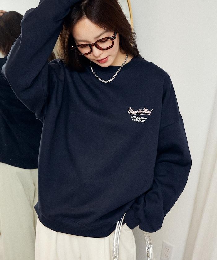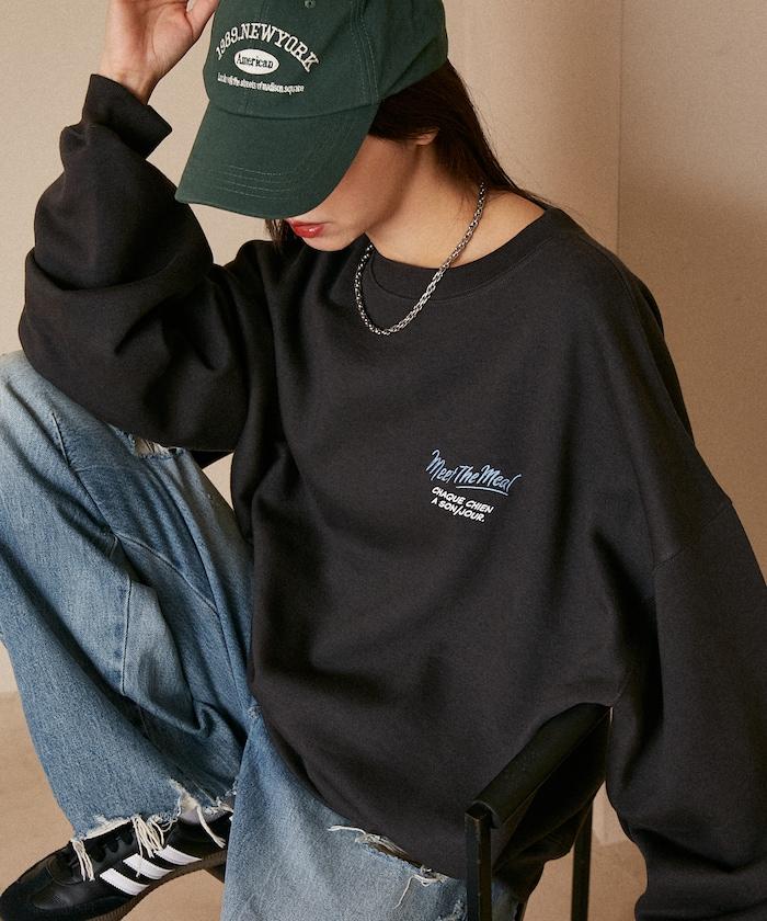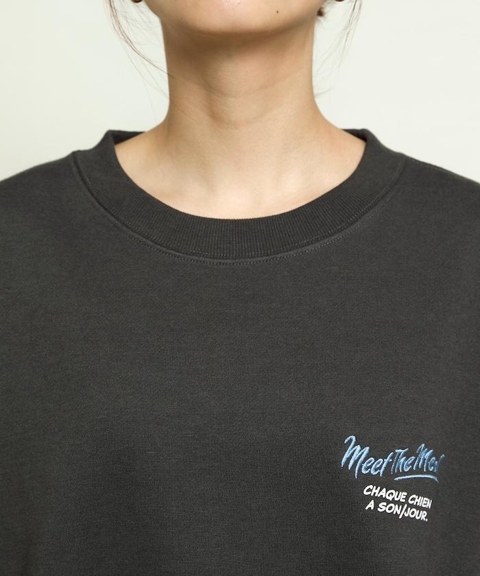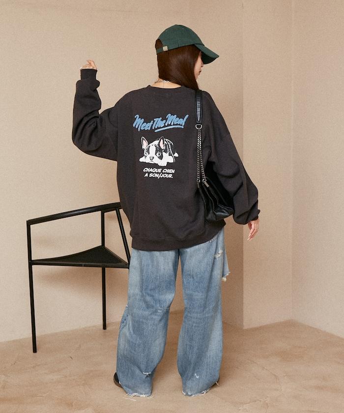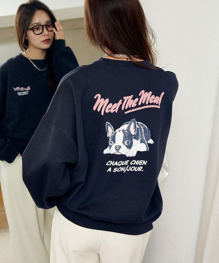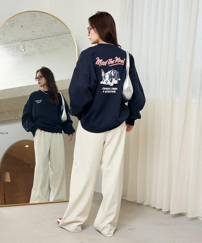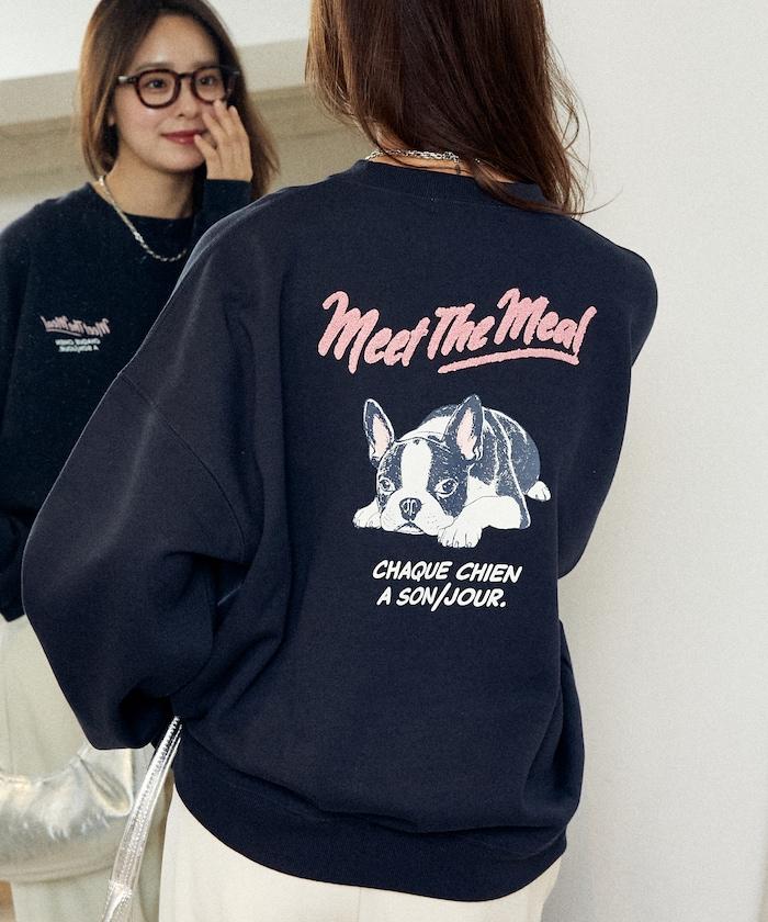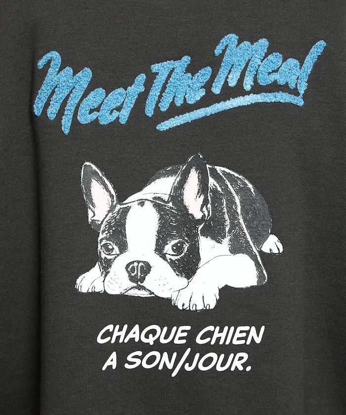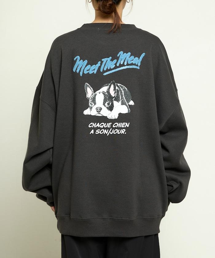 這款圓領運動衫的設計令人印象深刻,背部的法國鬥牛犬動物印花與相良刺繡的英文字母相結合。