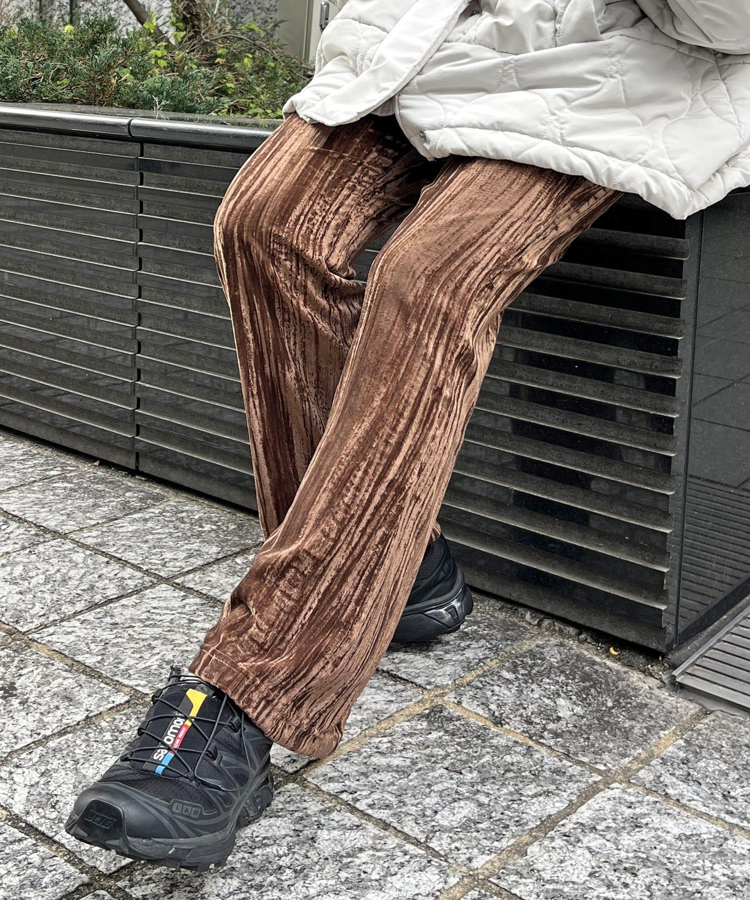 採用時下流行的碎絲絨面料,使褲子看起來更有層次感,顏色也更隨意。