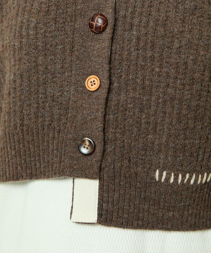 正面左右兩側的長度不同,還隨意裝飾了不同類型和大小的紐扣。