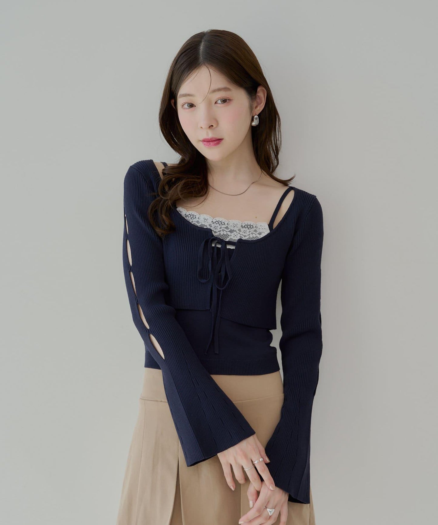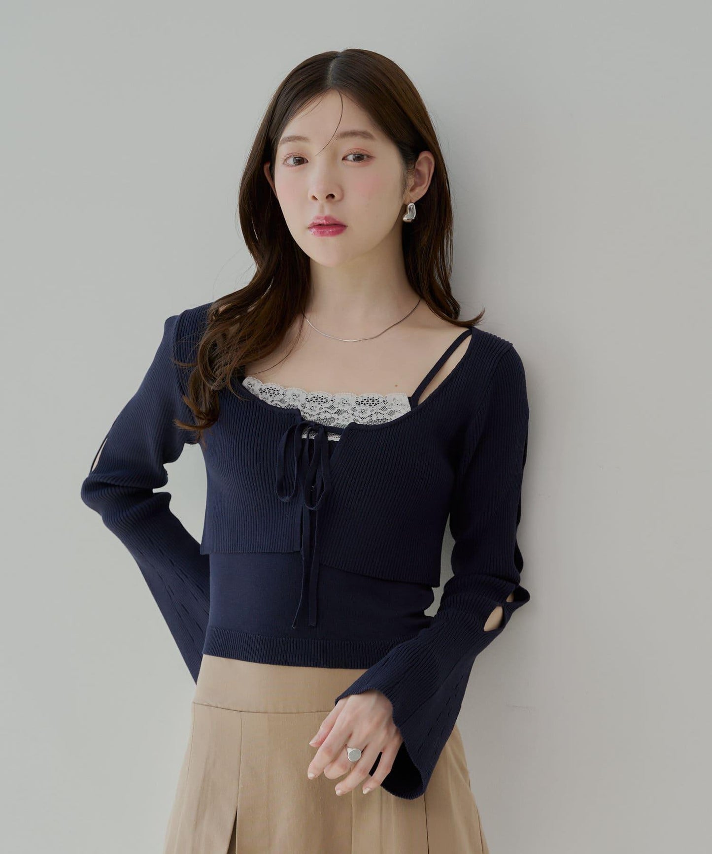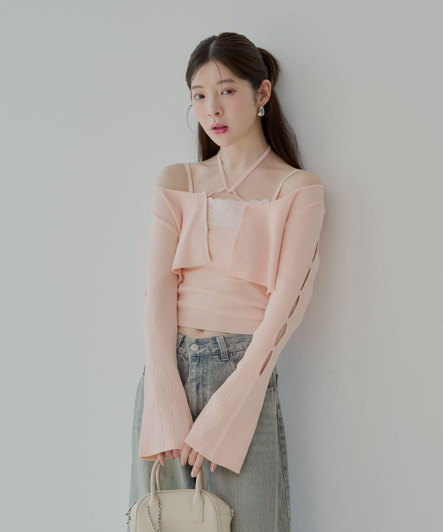 吊帶套頭開衫,恰到好處的露膚設計和精緻的蕾絲花邊。