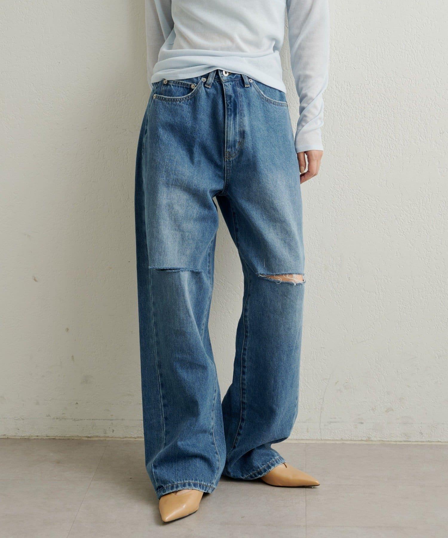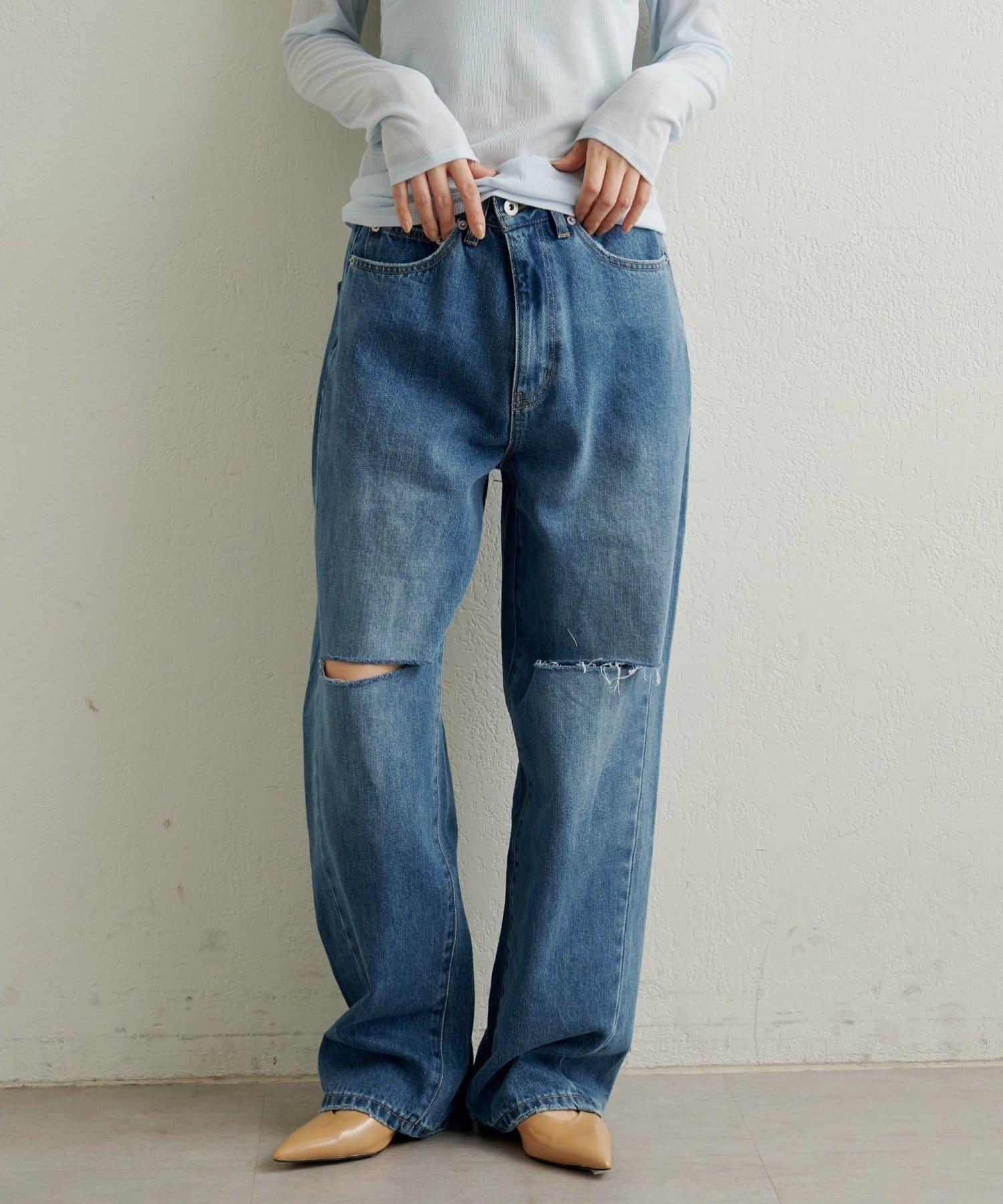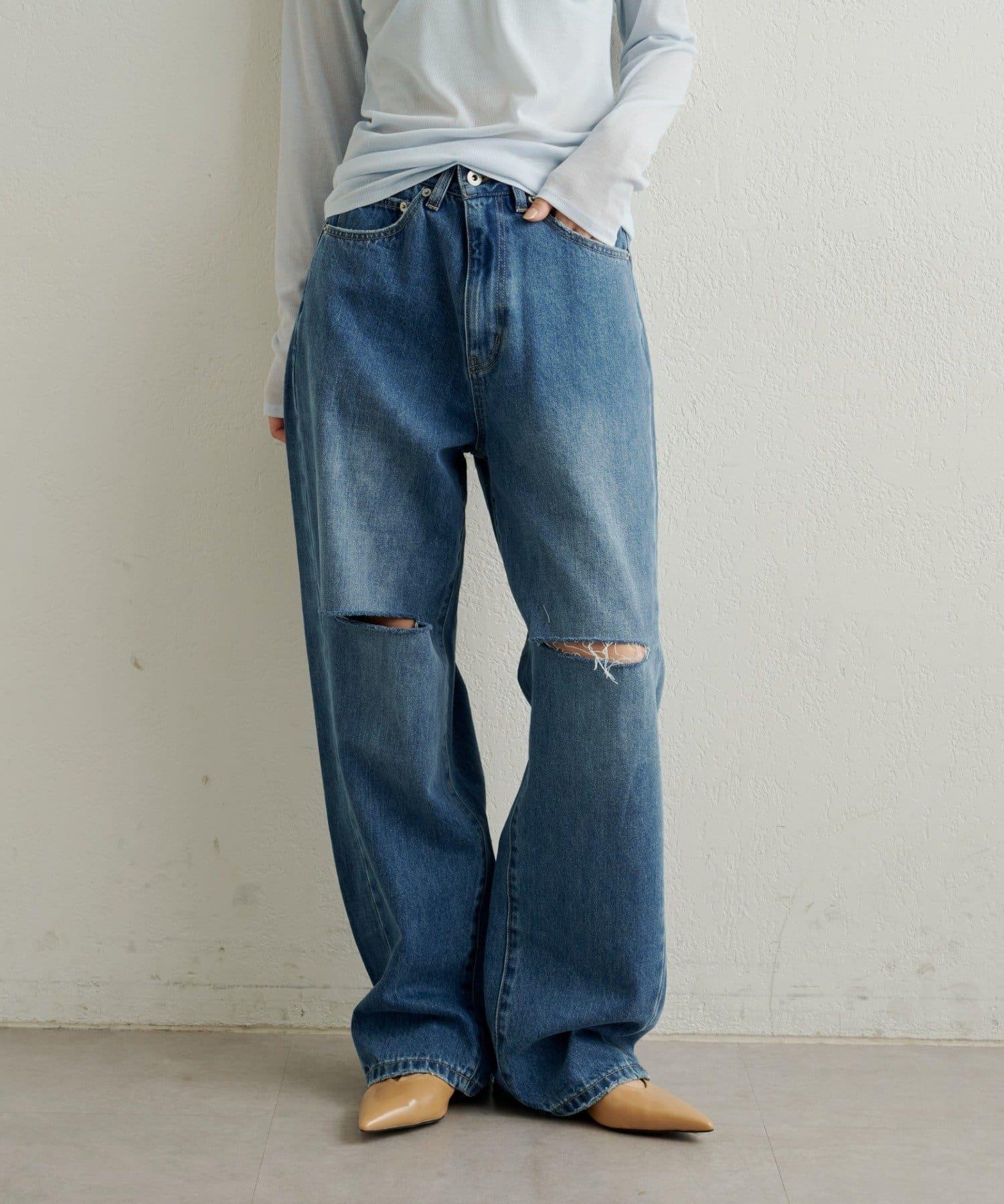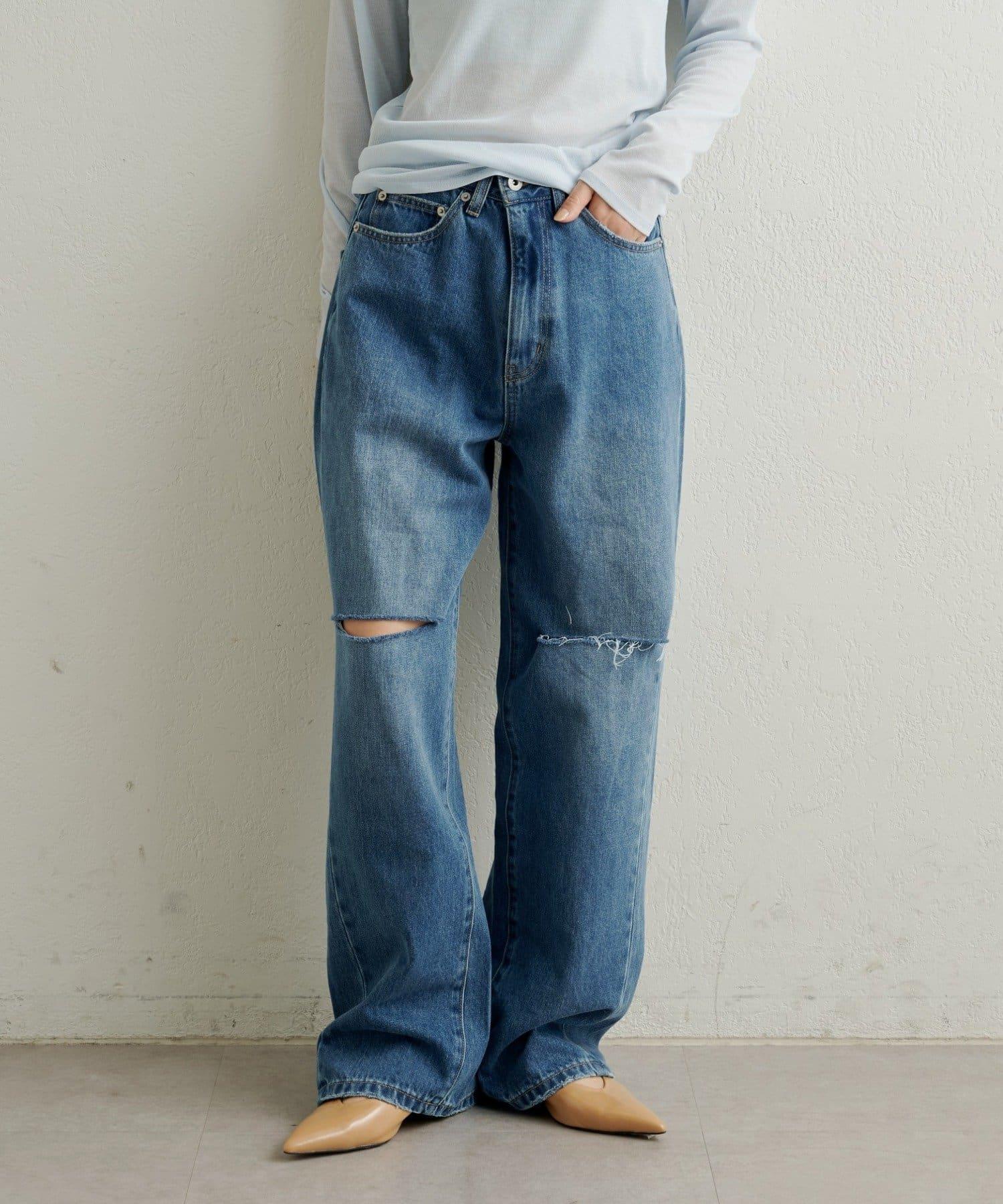 這款牛仔長褲非常適合成人休閒風格,膝蓋和下襬處的破損處理增添了俏皮感。
