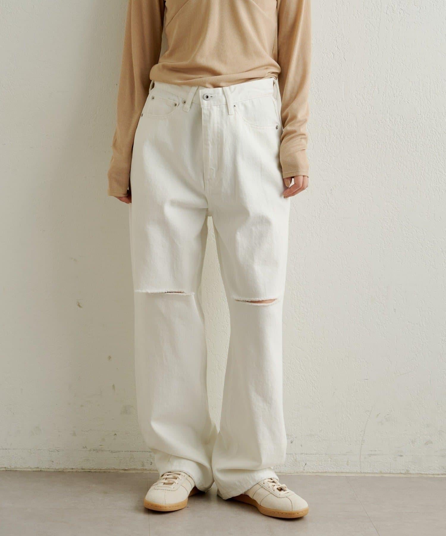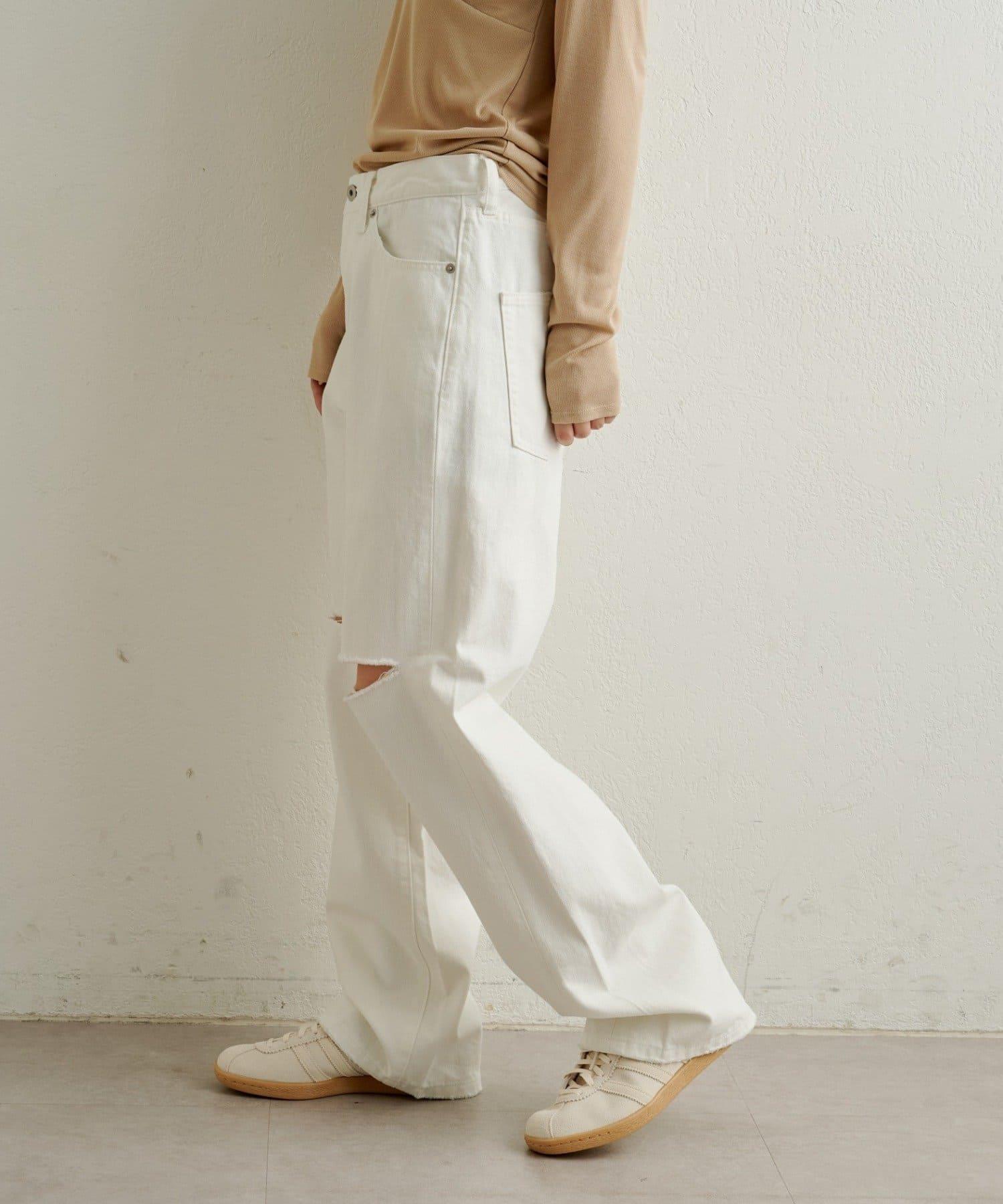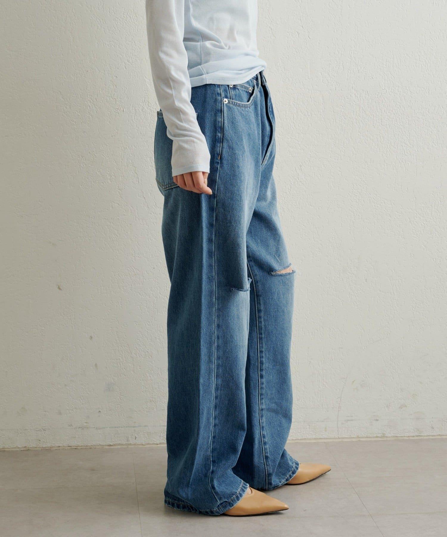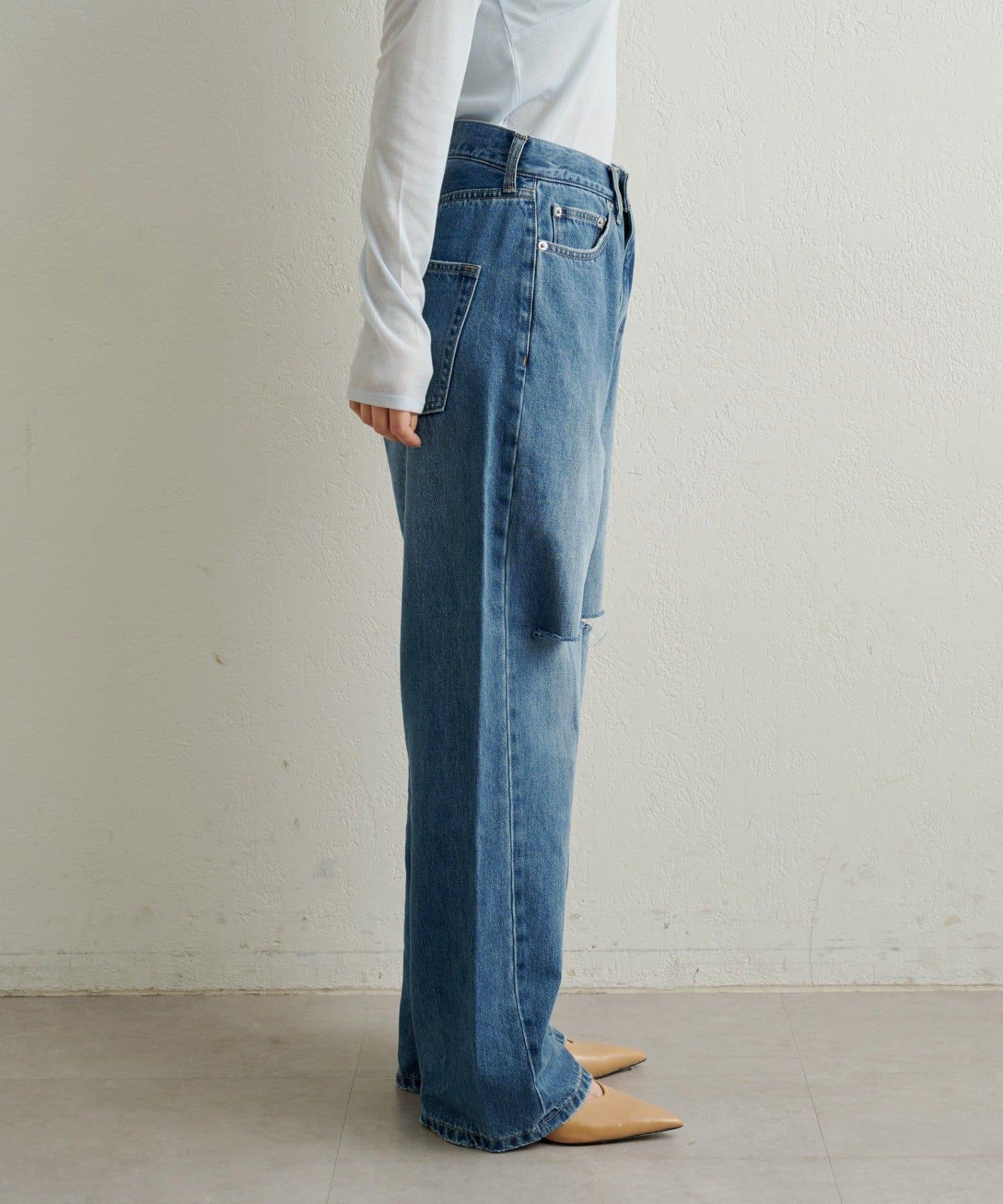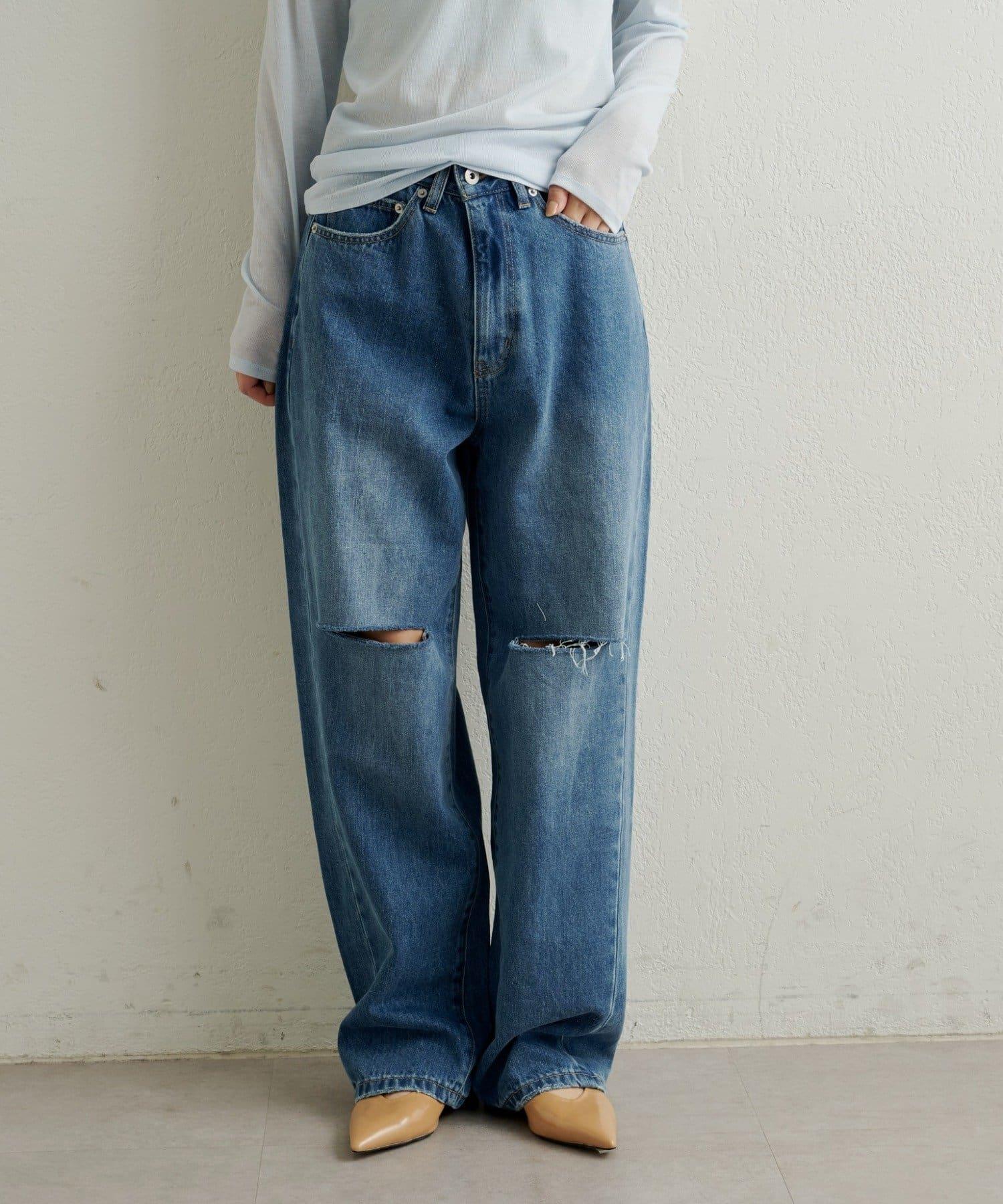 這款牛仔長褲非常適合成人休閒風格,膝蓋和下襬處的破損處理增添了俏皮感。