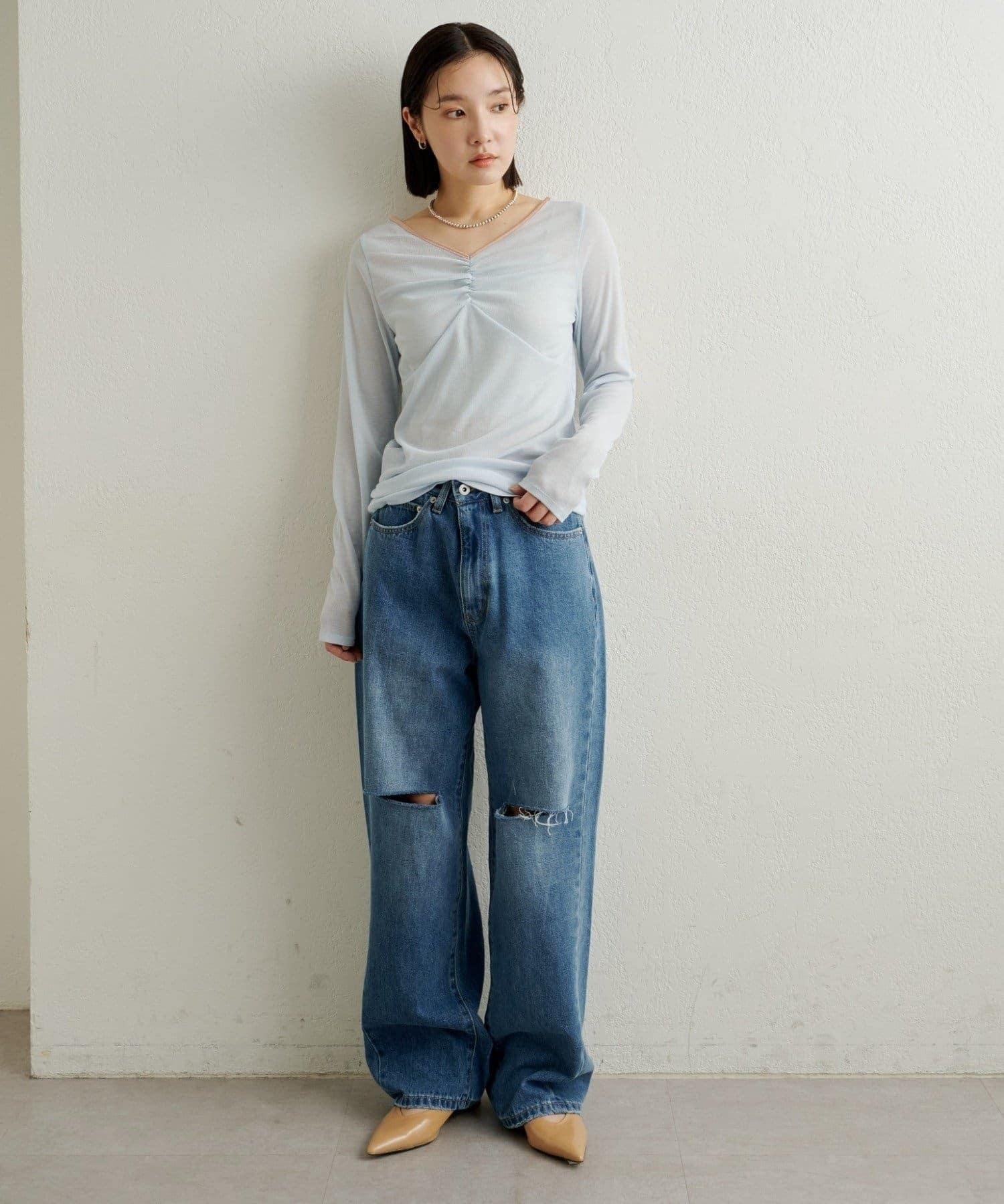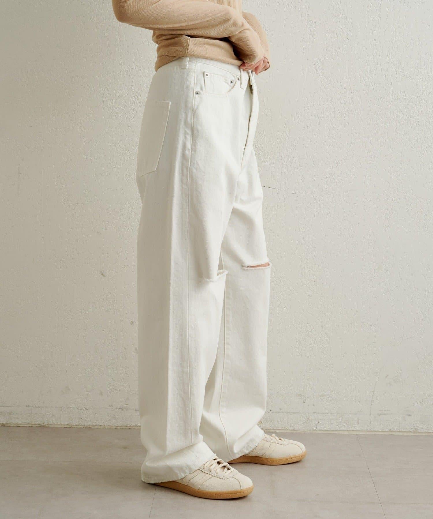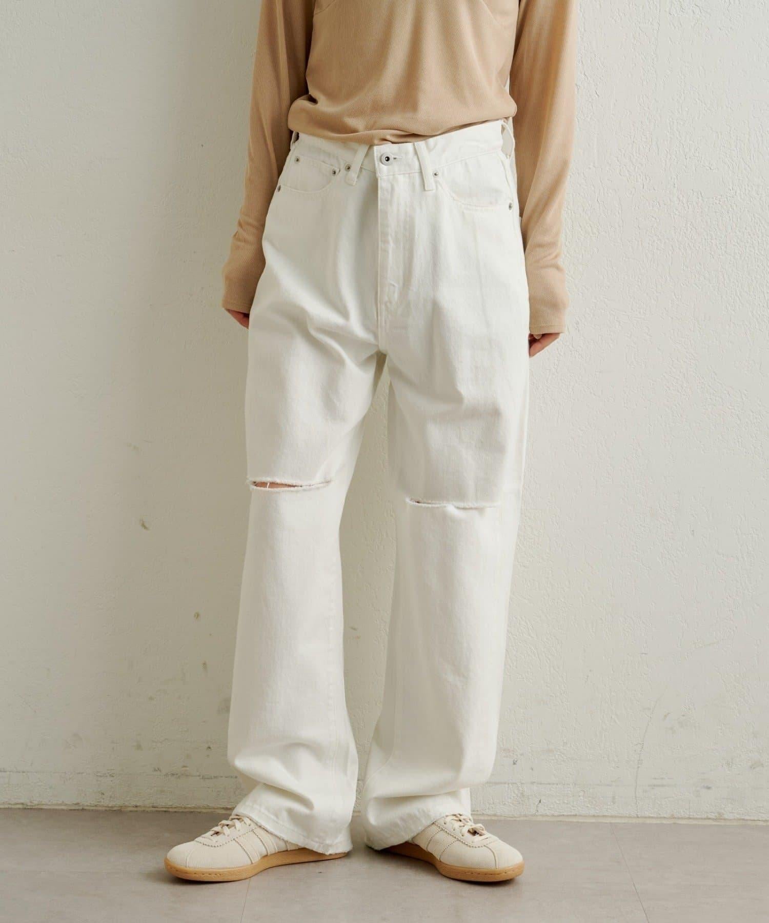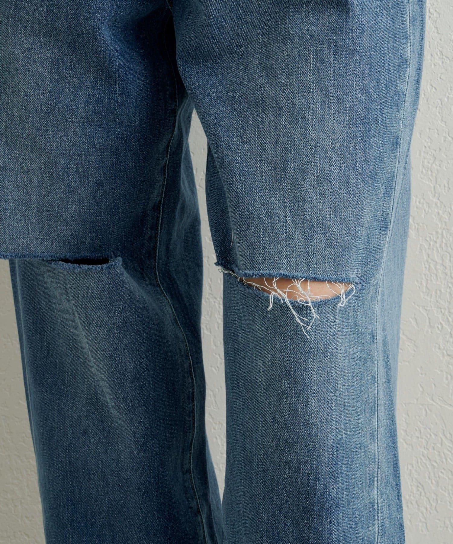 這款牛仔長褲非常適合成人休閒風格,膝蓋和下襬處的破損處理增添了俏皮感。