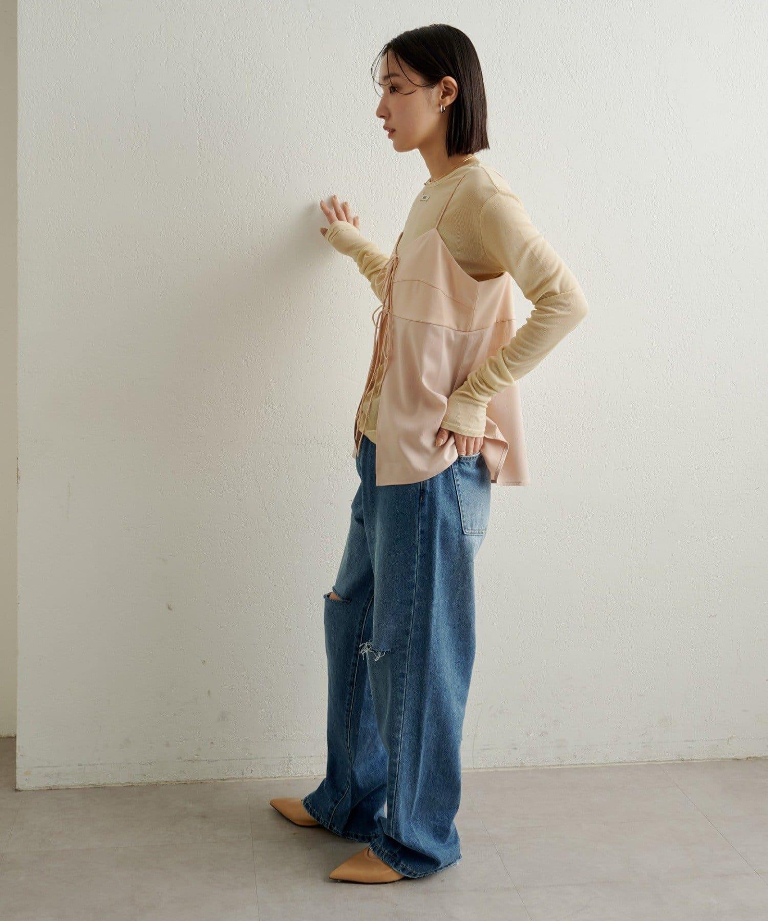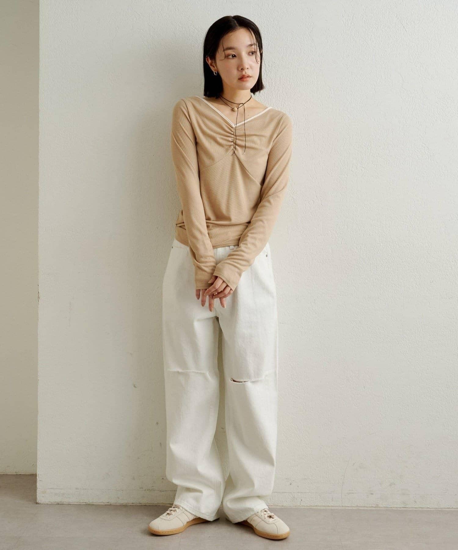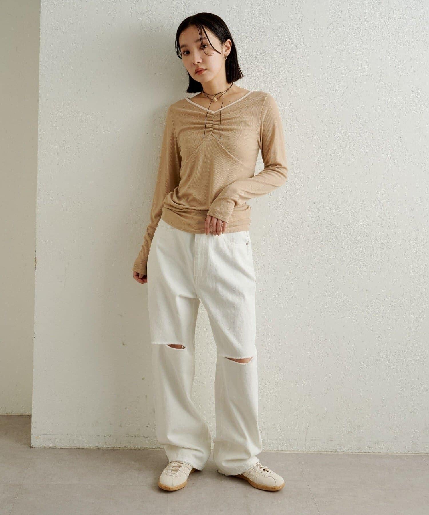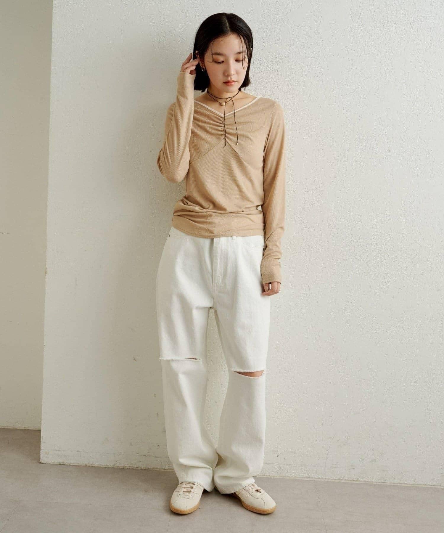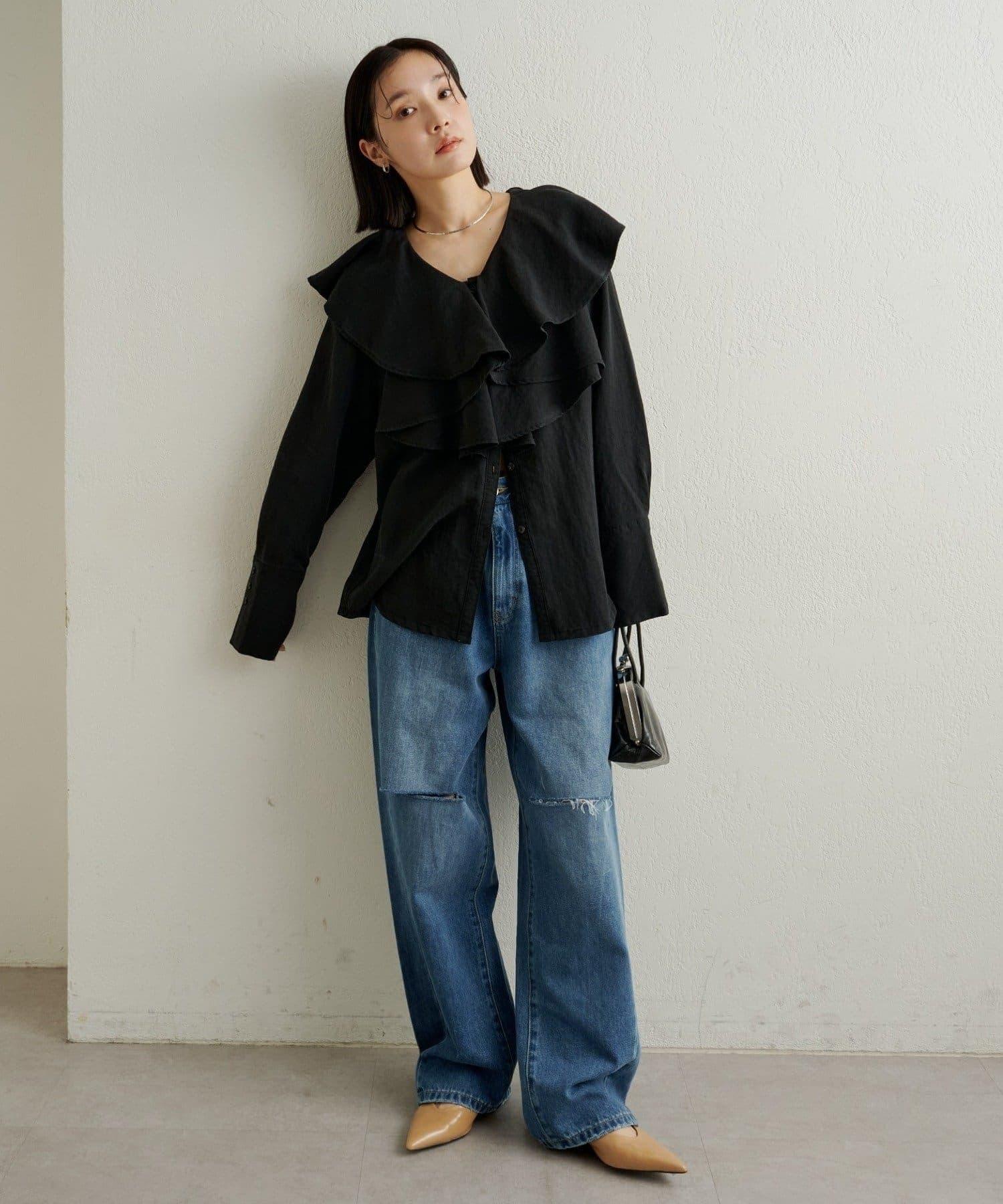 這款牛仔長褲非常適合成人休閒風格,膝蓋和下襬處的破損處理增添了俏皮感。