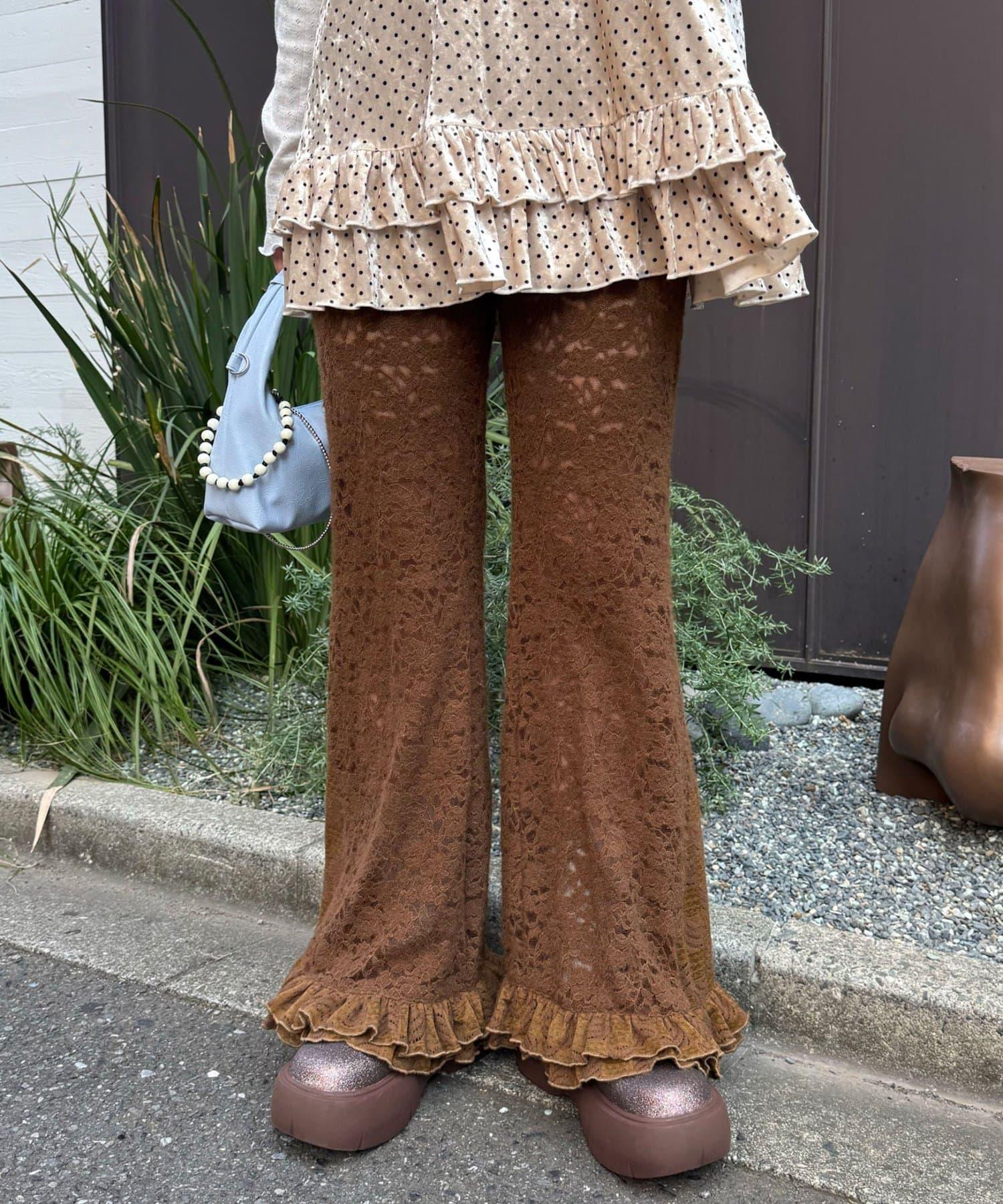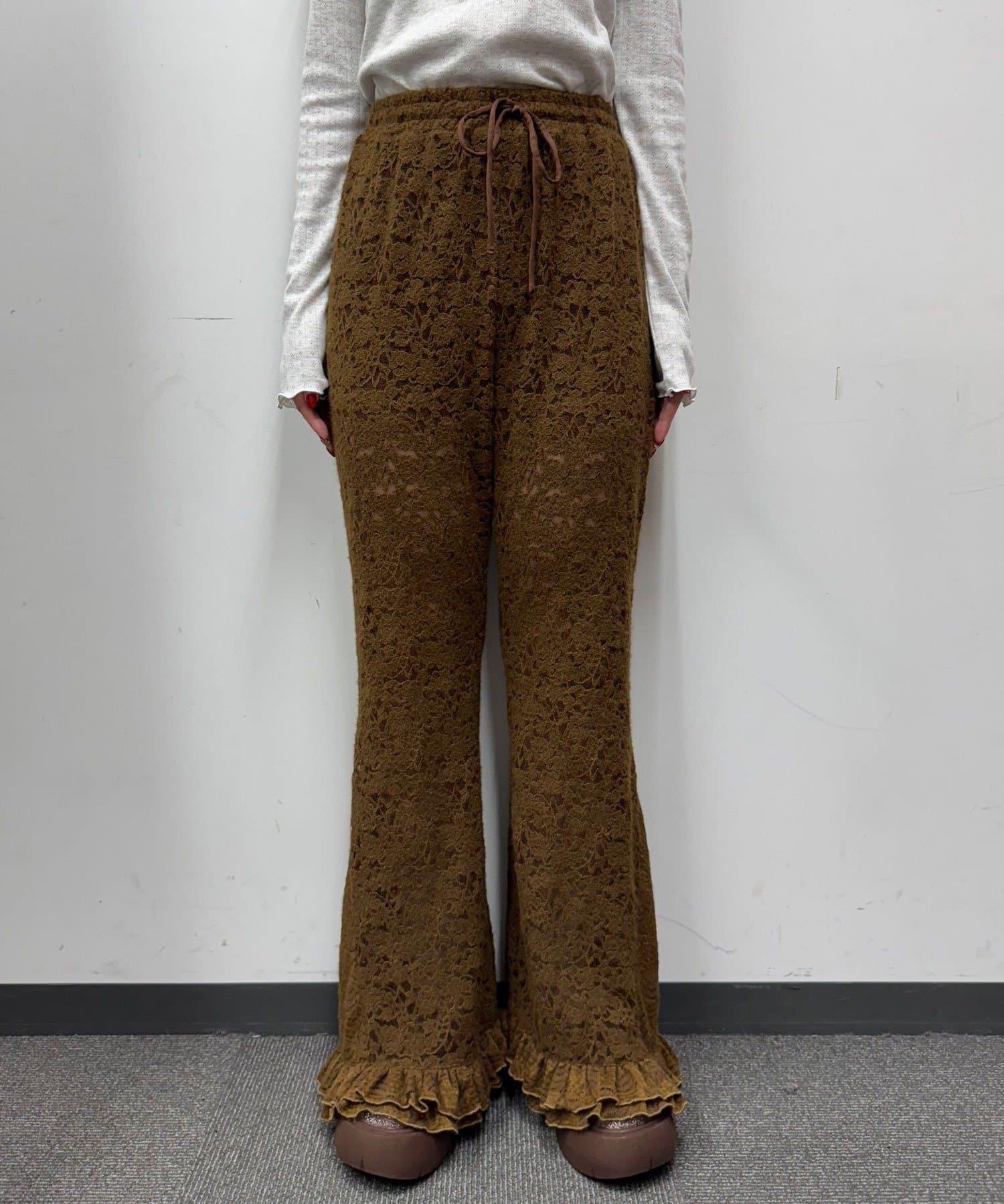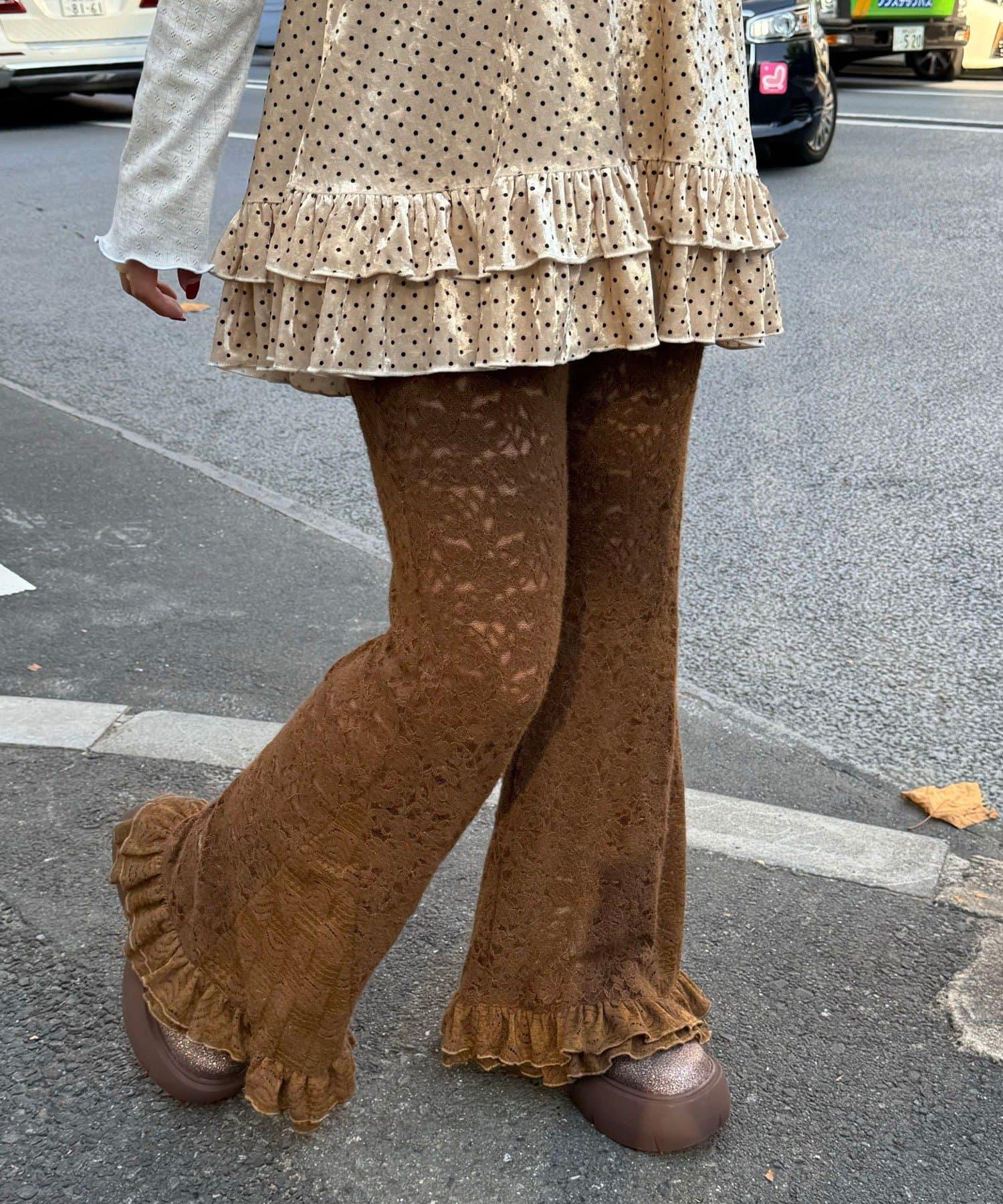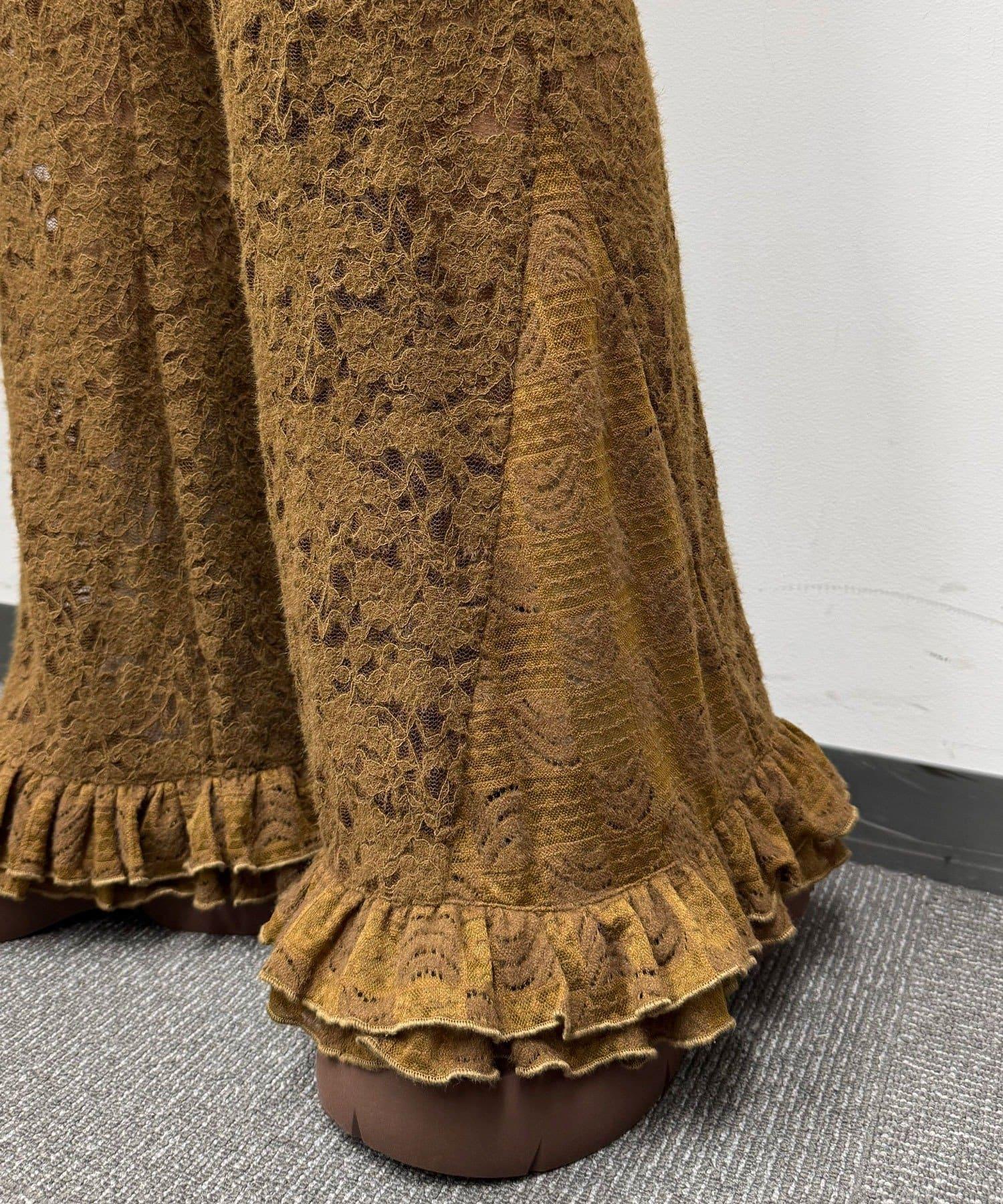 磨毛蕾絲拼接荷葉邊闊腿褲