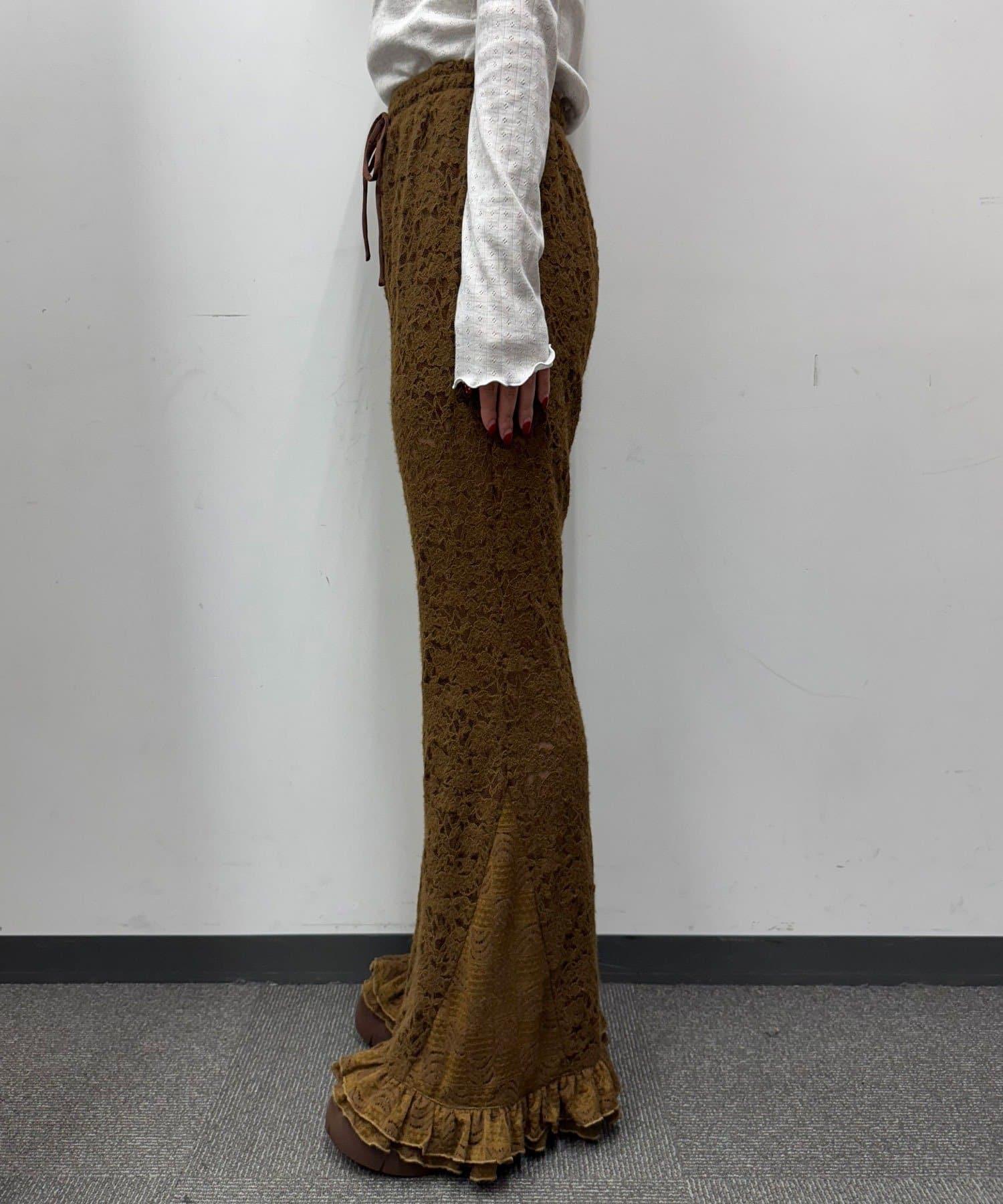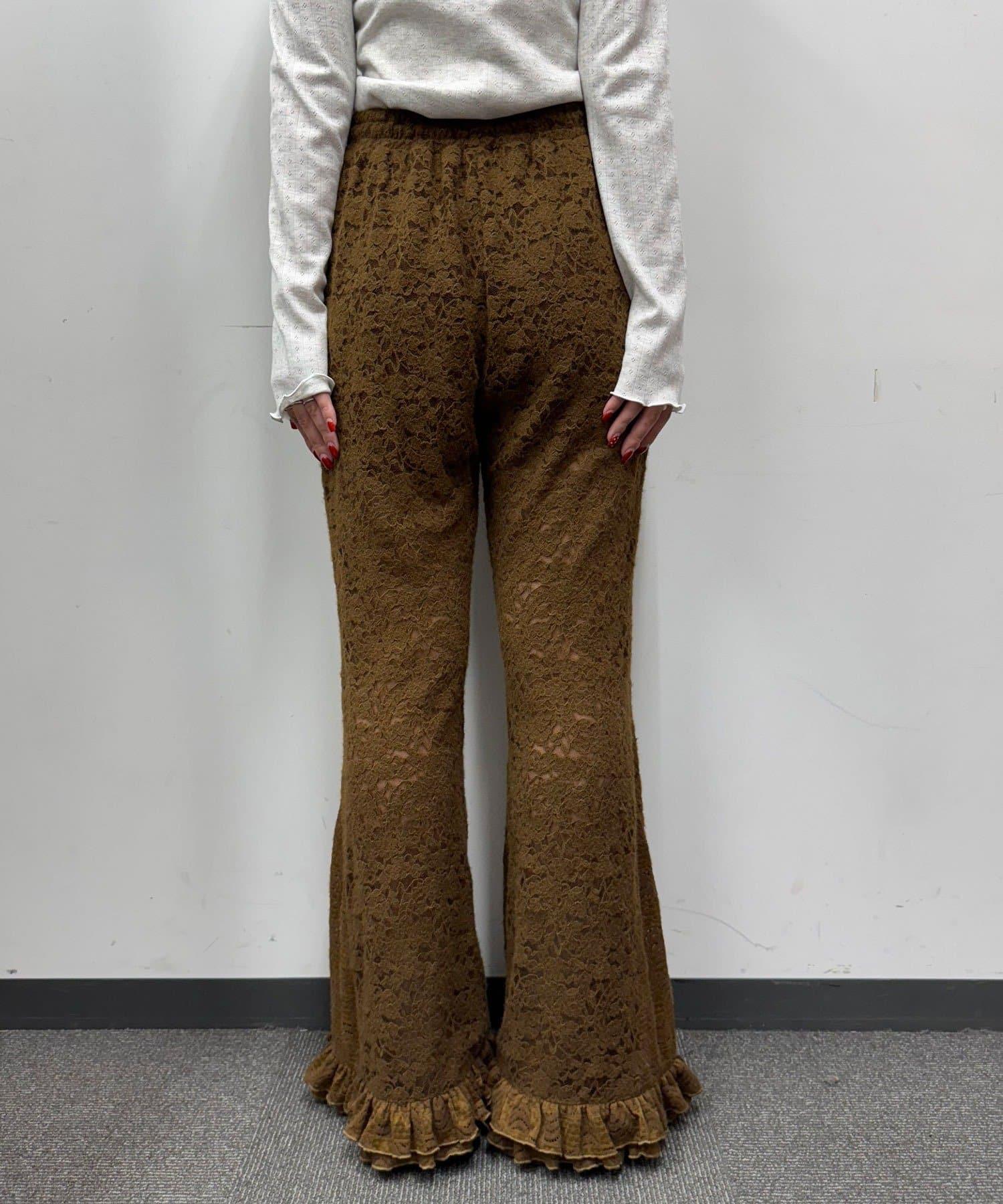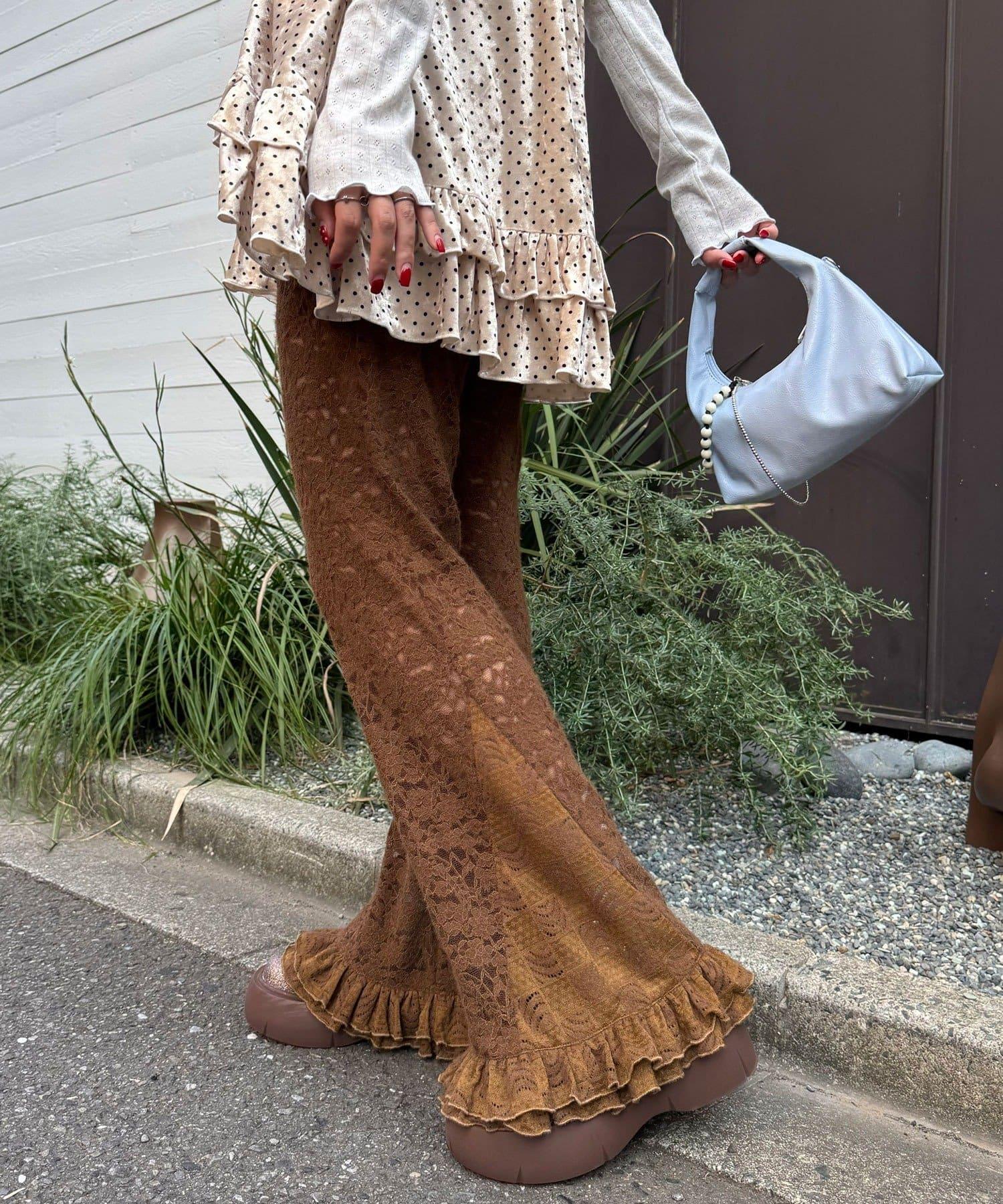 磨毛蕾絲拼接荷葉邊闊腿褲