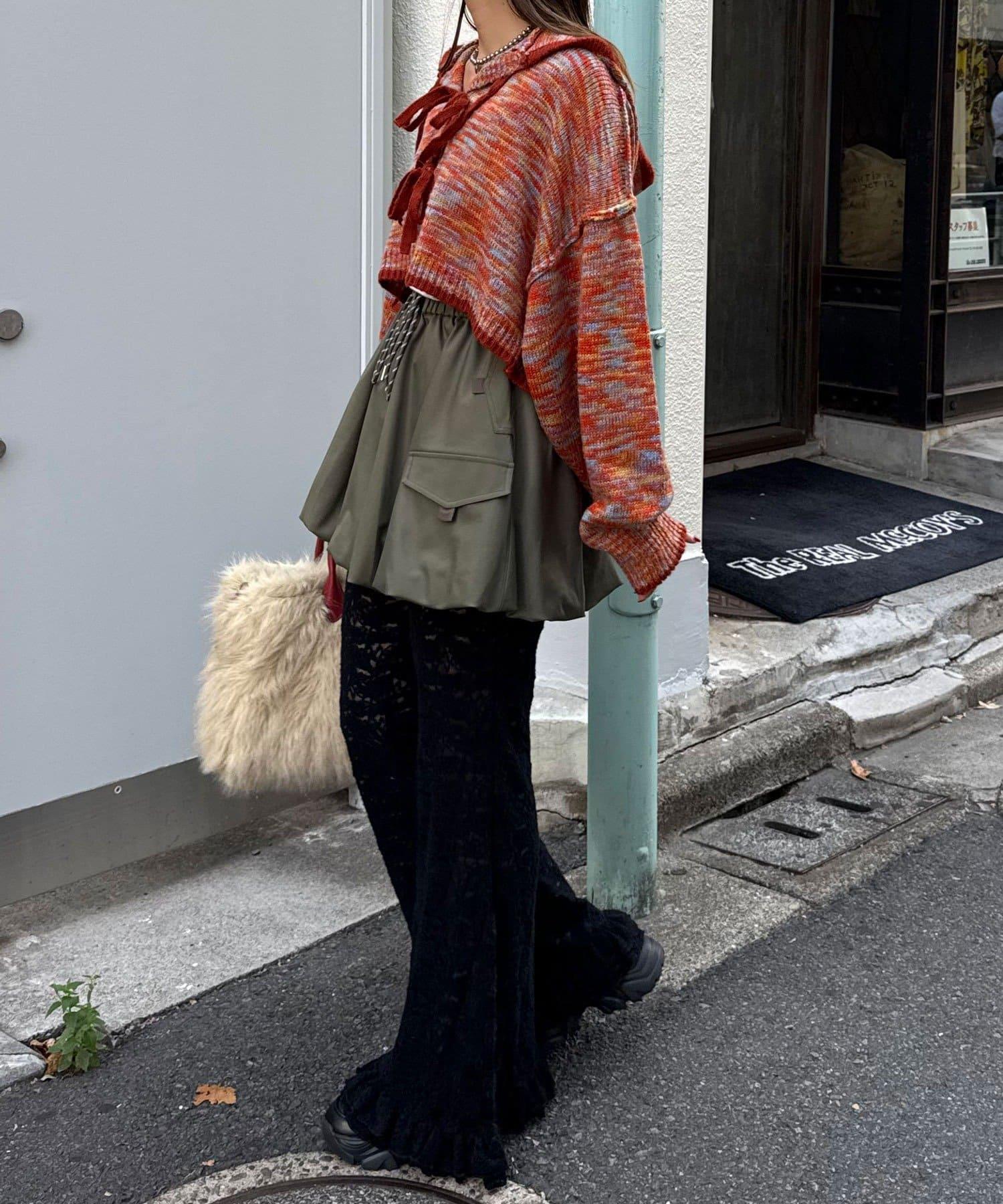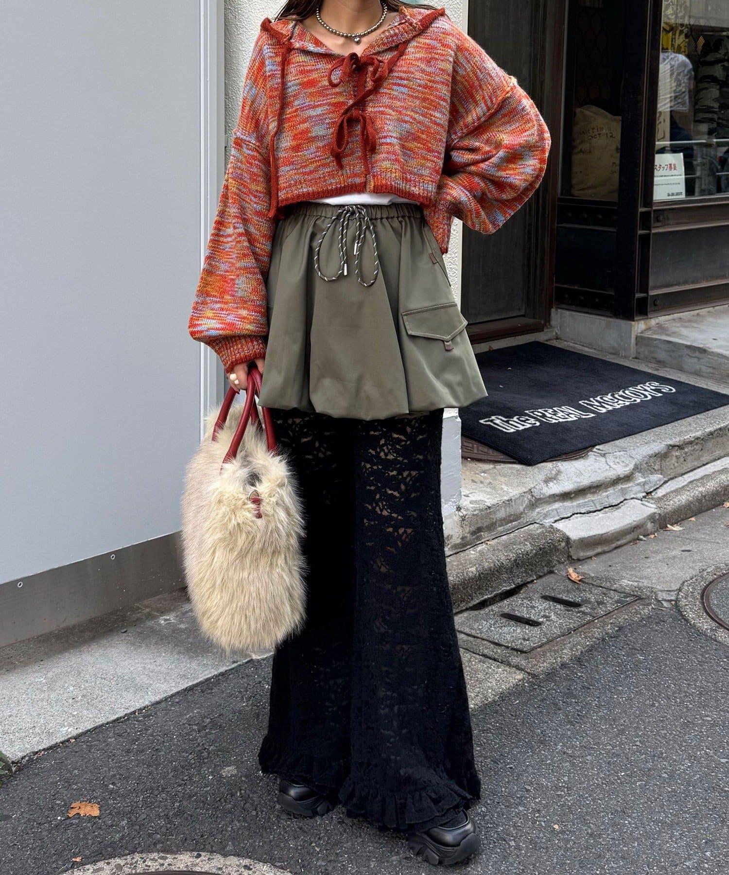 使用了精緻的蕾絲材料。如果在粗糙的表面上摩擦,或被包、皮帶或尖銳的物體夾住,蕾絲就很容易飄散,可能會被剪斷。請小心處理。