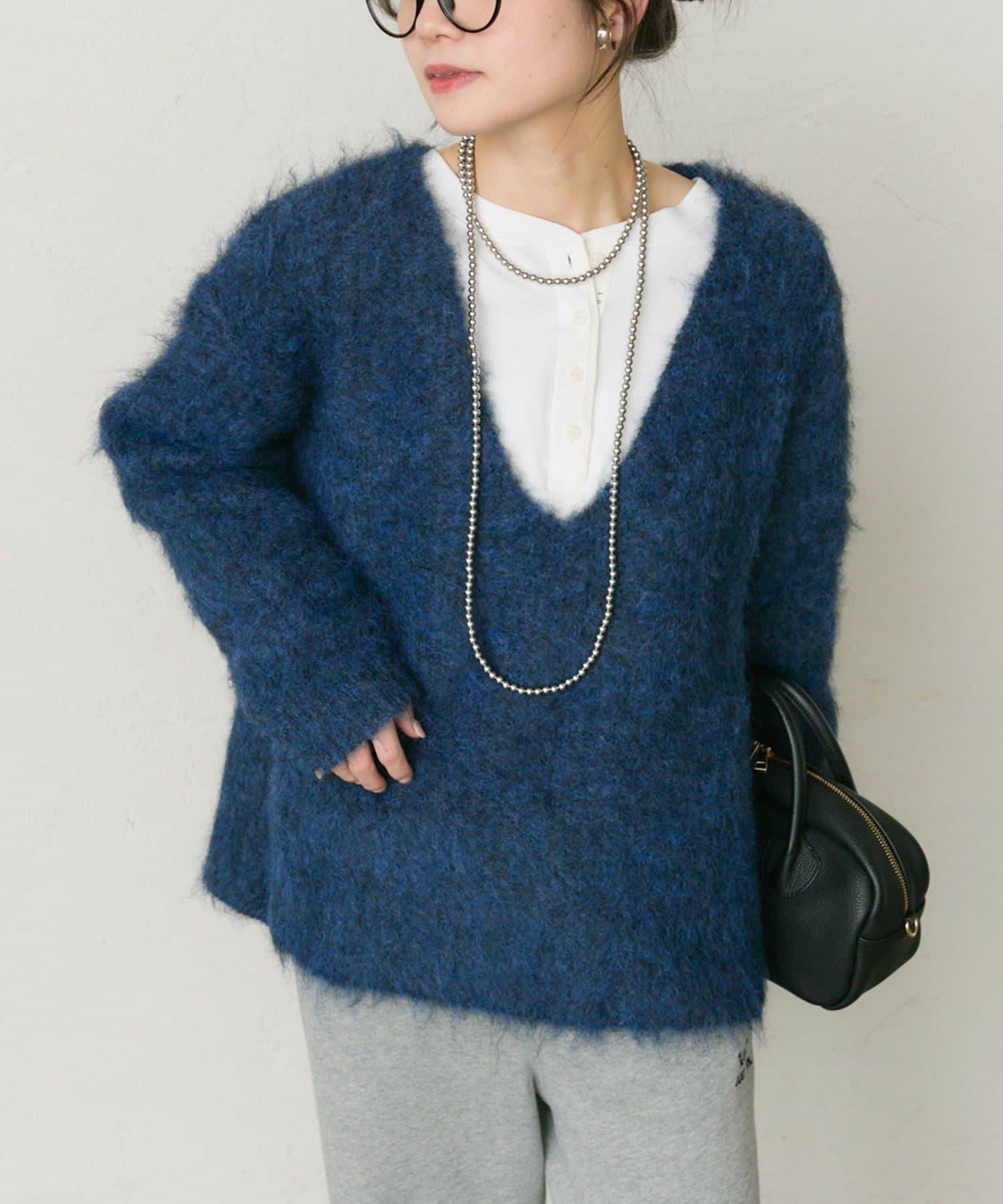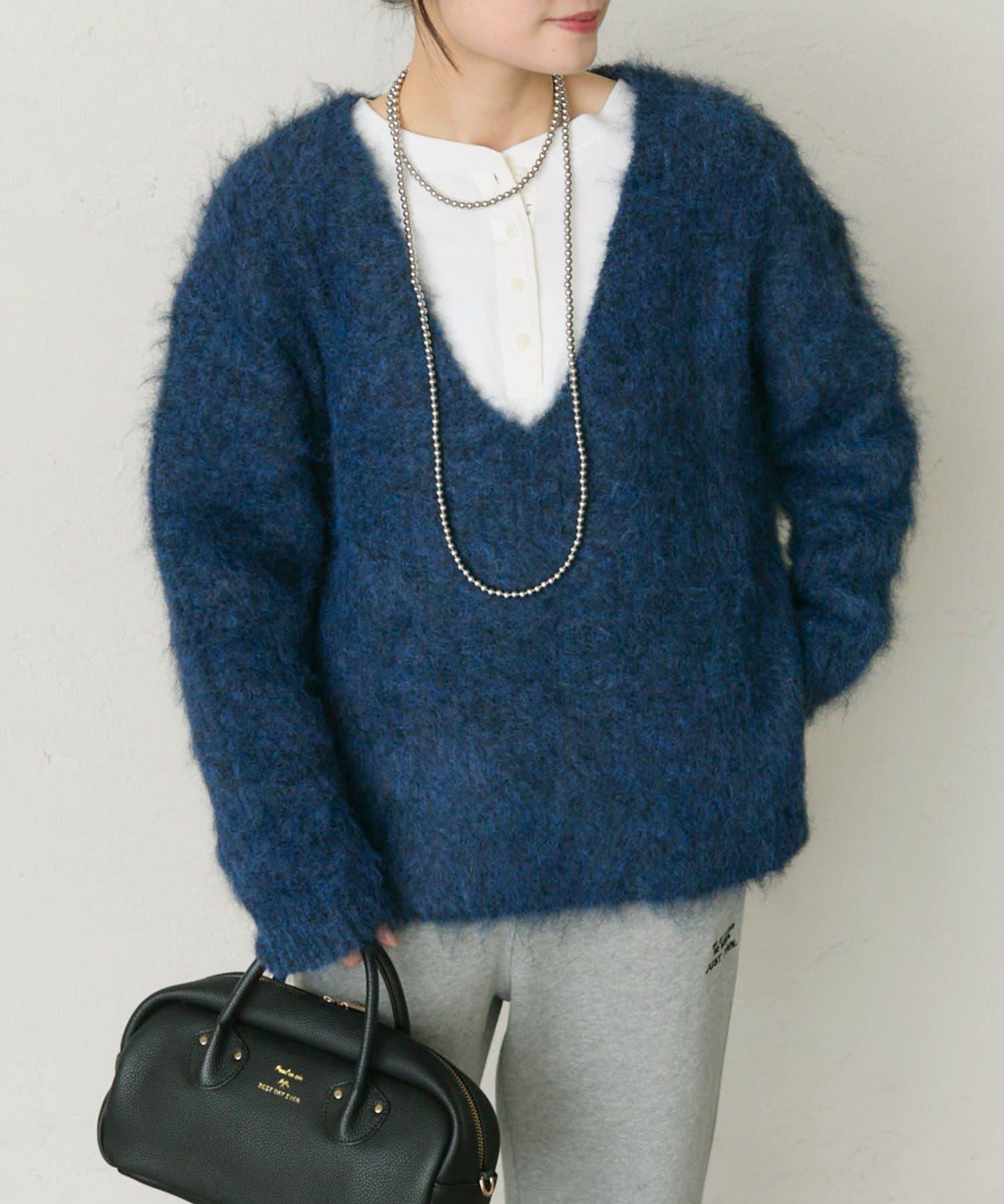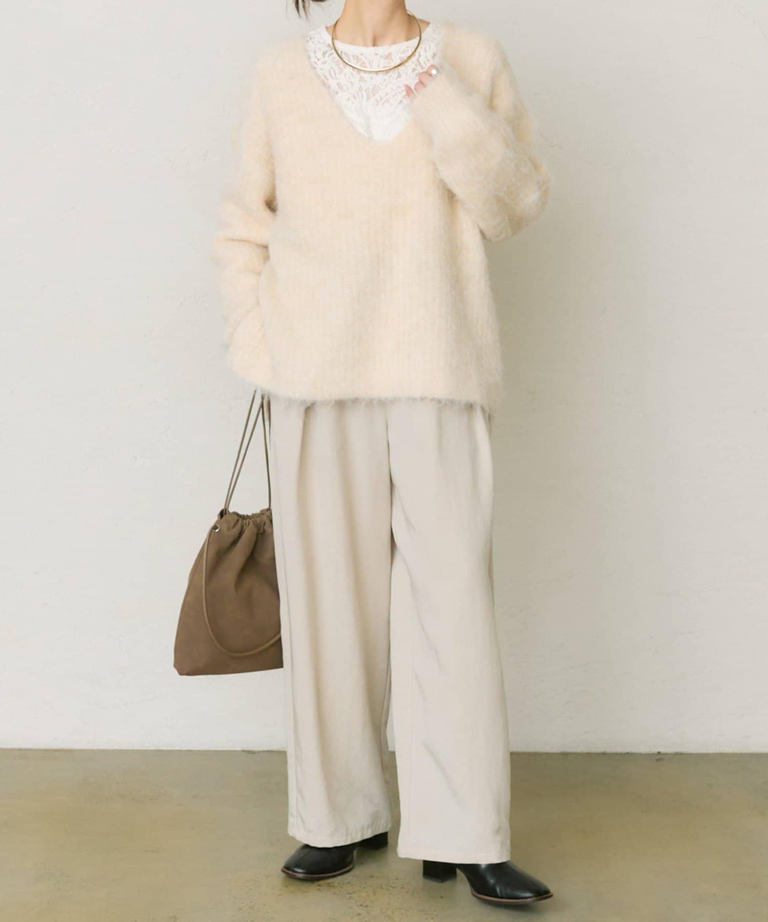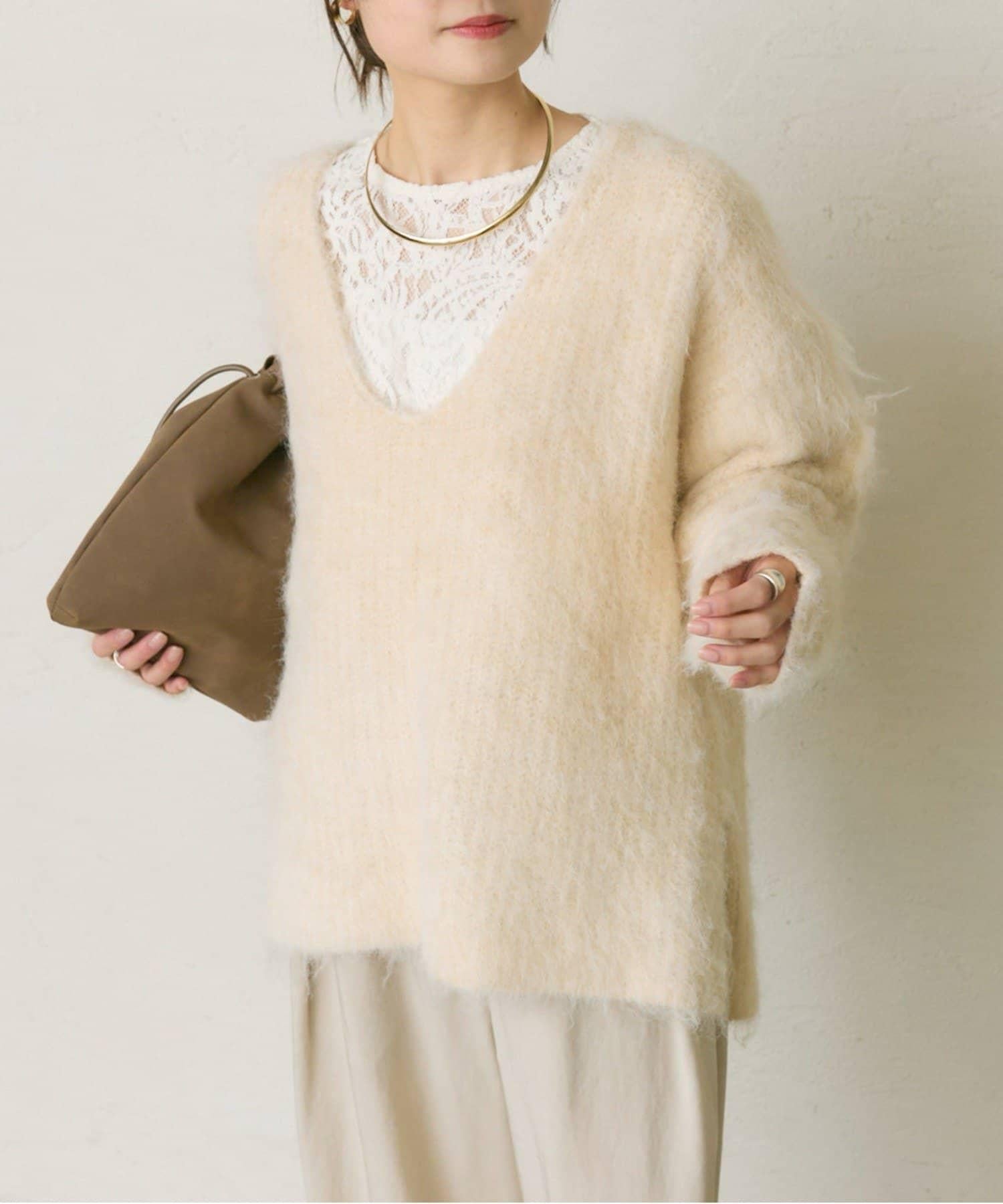 深而寬的 V 領給容易變得厚重的冬季造型帶來了自然的空間感、