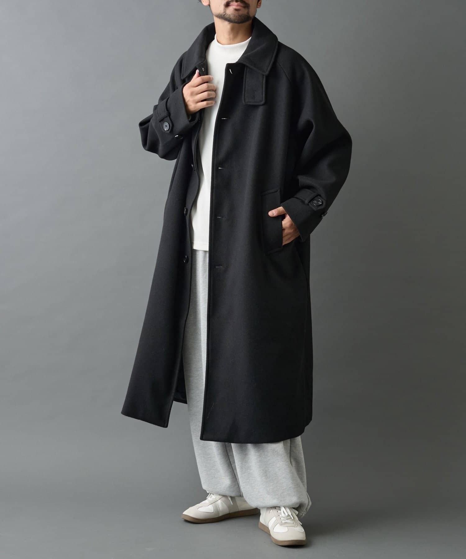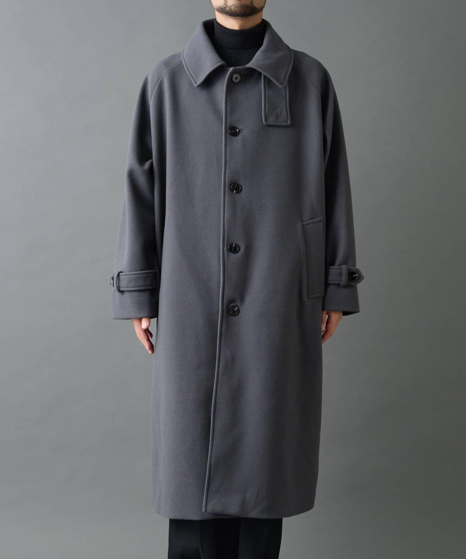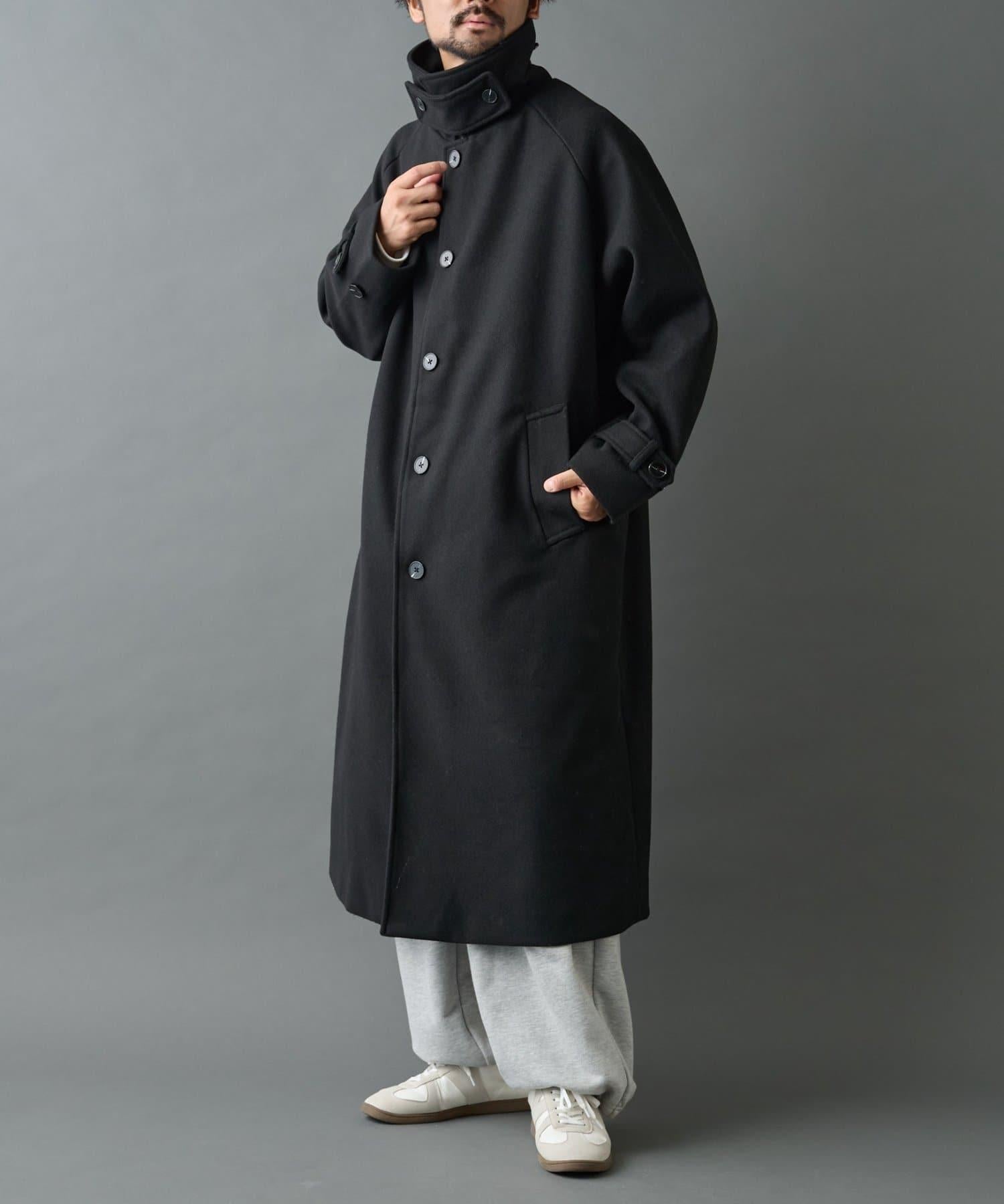 科技羊毛製成的不鏽鋼領長款外套,兼具古典外觀與現代功能。