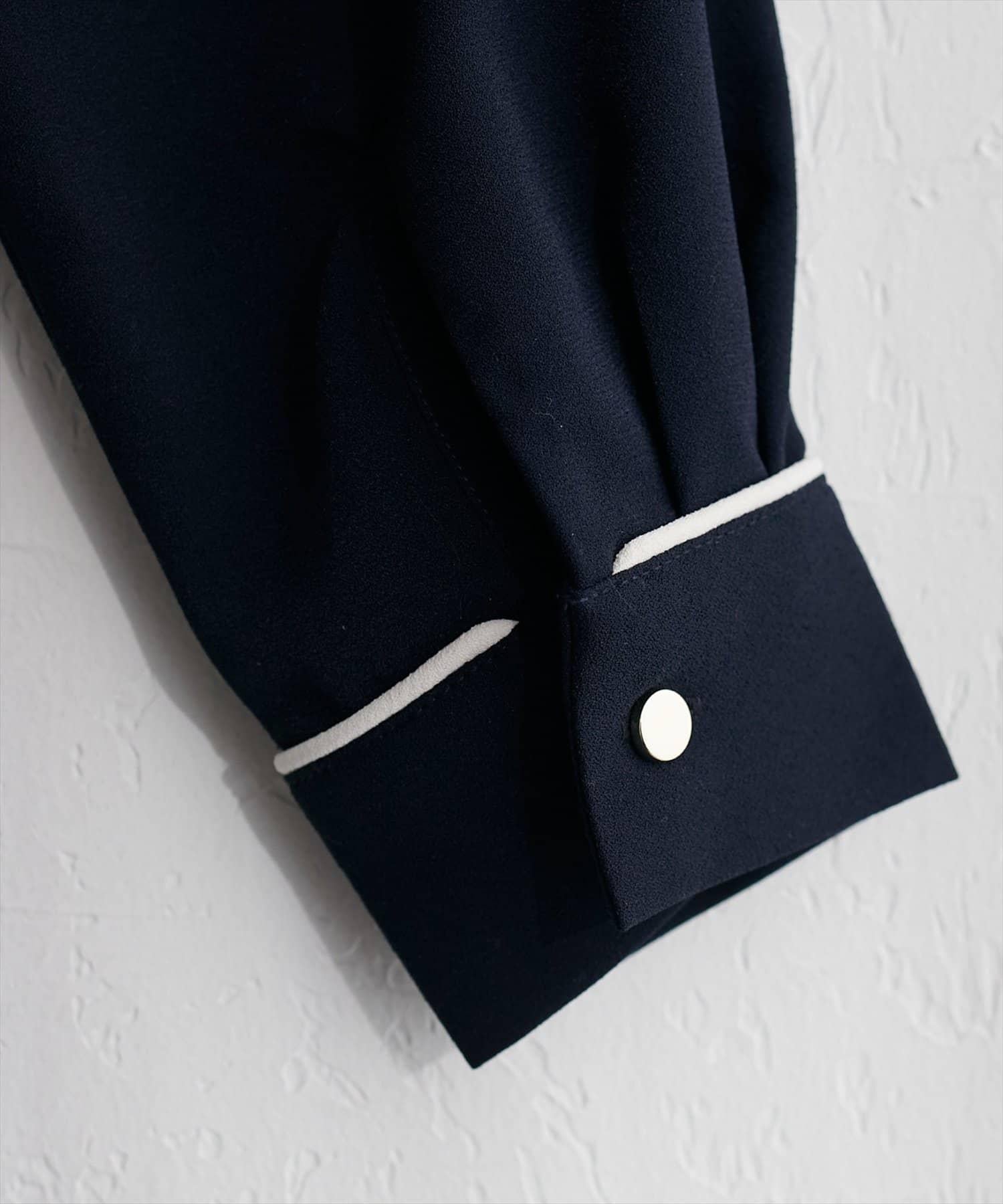 這款上衣採用精緻的立領設計,衣領和袖口處鑲有精緻的滾邊。