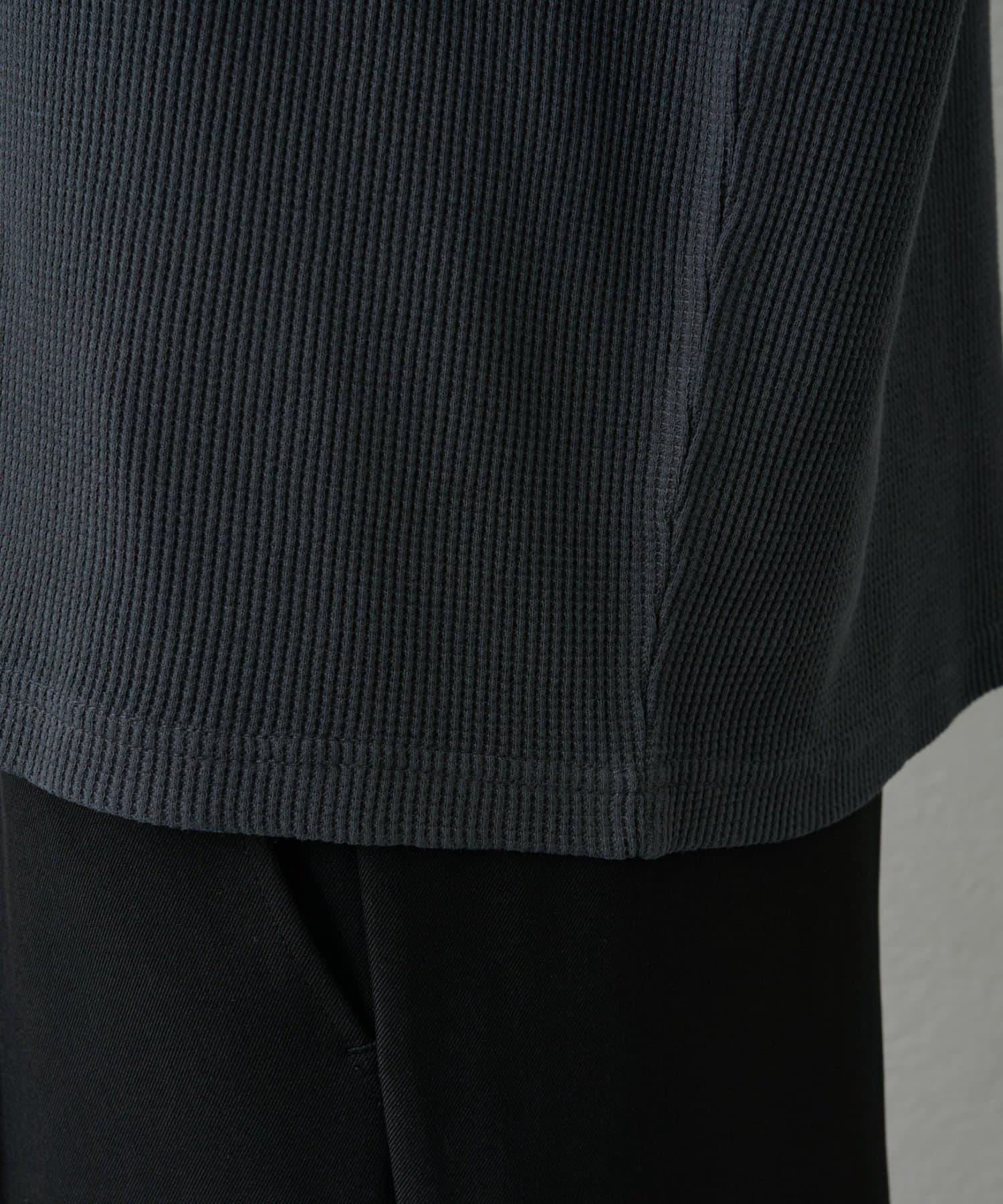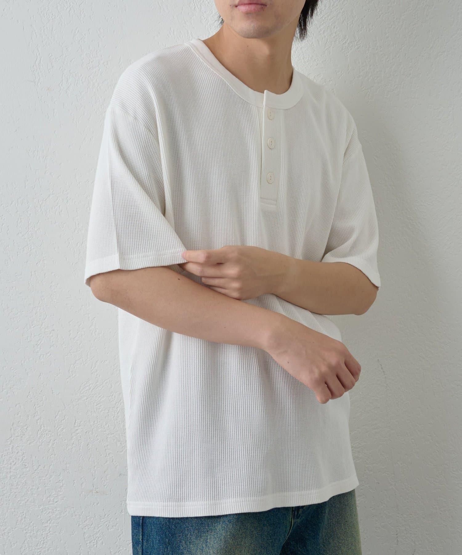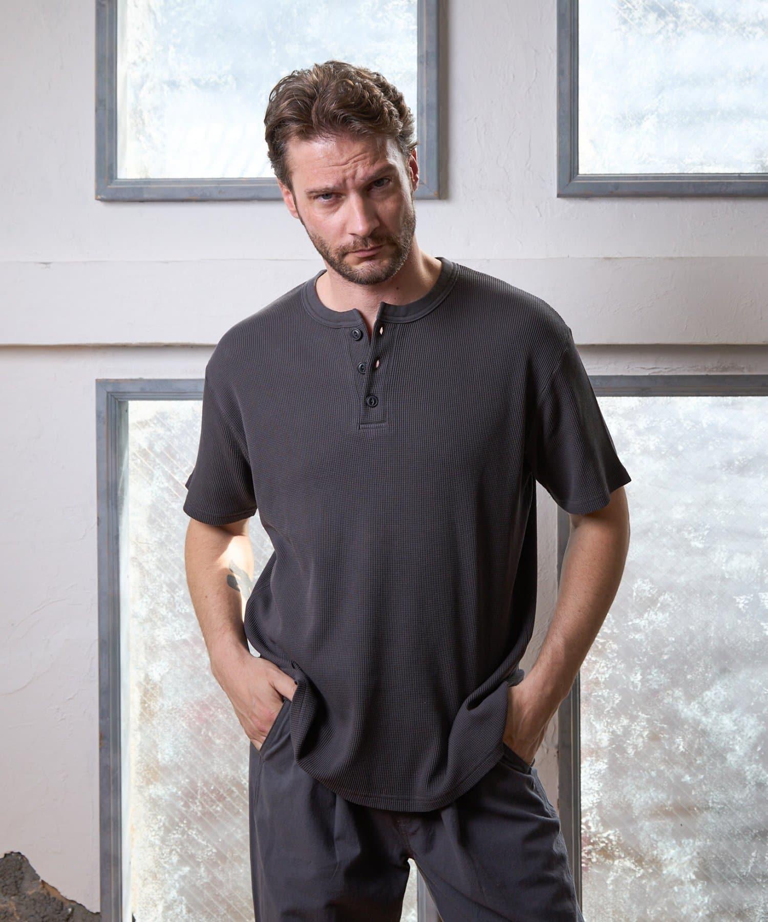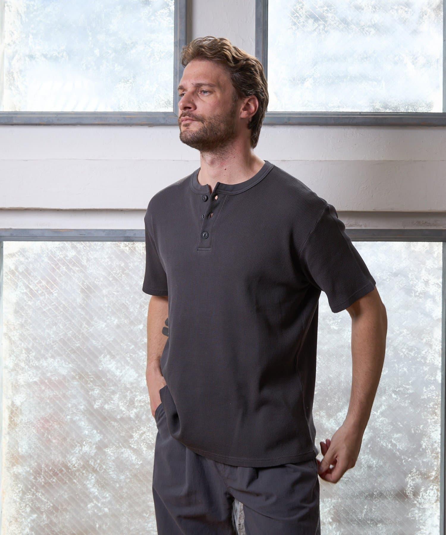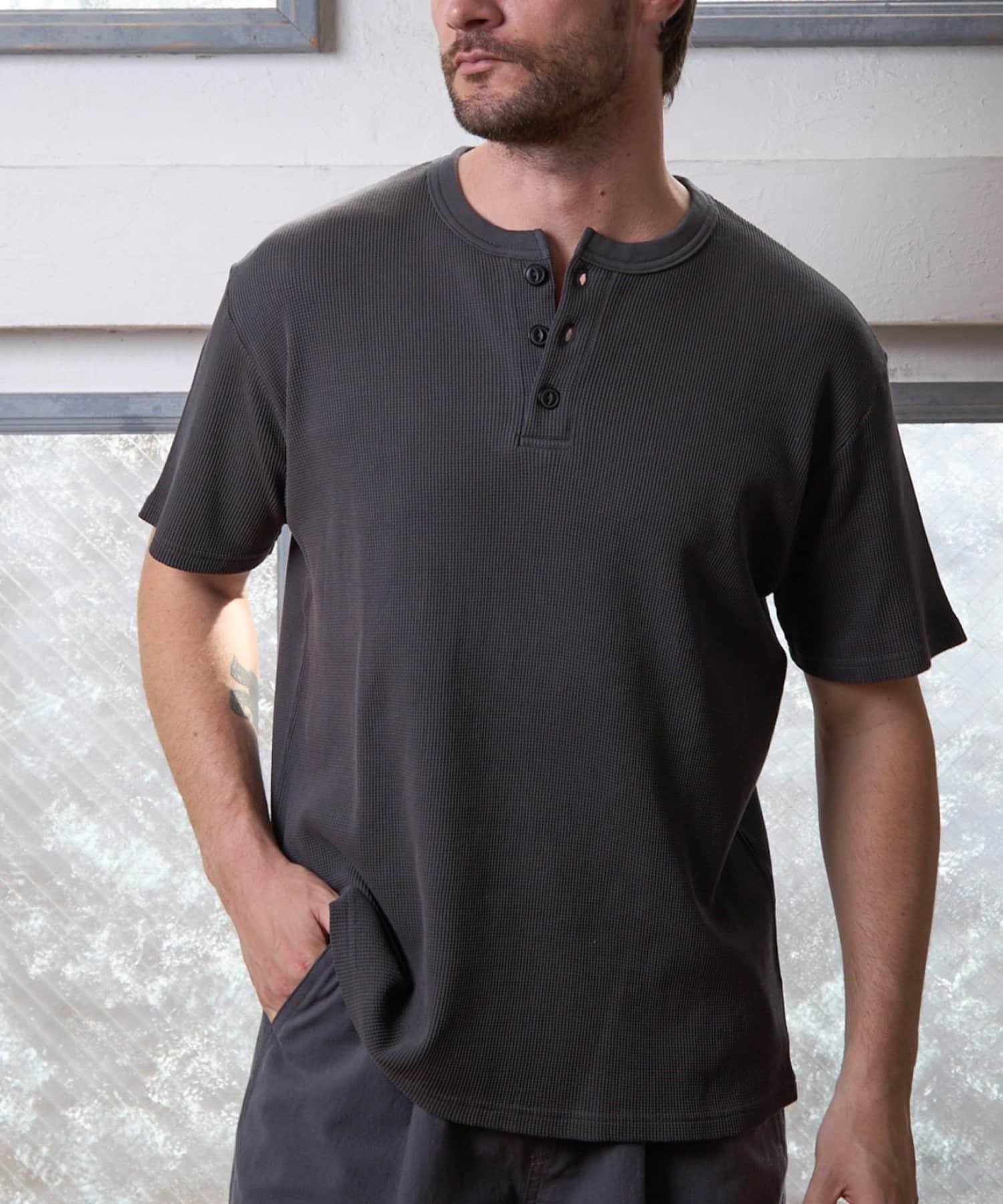 這款雞心領襯衫採用煤氣燒製的華夫格面料,領口處的紐扣簡潔而突出。