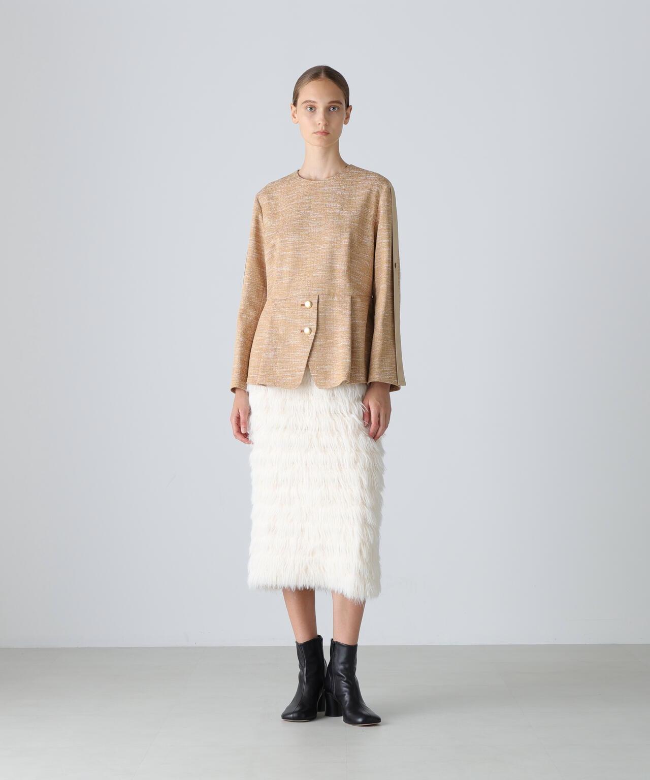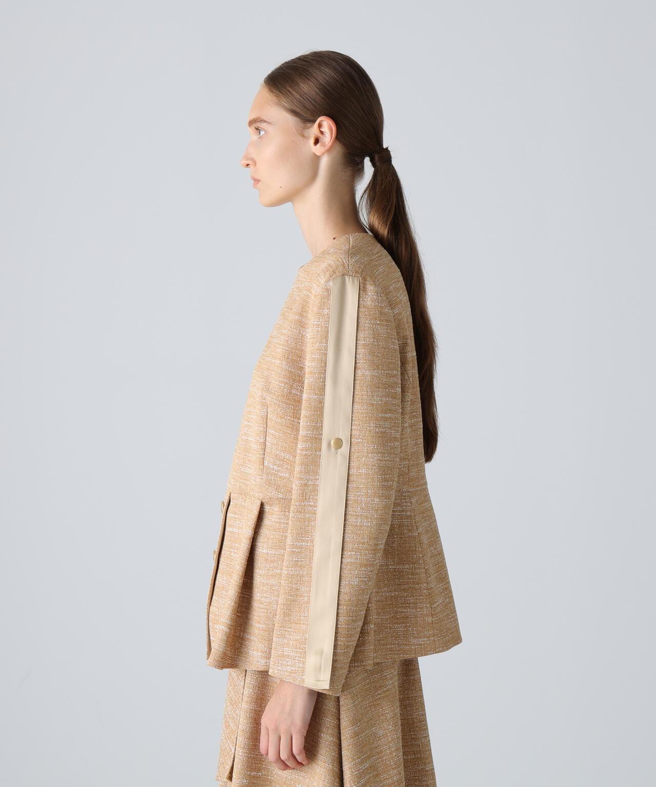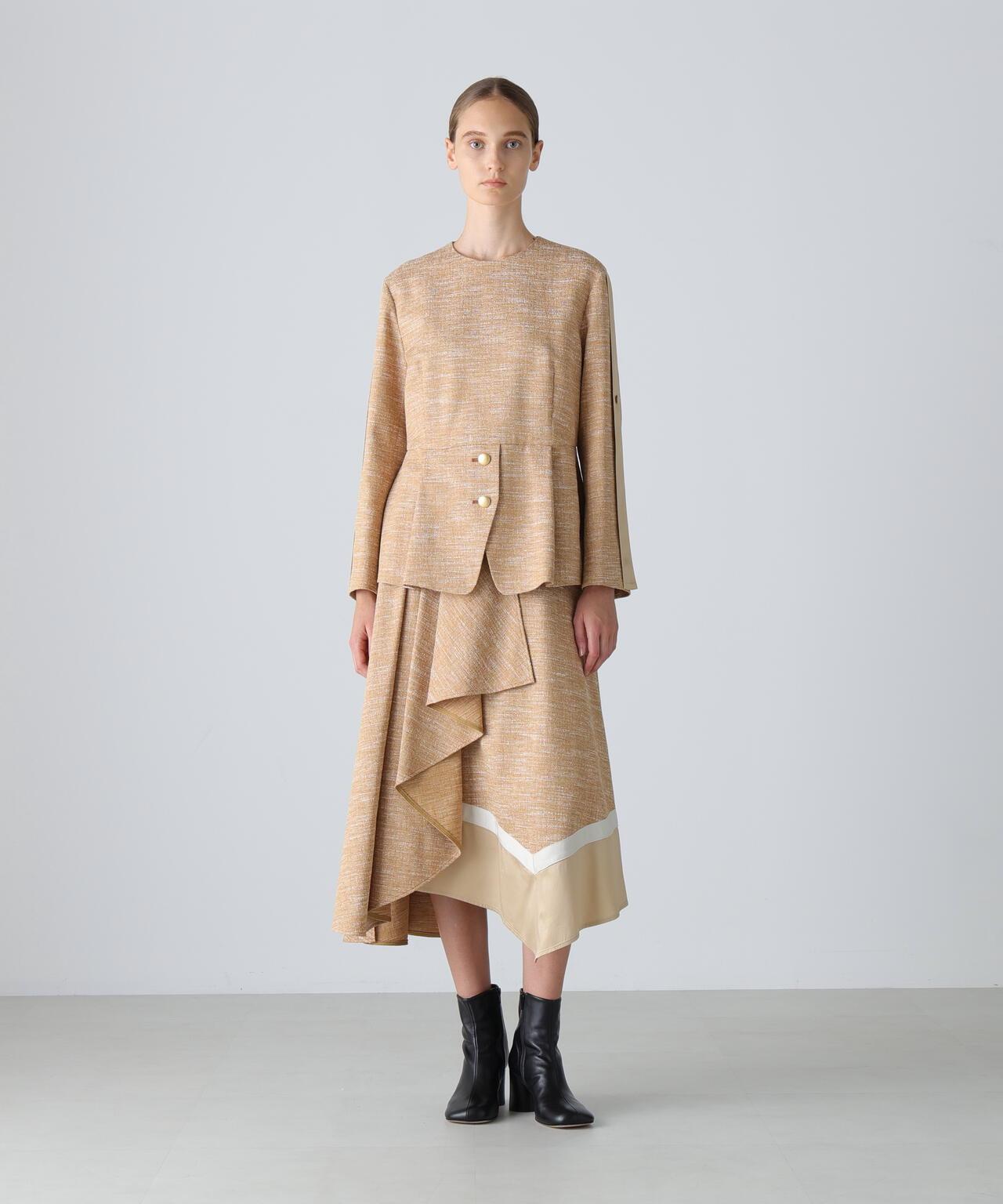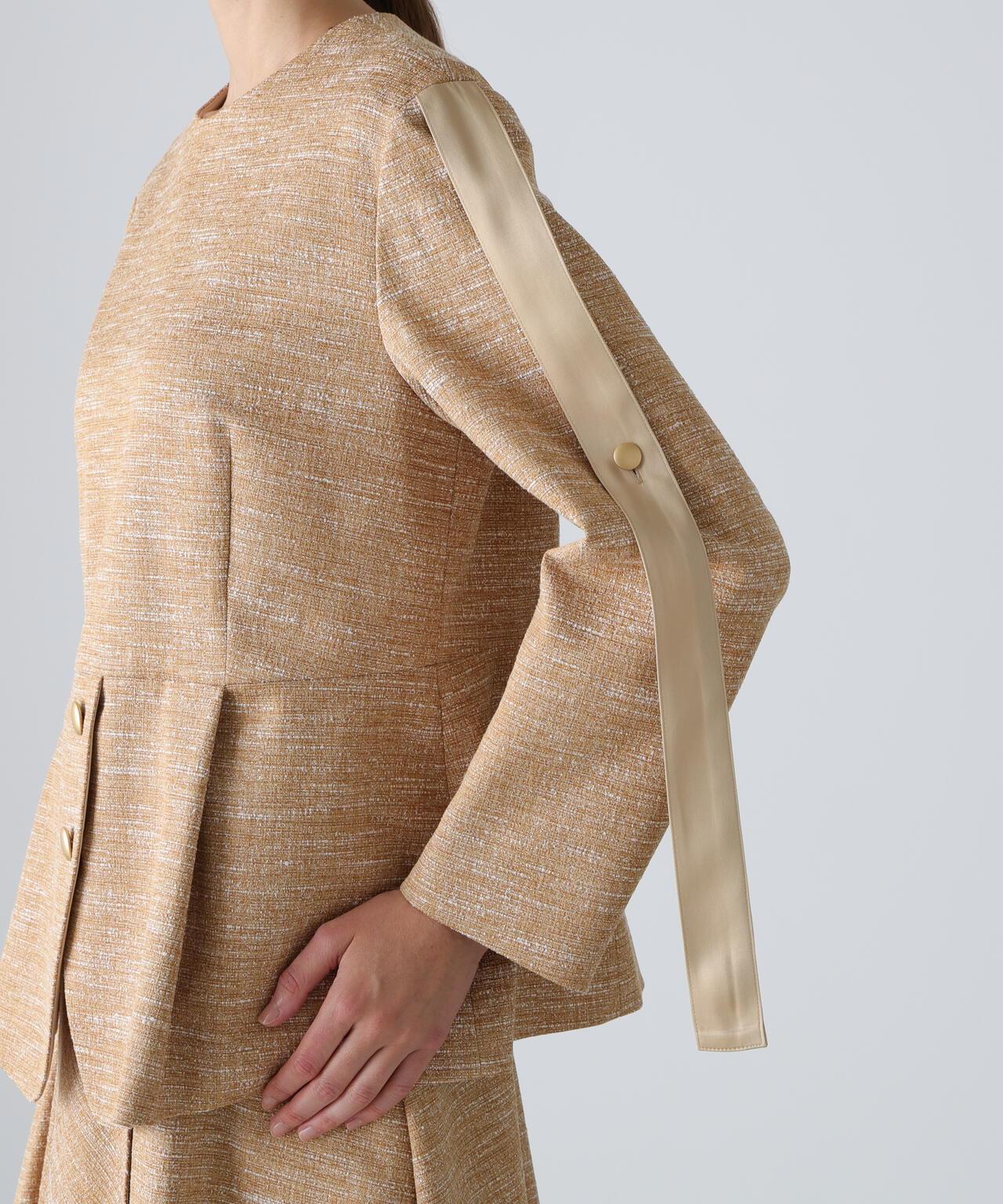 淺色斜紋軟呢蓬蓬裙 白色斜紋軟呢蓬蓬裙。蓬蓬裙的輪廓略顯圓潤,不失甜美。袖子上有緞帶,並用紐扣扣緊。建議搭配同款裙子(貨號:531-5220109)作為套裙。Tweedy 面料由滌綸短纖紗線和棉花輕盈編織而成,未使用羊毛紡紗以降低面料厚度。