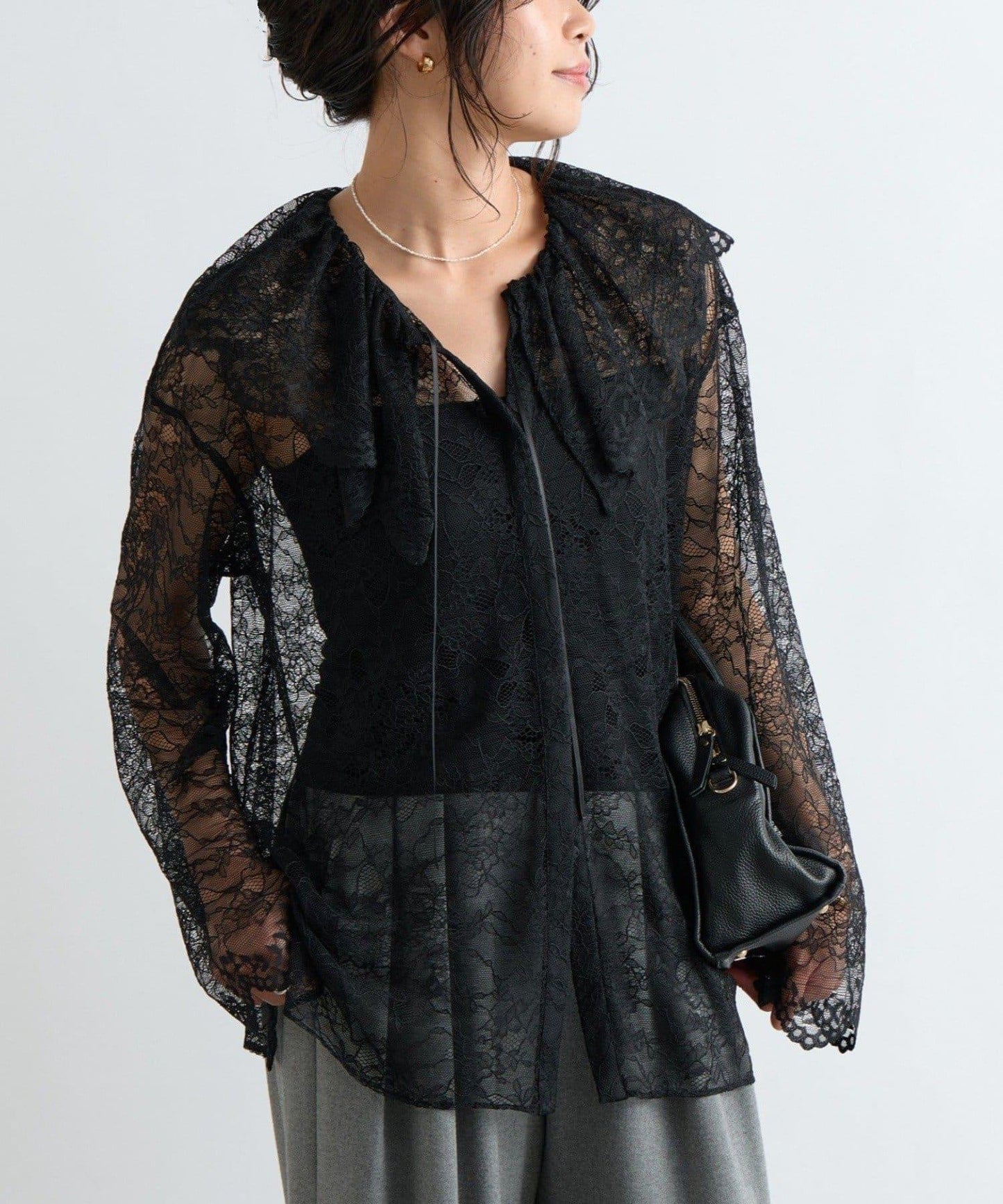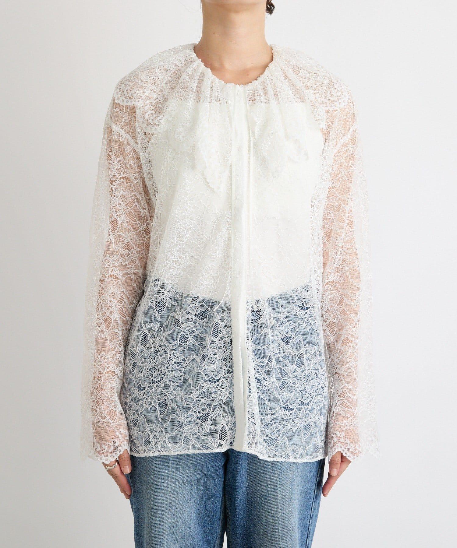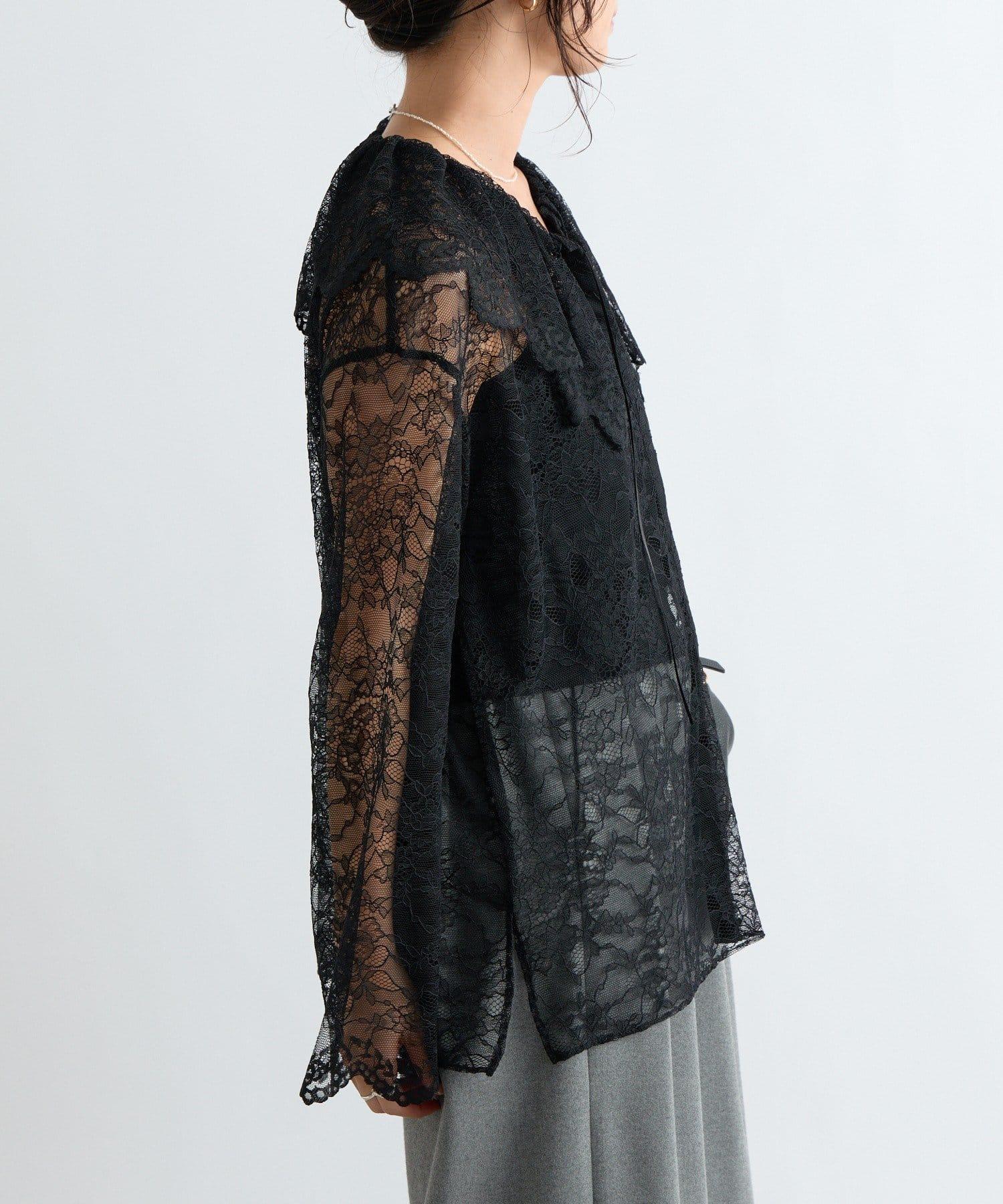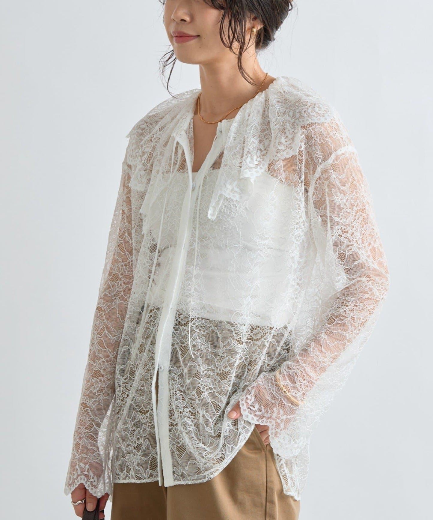 【精緻蕾絲點綴】荷葉邊領蕾絲襯衫
