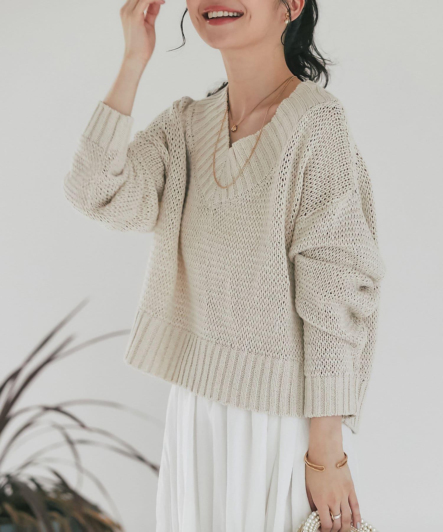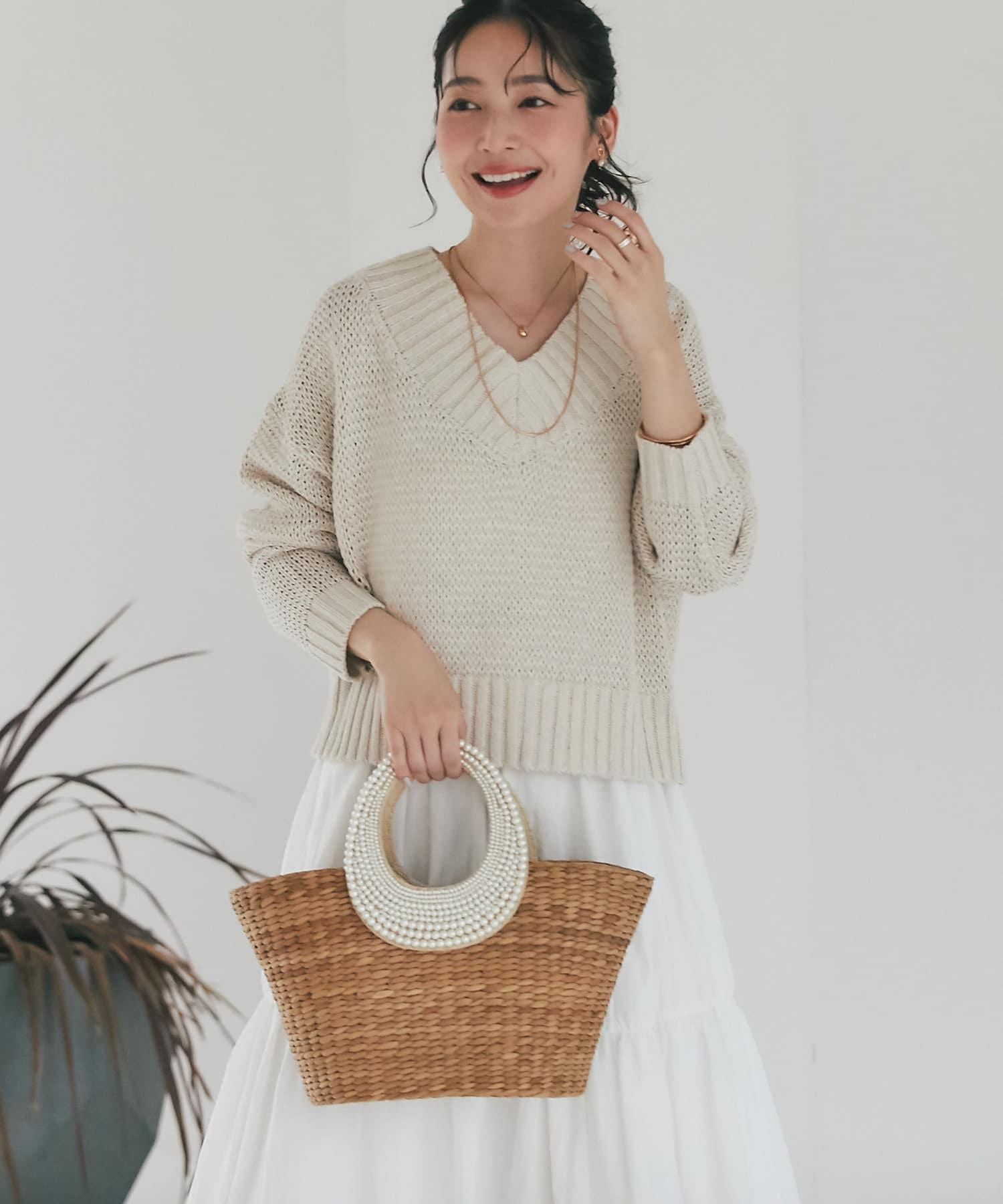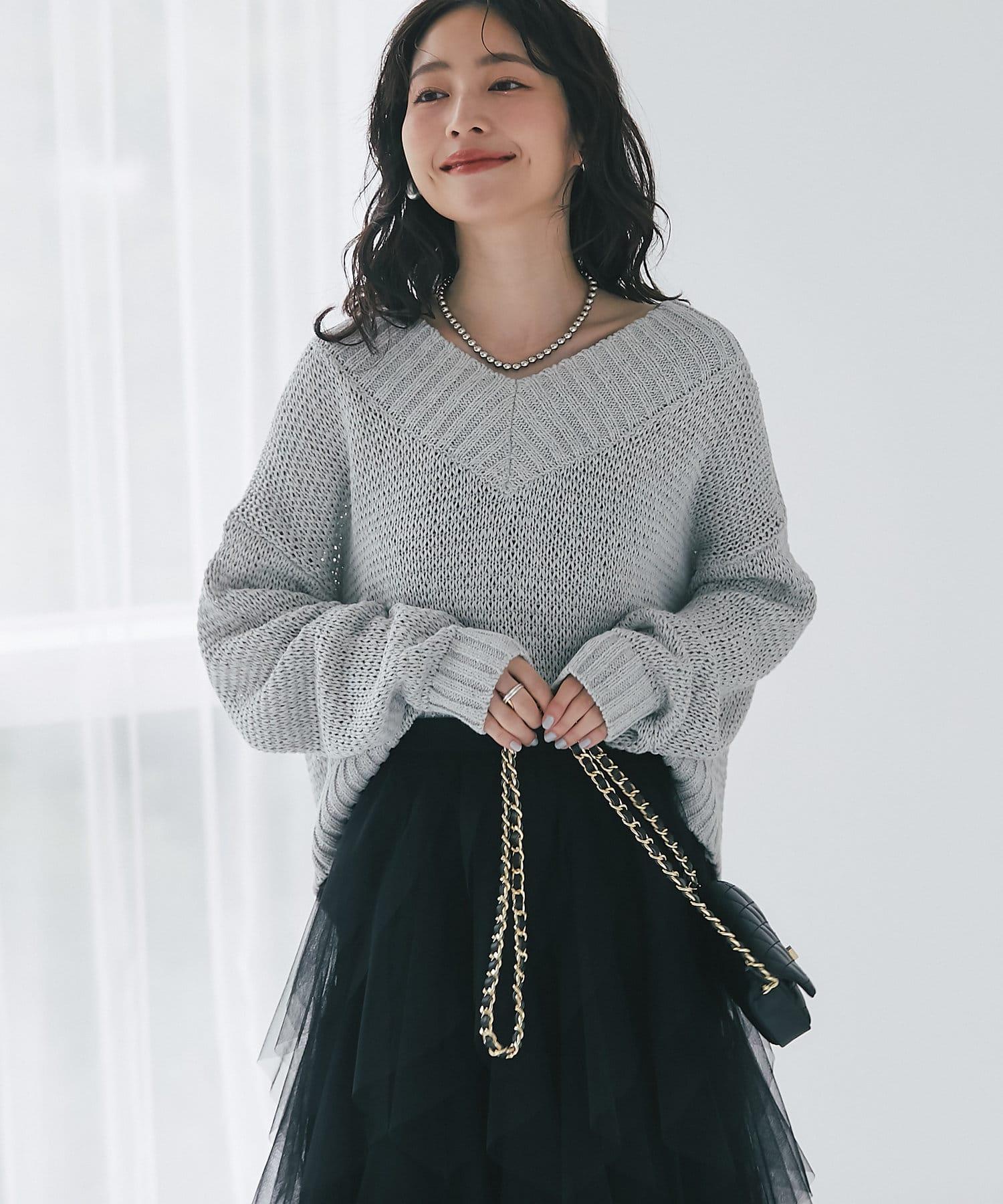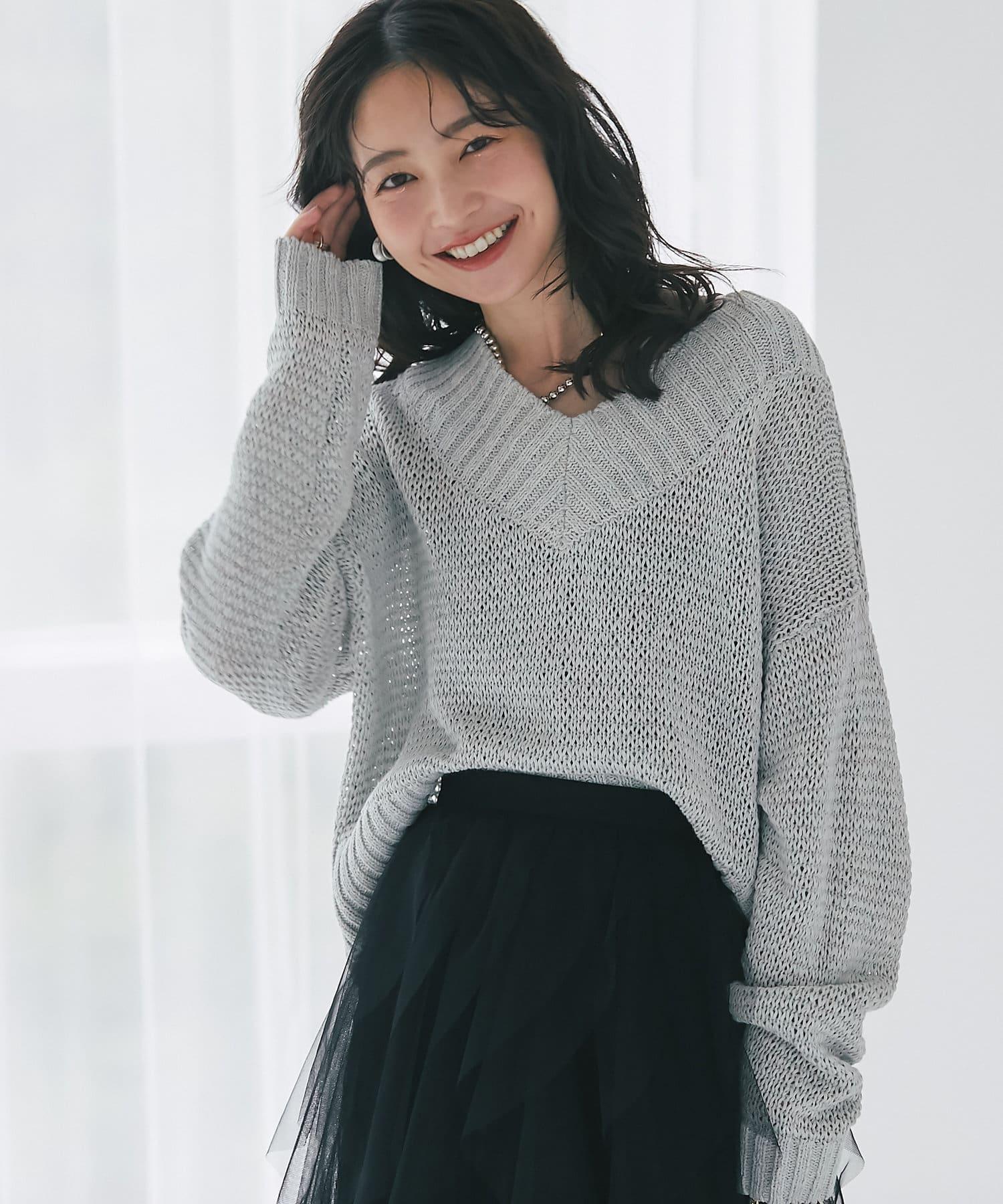 這款採用蓬鬆紗線的 V 領針織衫給人以溫柔的印象,是年度👍的款式。