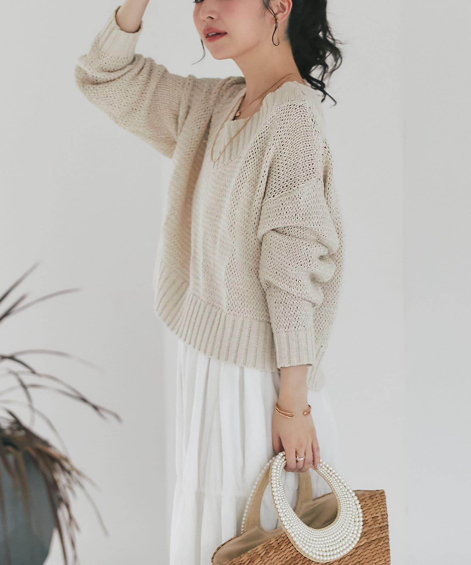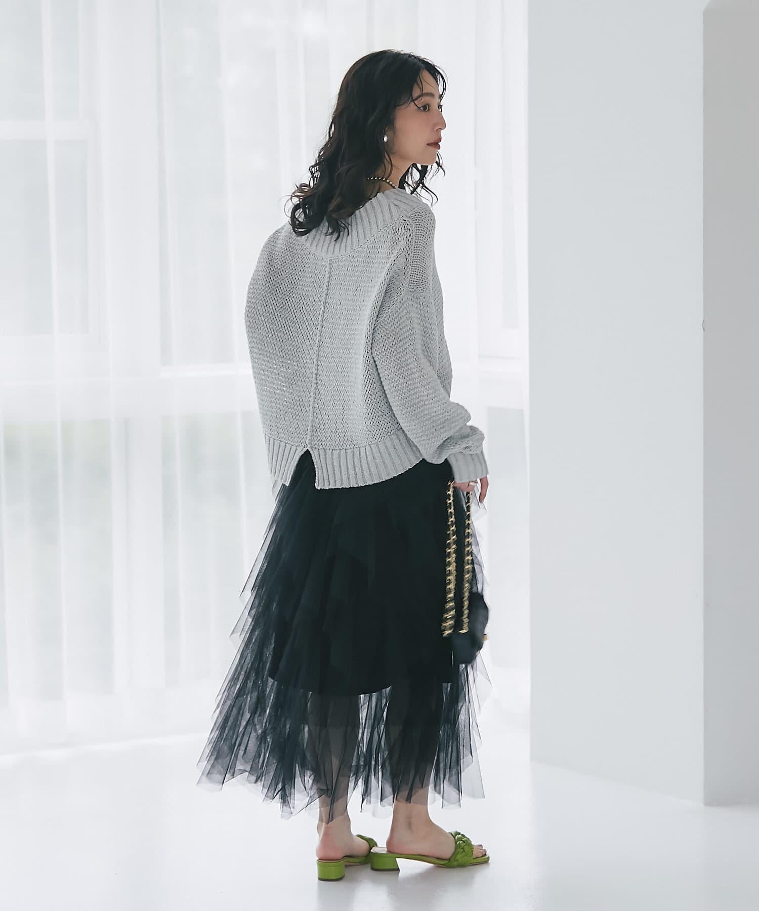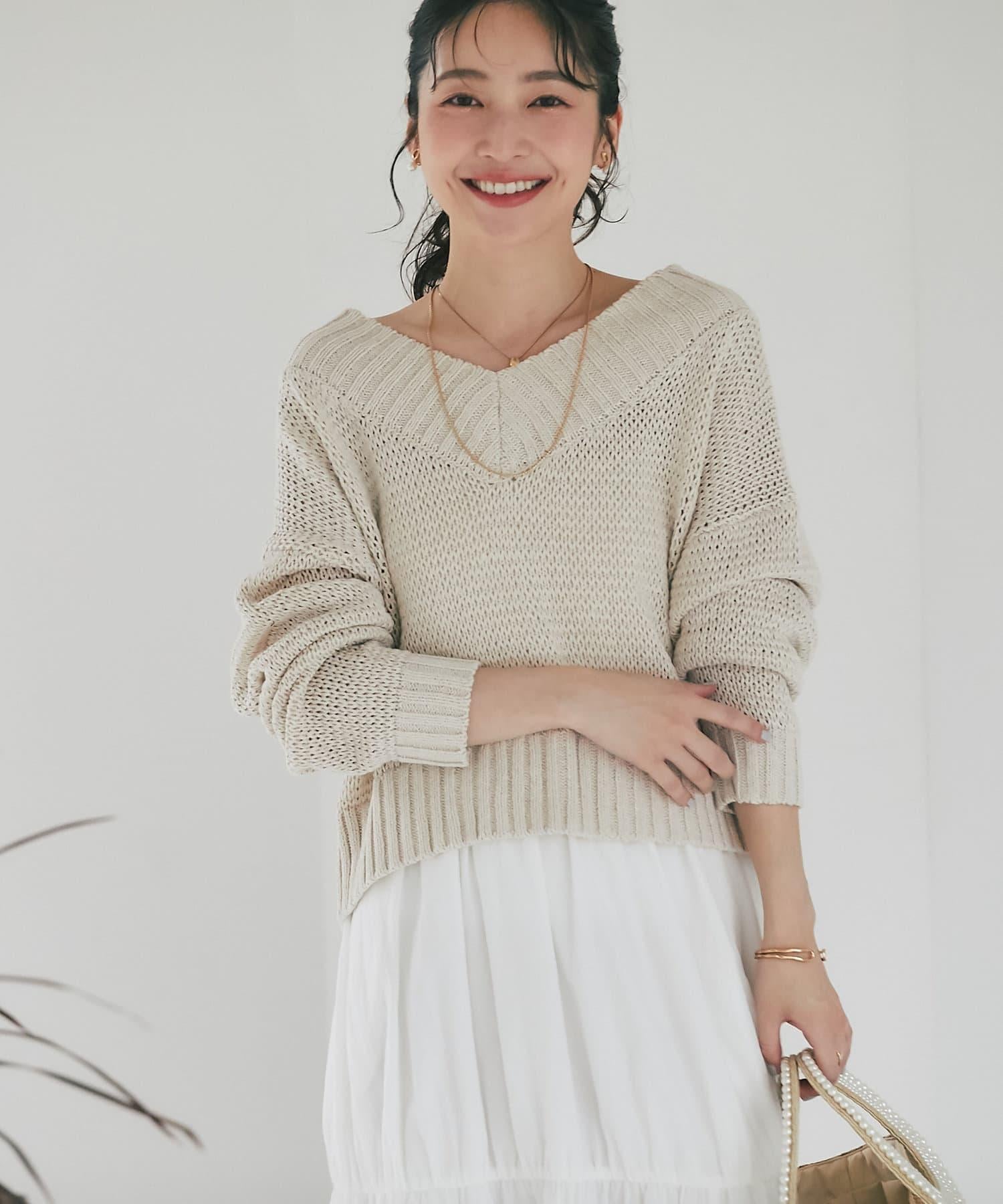 寬大的 V 字領口營造出優美的肩部線條,適度的寬鬆感提升了女性魅力。