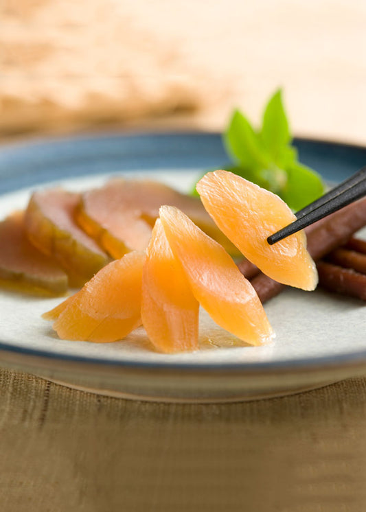 紫蘇梅只使用精心手工搓制的紅紫蘇,沒有任何著色劑。您可以享受到原汁原味的紫蘇的鮮豔色彩、香氣和味道。