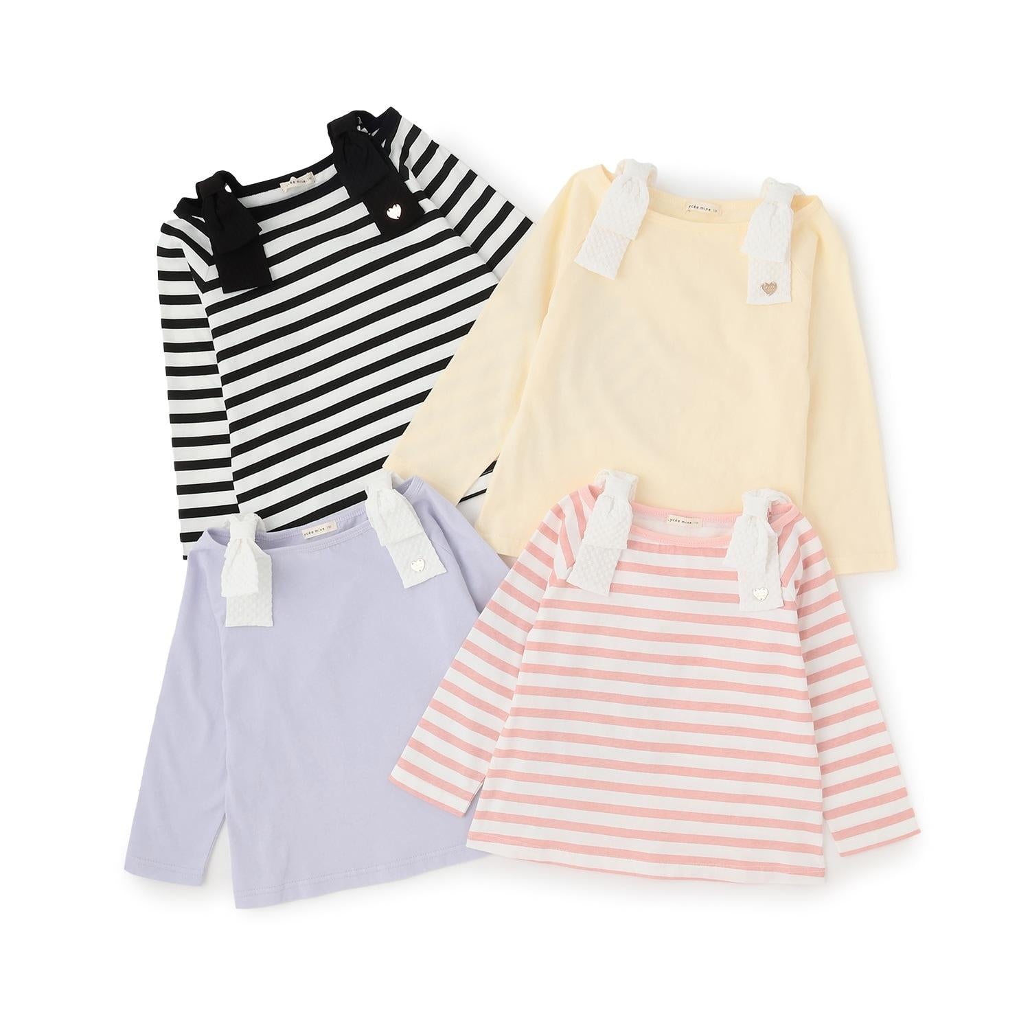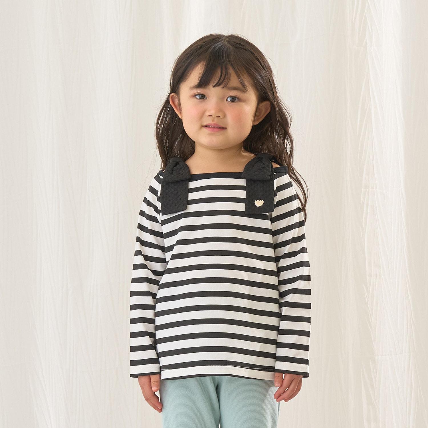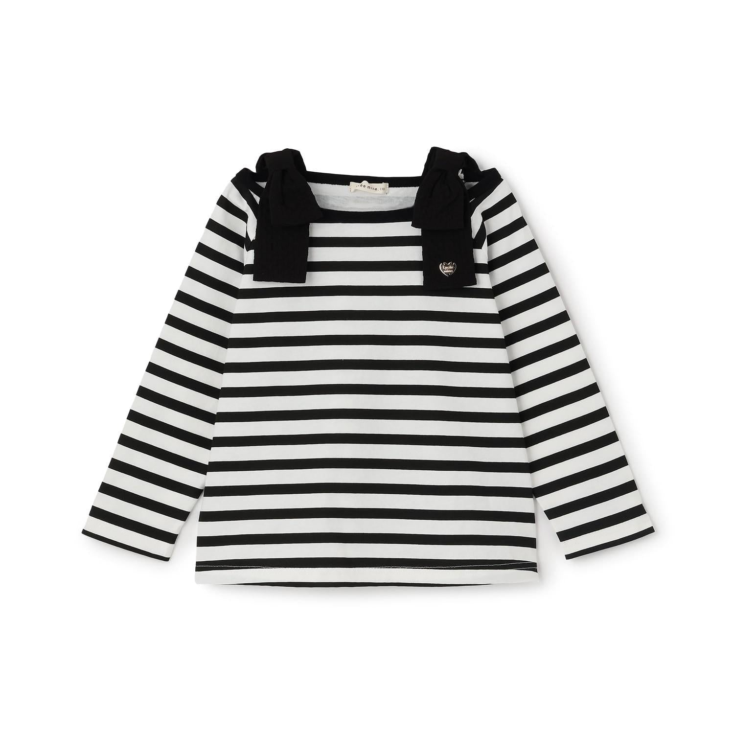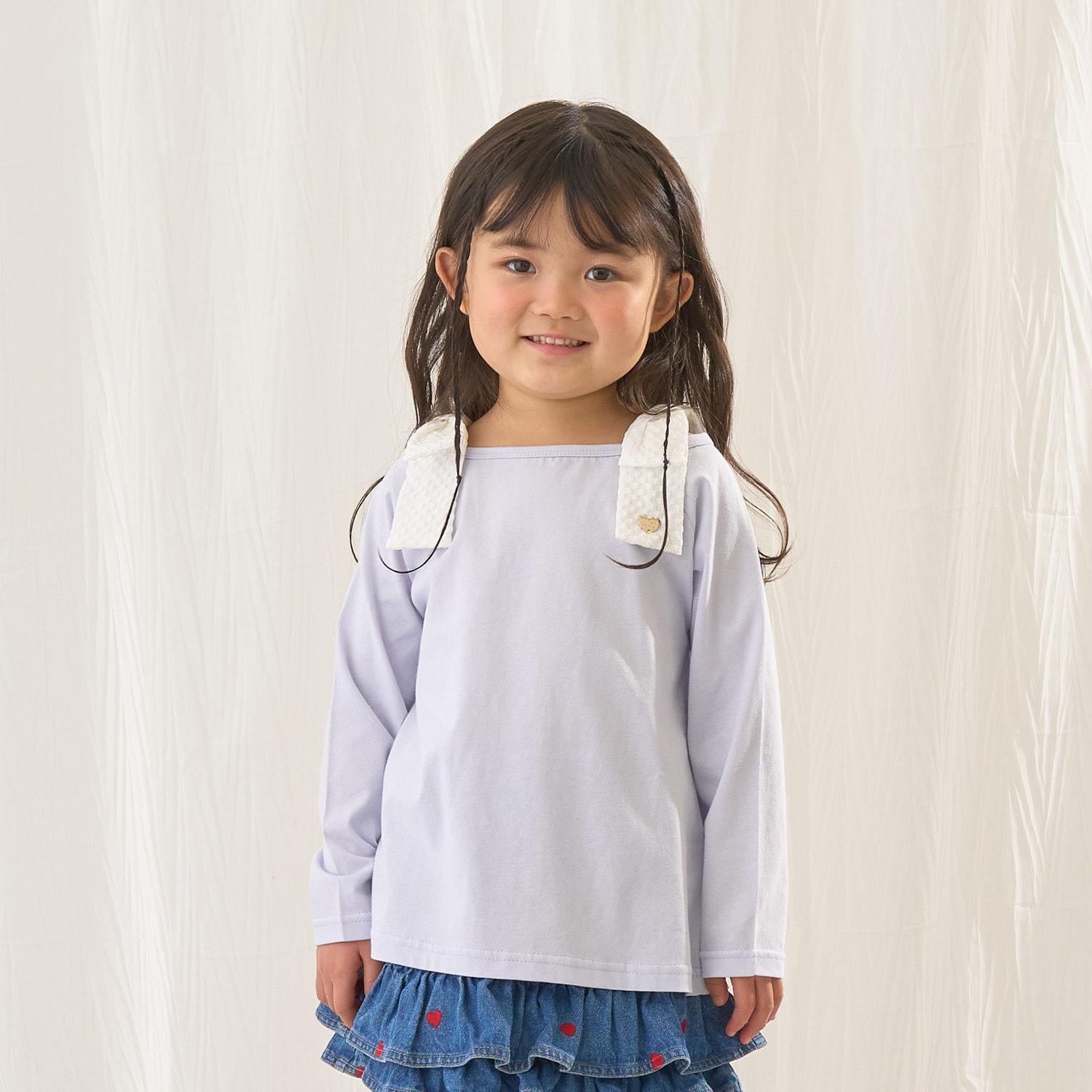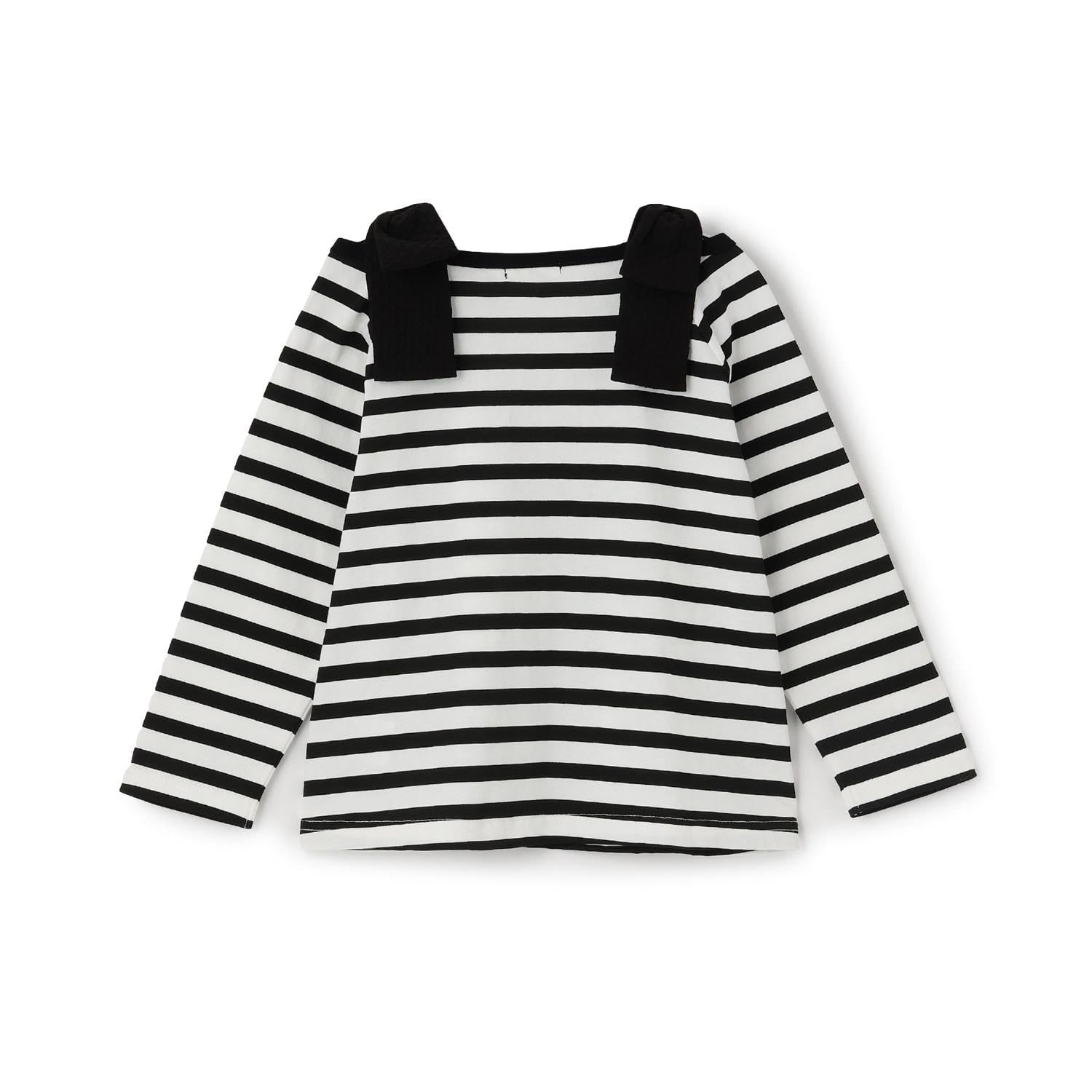 長袖 T 恤,船領設計,肩部飾有可愛的絲帶。