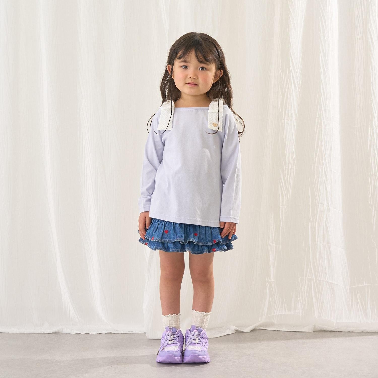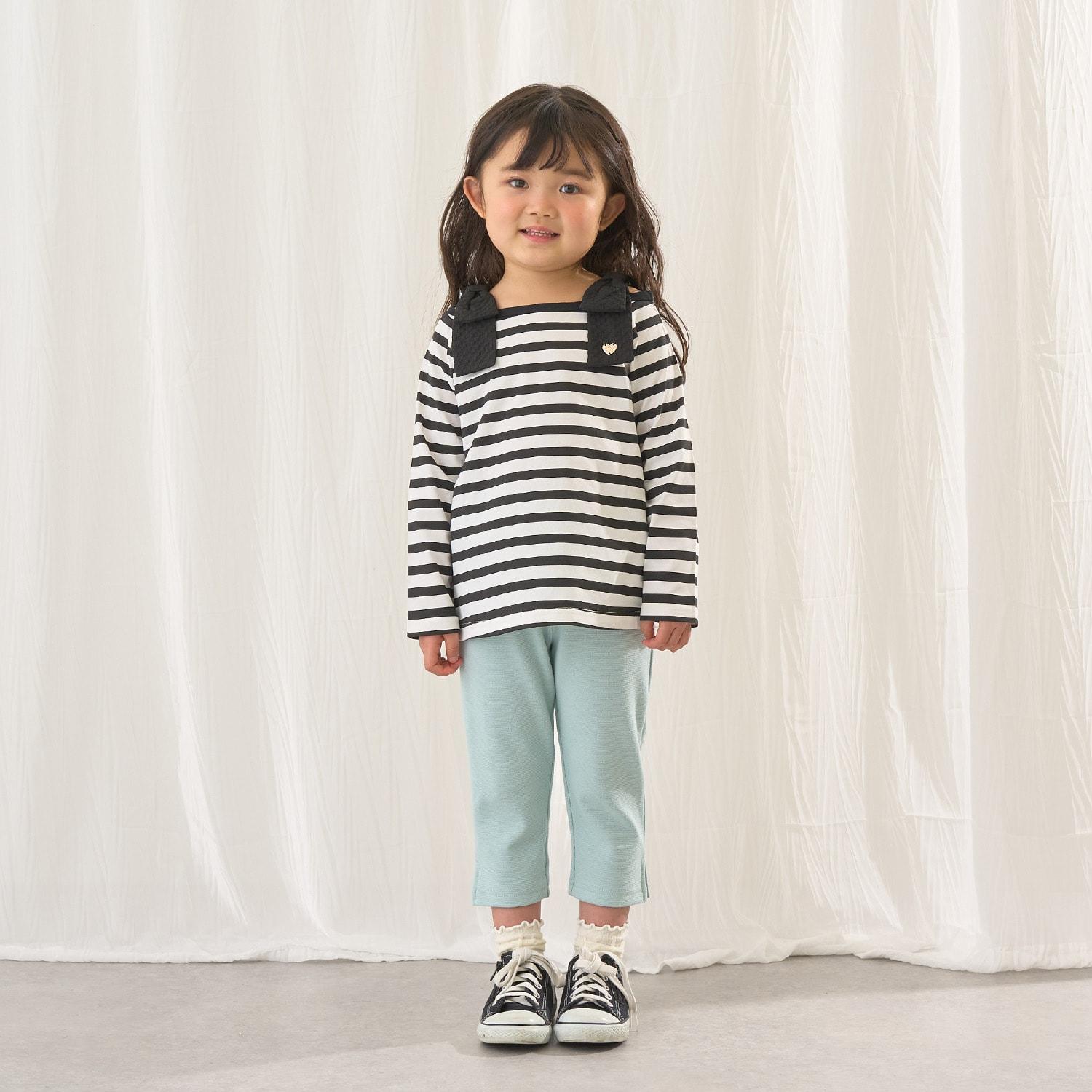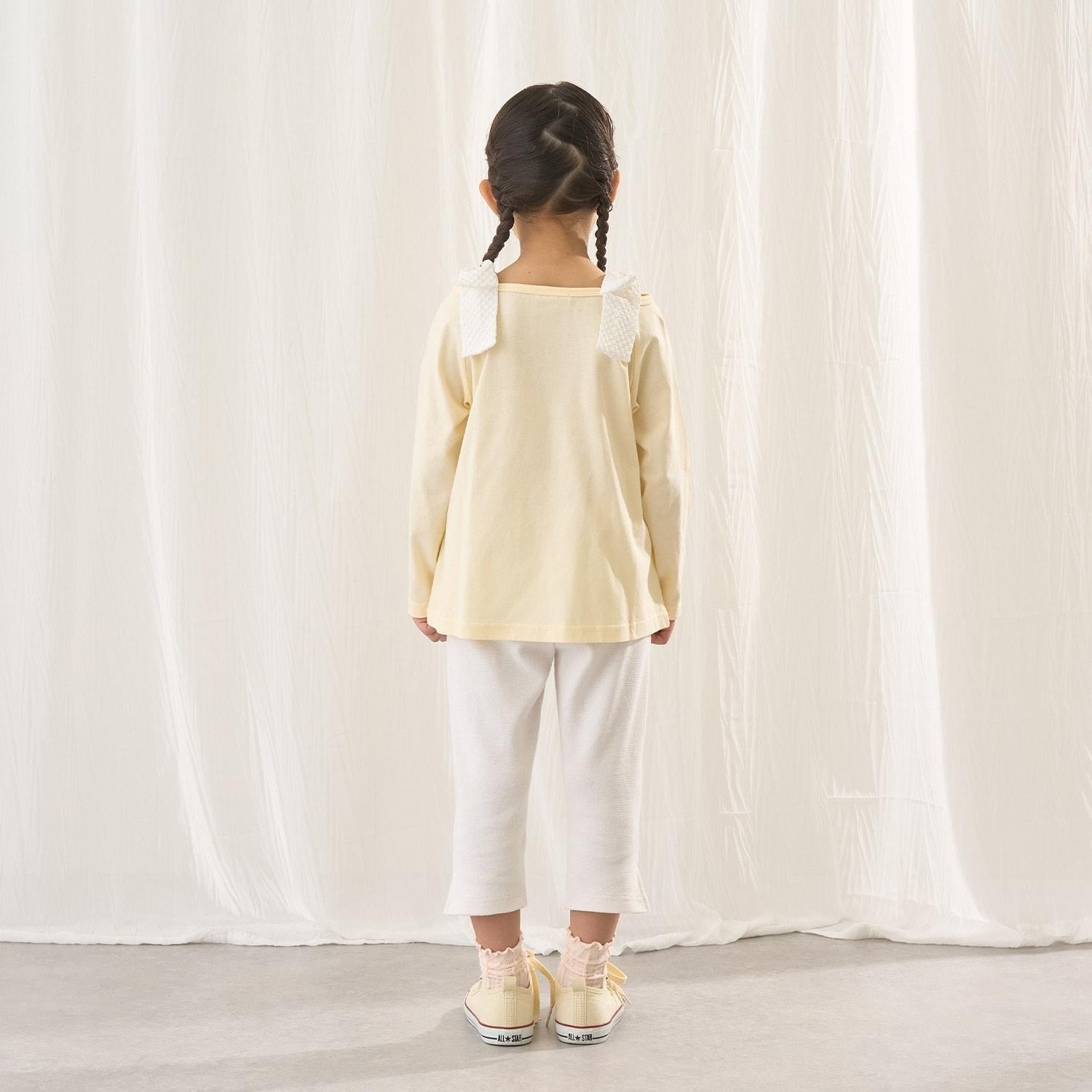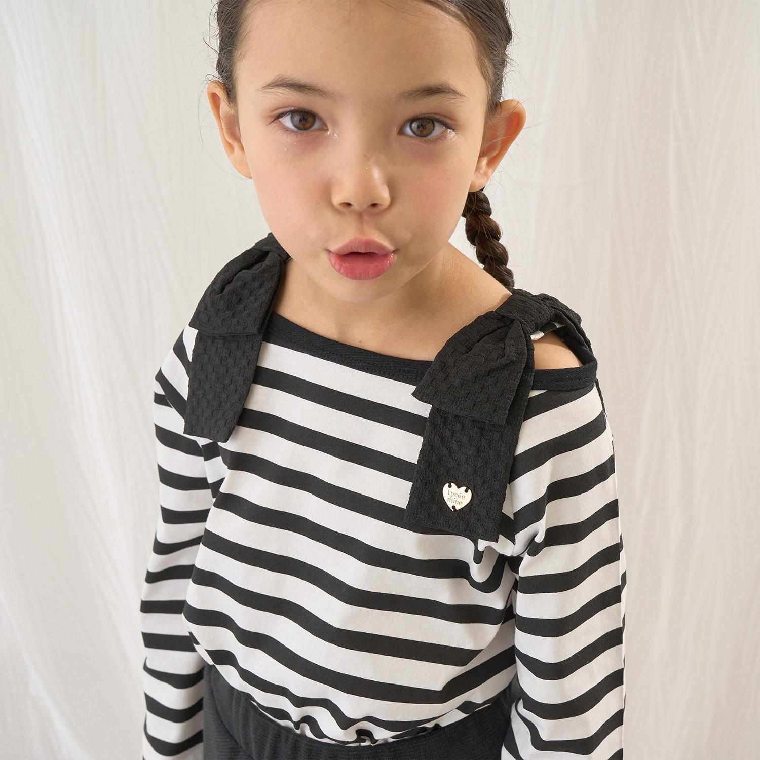 長袖 T 恤,船領設計,肩部飾有可愛的絲帶。