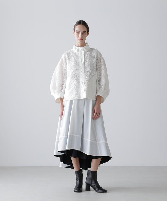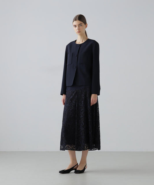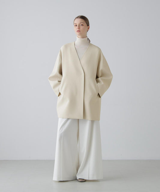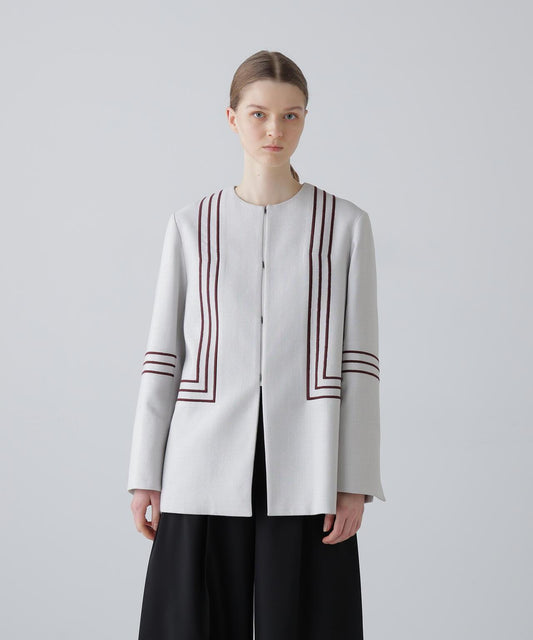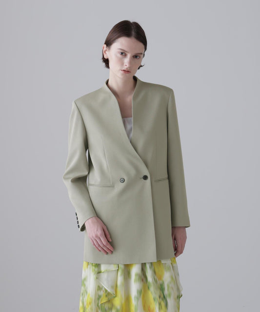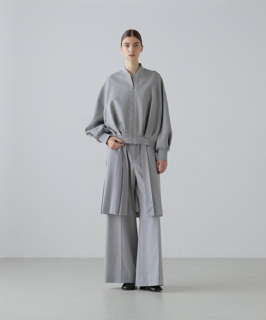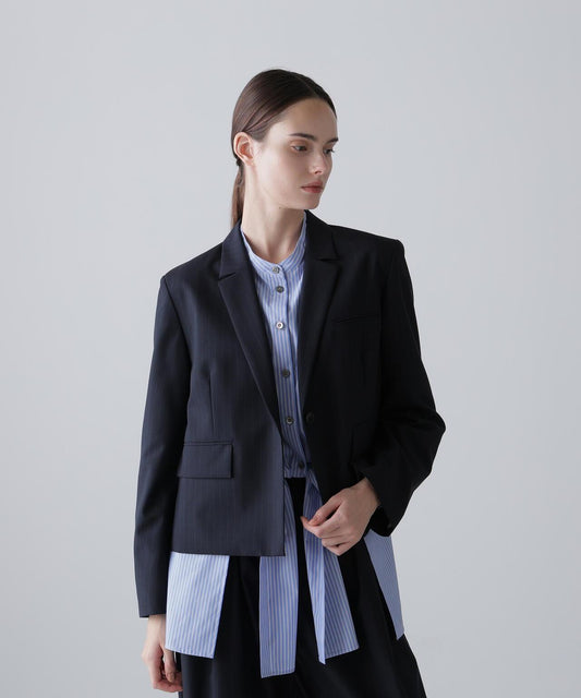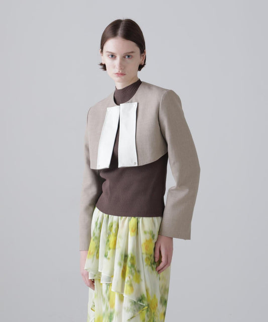 乾爽觸感仿紙彈力夾克立領夾克,採用乾爽觸感仿紙面料。前襟金屬扣。圓角下襬。採用緊湊型彈力面料剪裁,觸感如紙般乾爽。