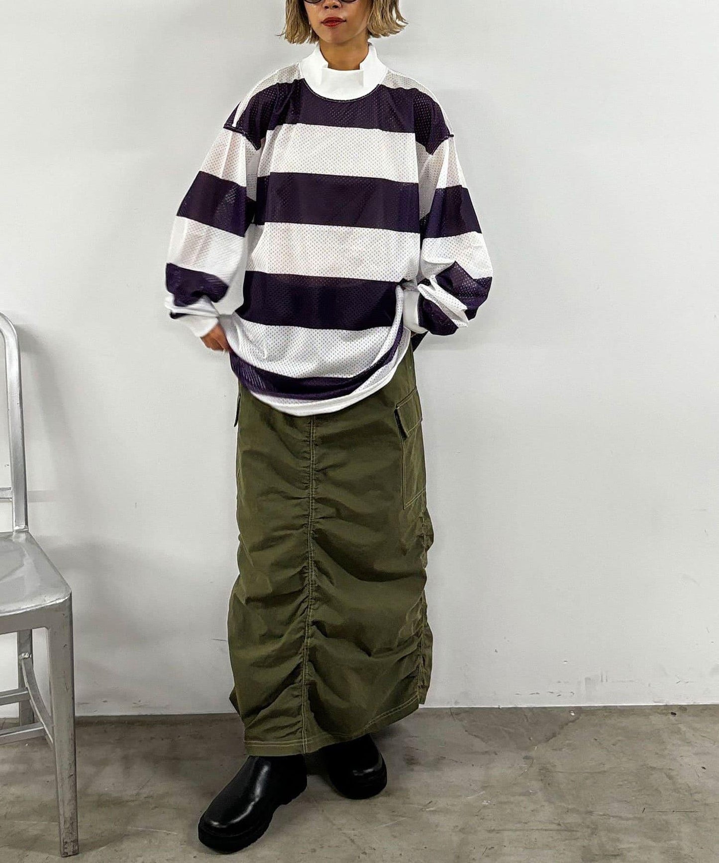長袖 T 恤,領口略高,採用透明網眼面料。