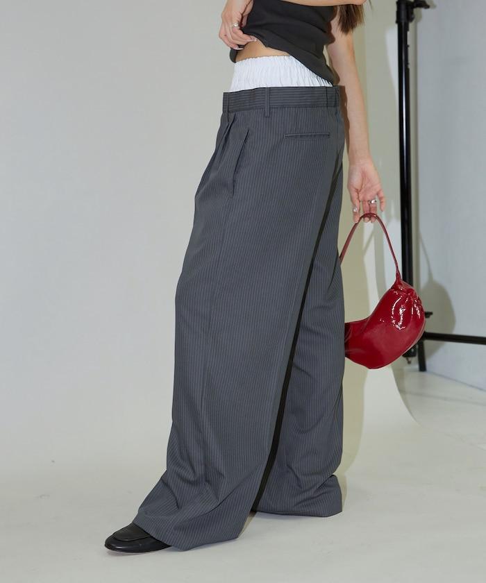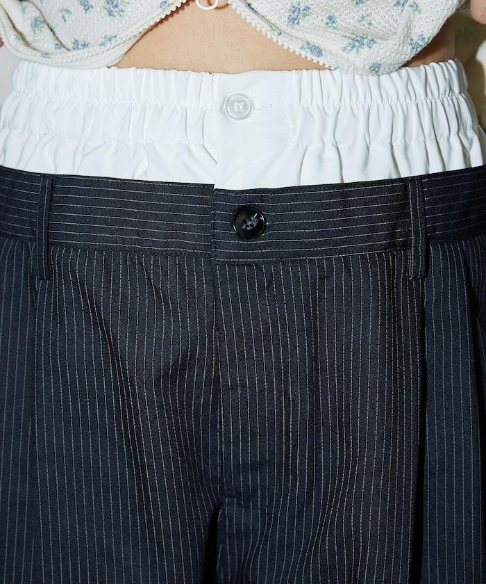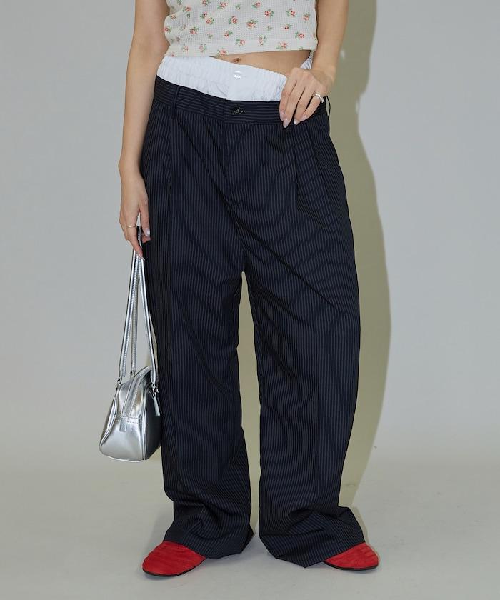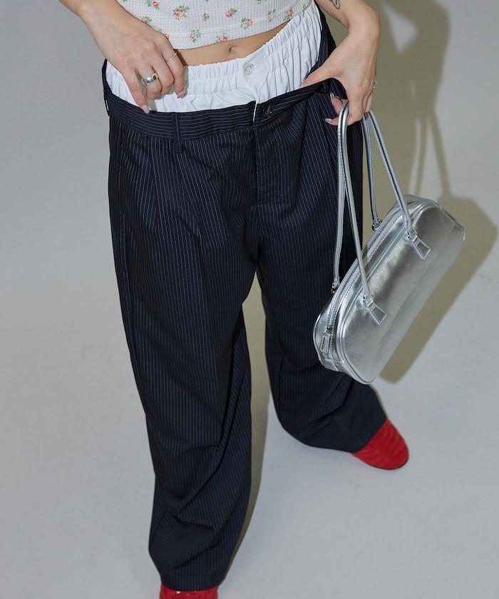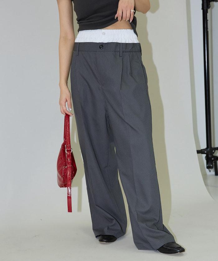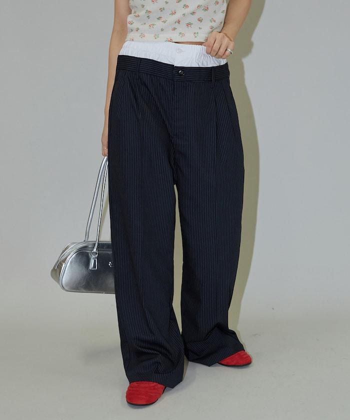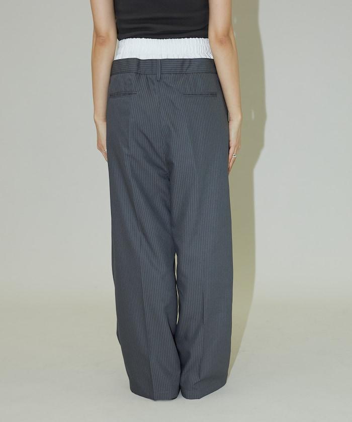雙腰設計可作為基本款休閒褲穿著,上衣可外穿,也可將上衣內搭,展現雙腰效果。