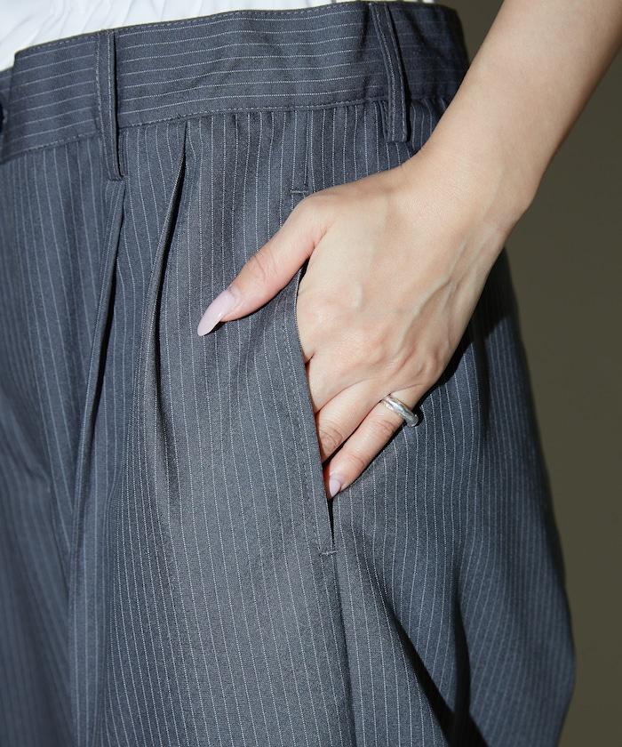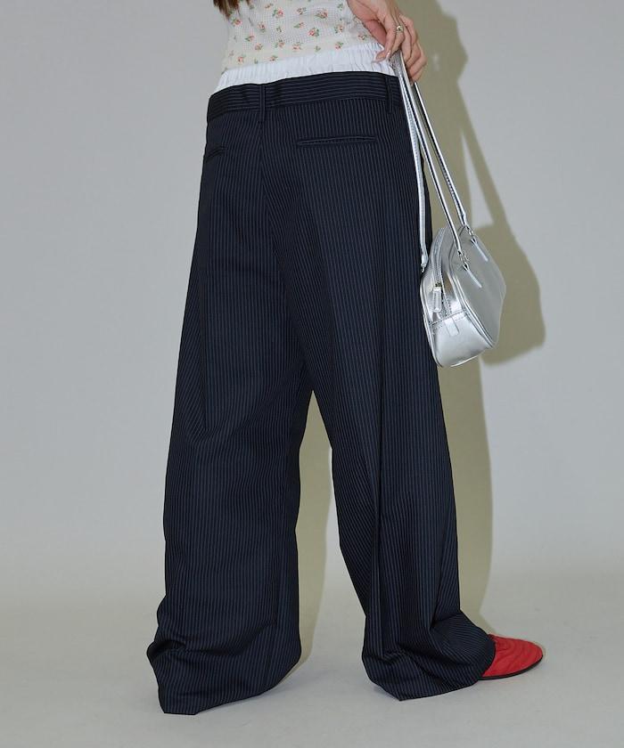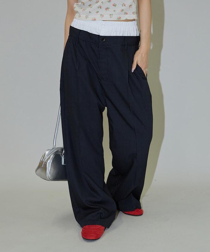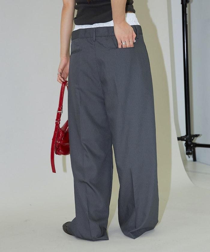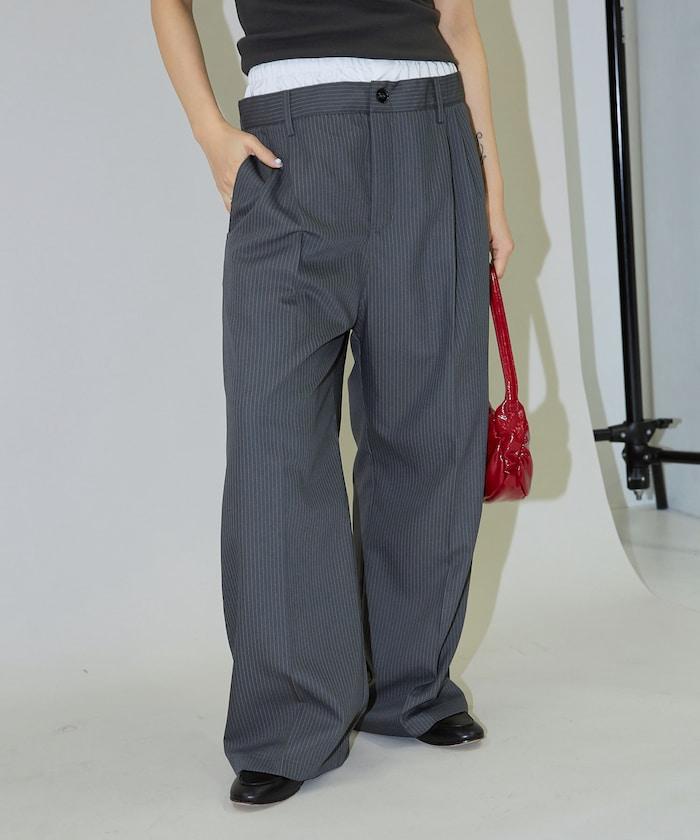 細條紋 雙高腰 雙褶 寬鬆褲