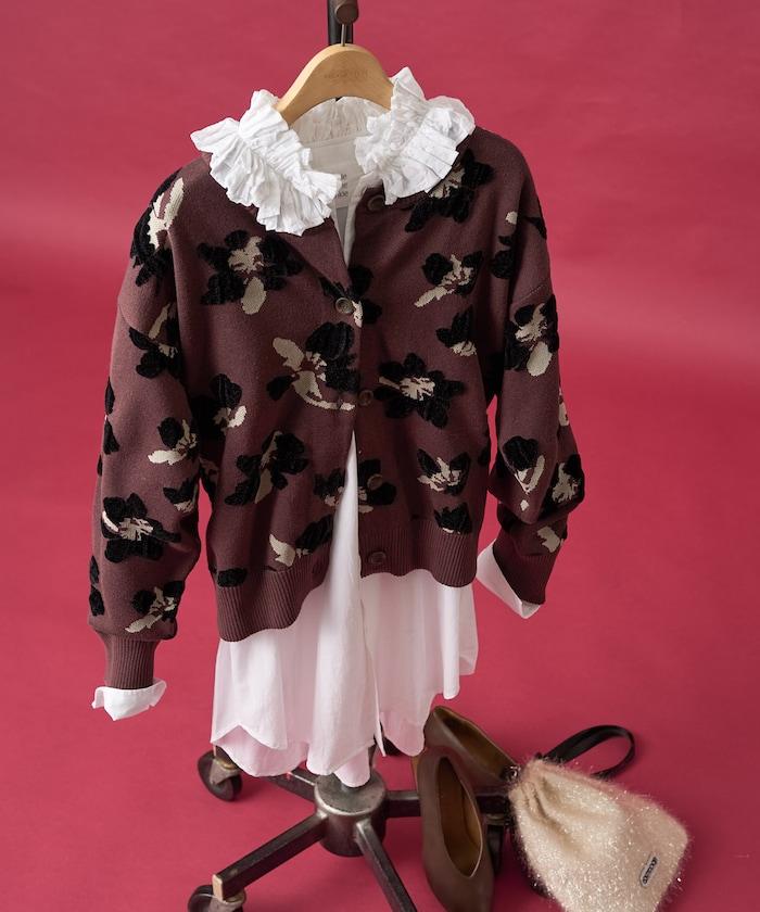 這款針織開衫給人以優雅的印象,使用辮子紗線裝飾有花朵圖案。