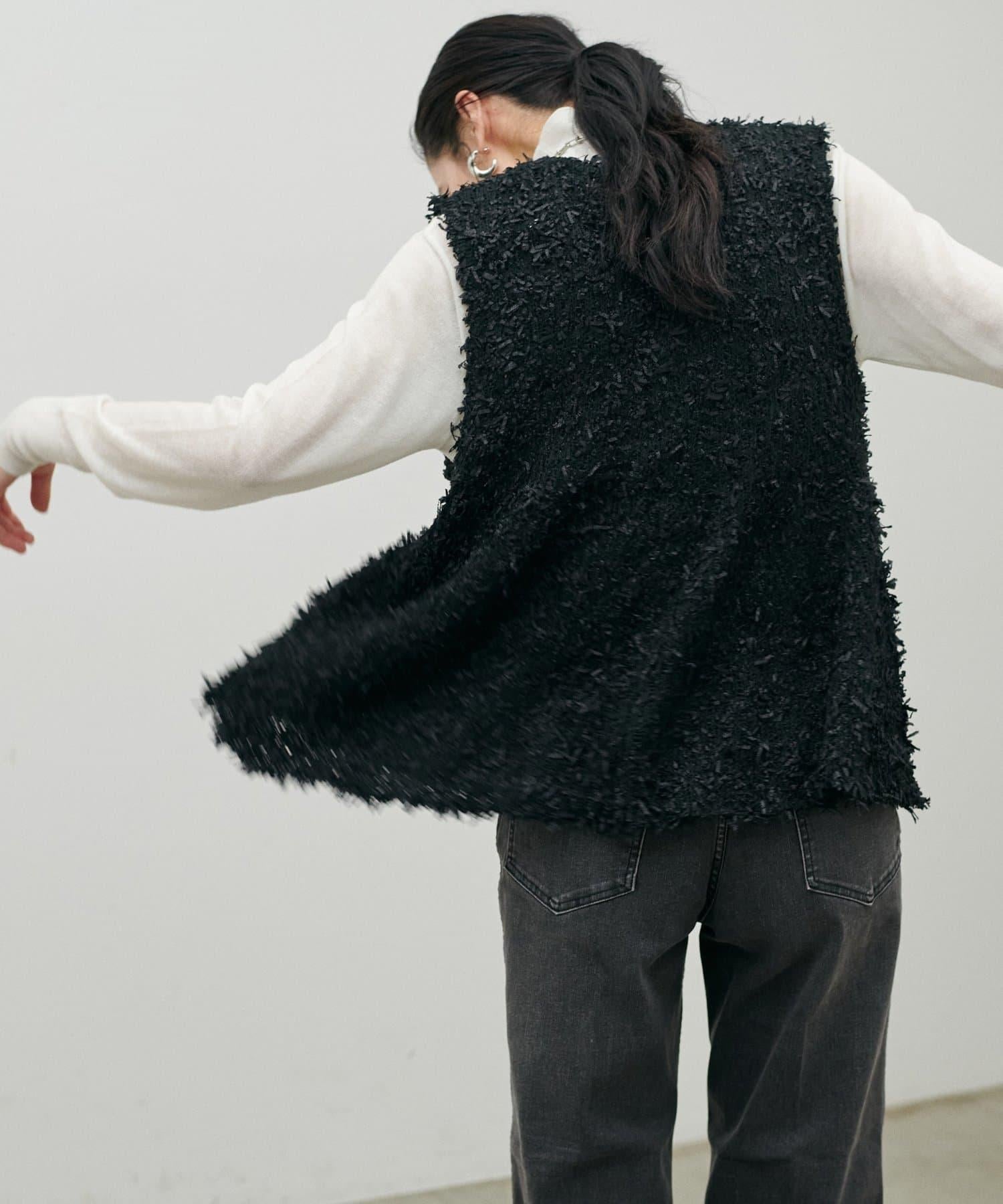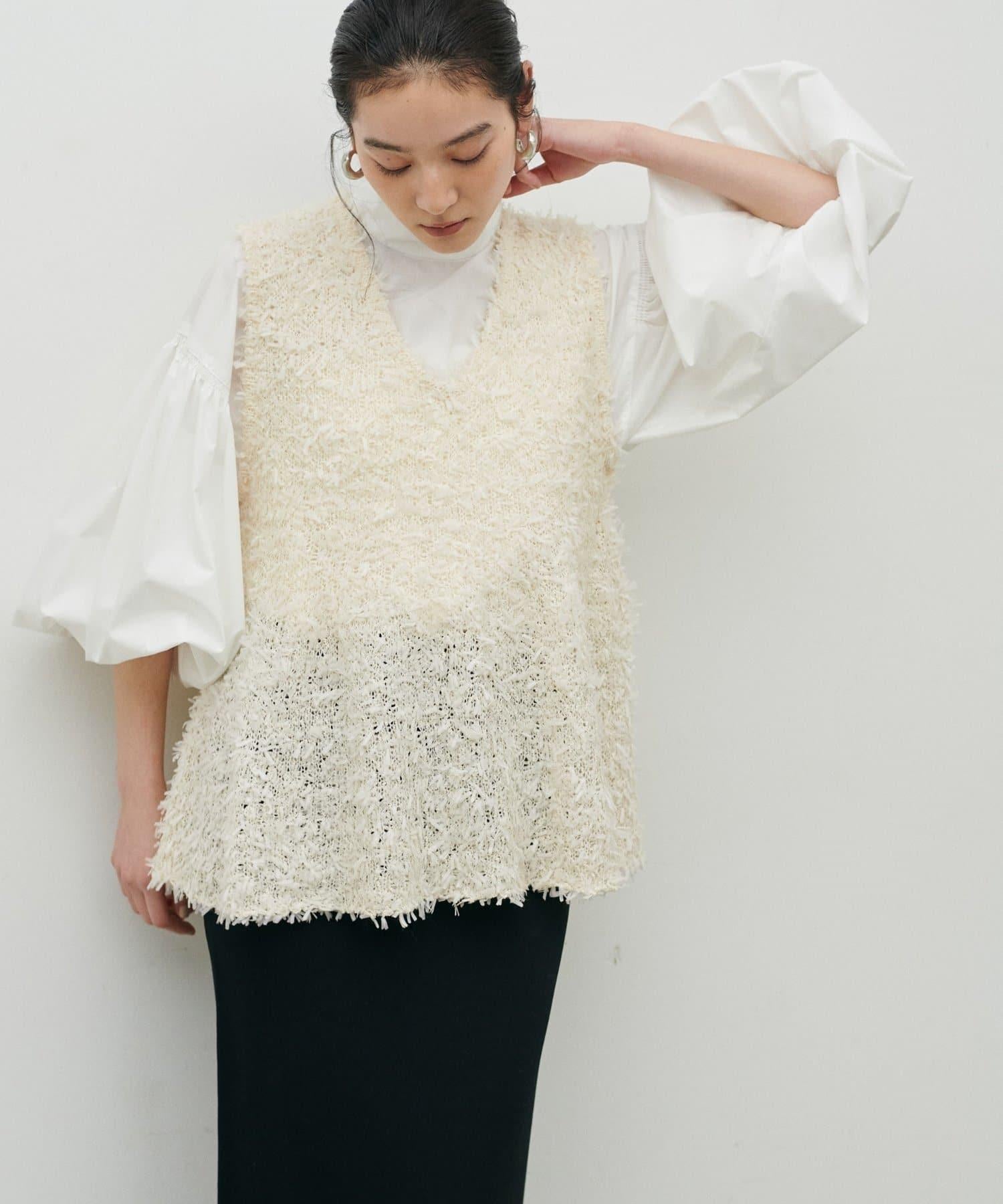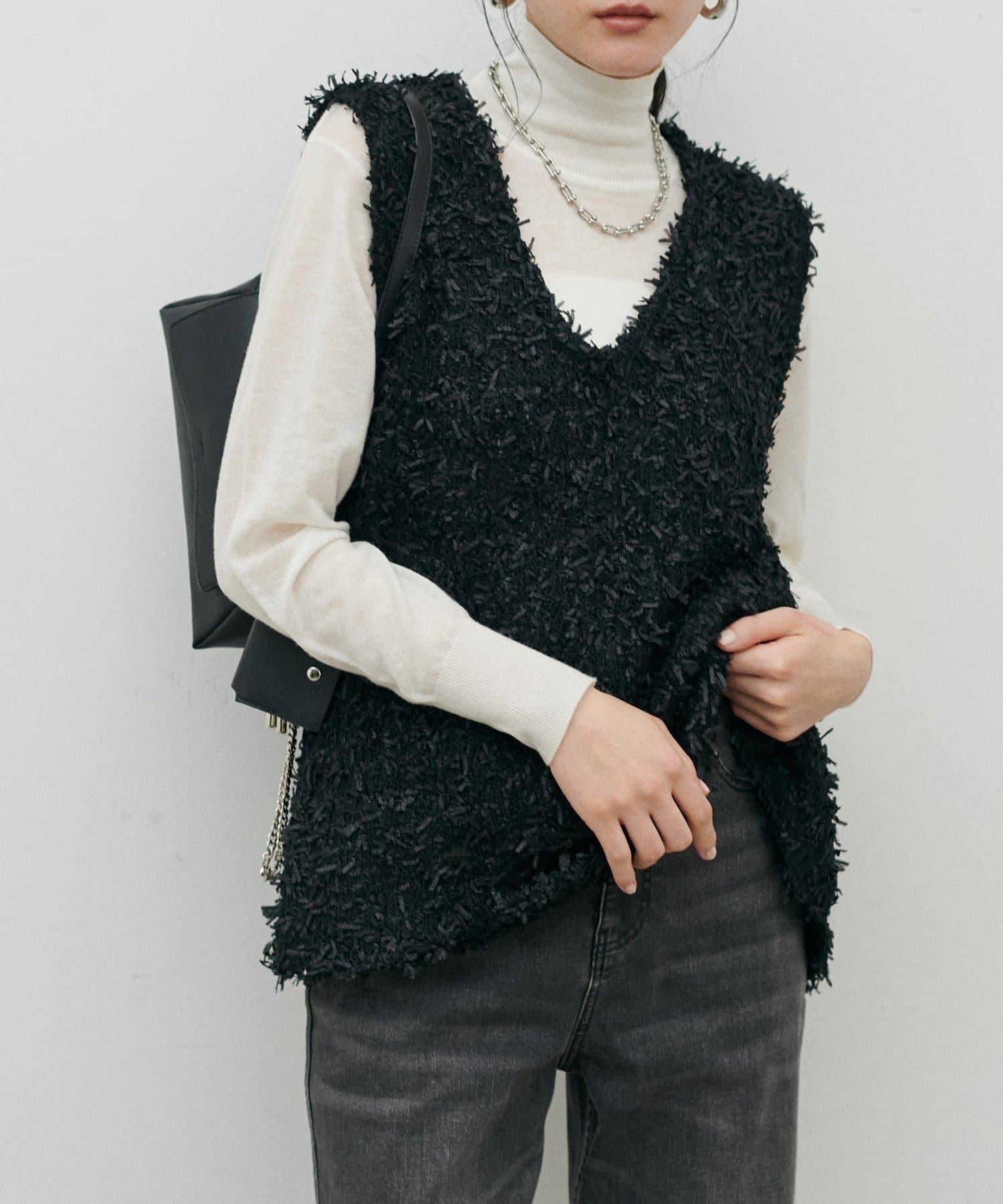 這款針織馬甲由表面富有表現力的緞帶紗線製成,具有強烈的存在感。