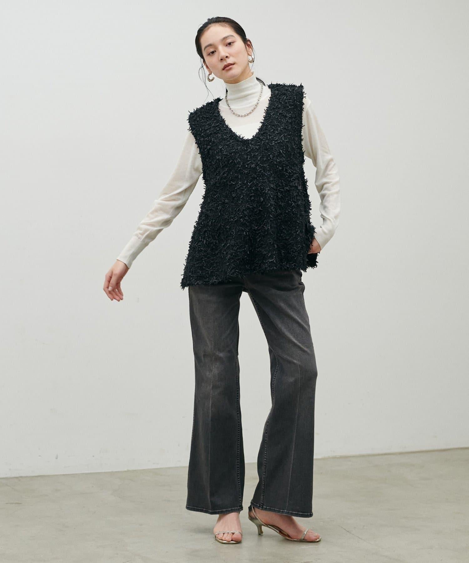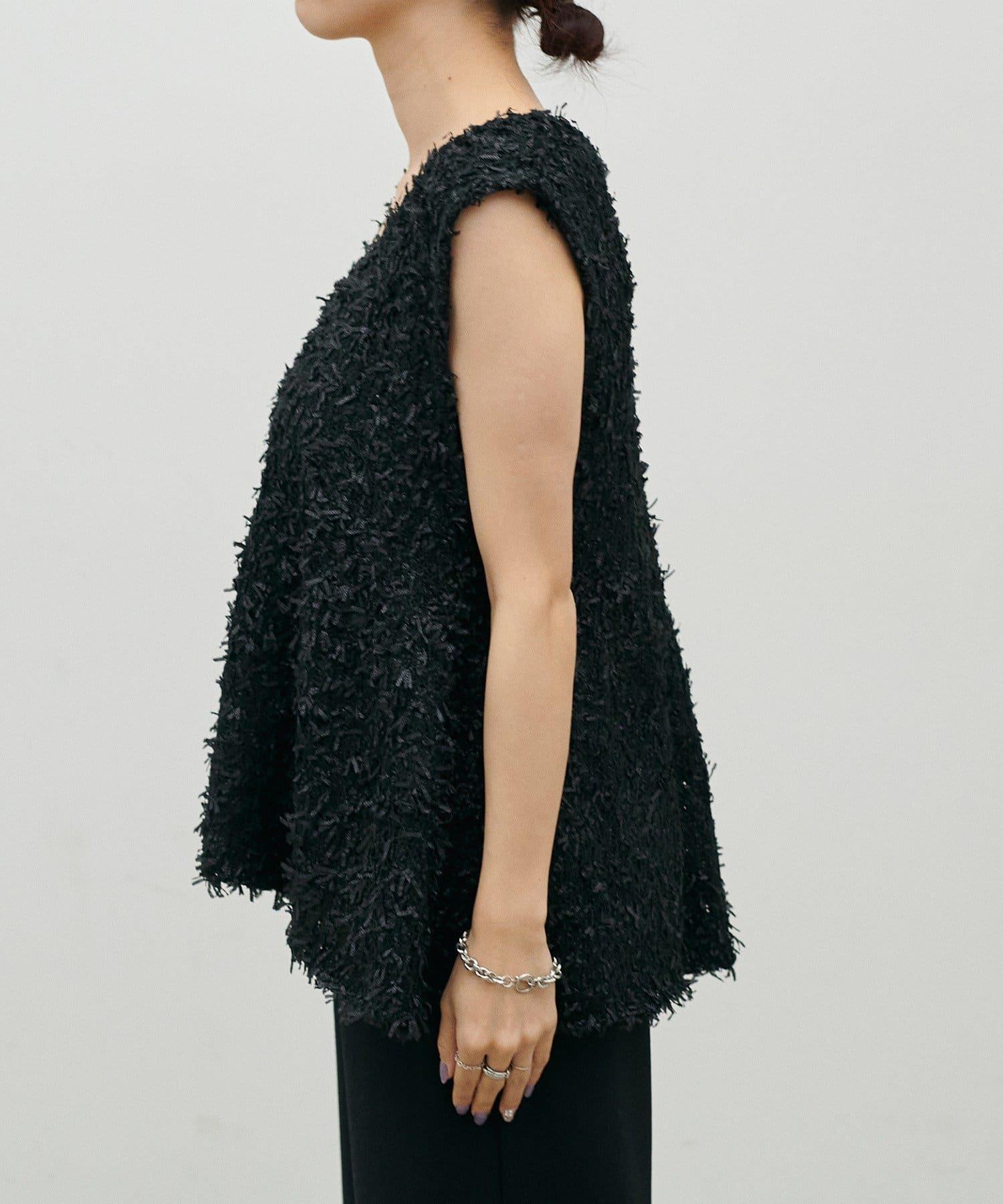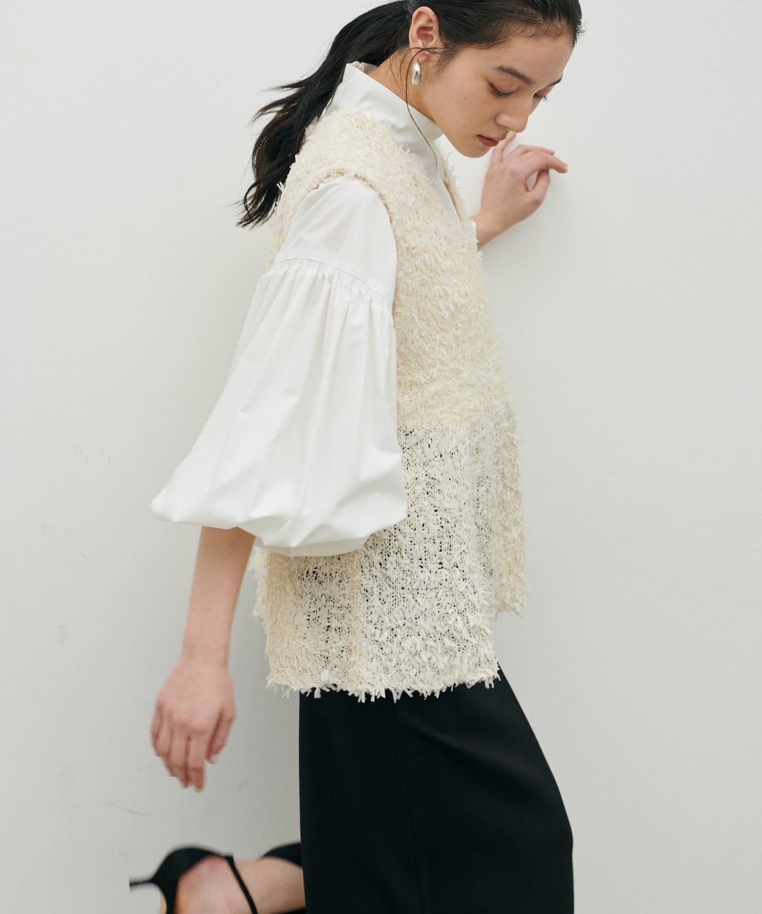 這款針織馬甲由表面富有表現力的緞帶紗線製成,具有強烈的存在感。