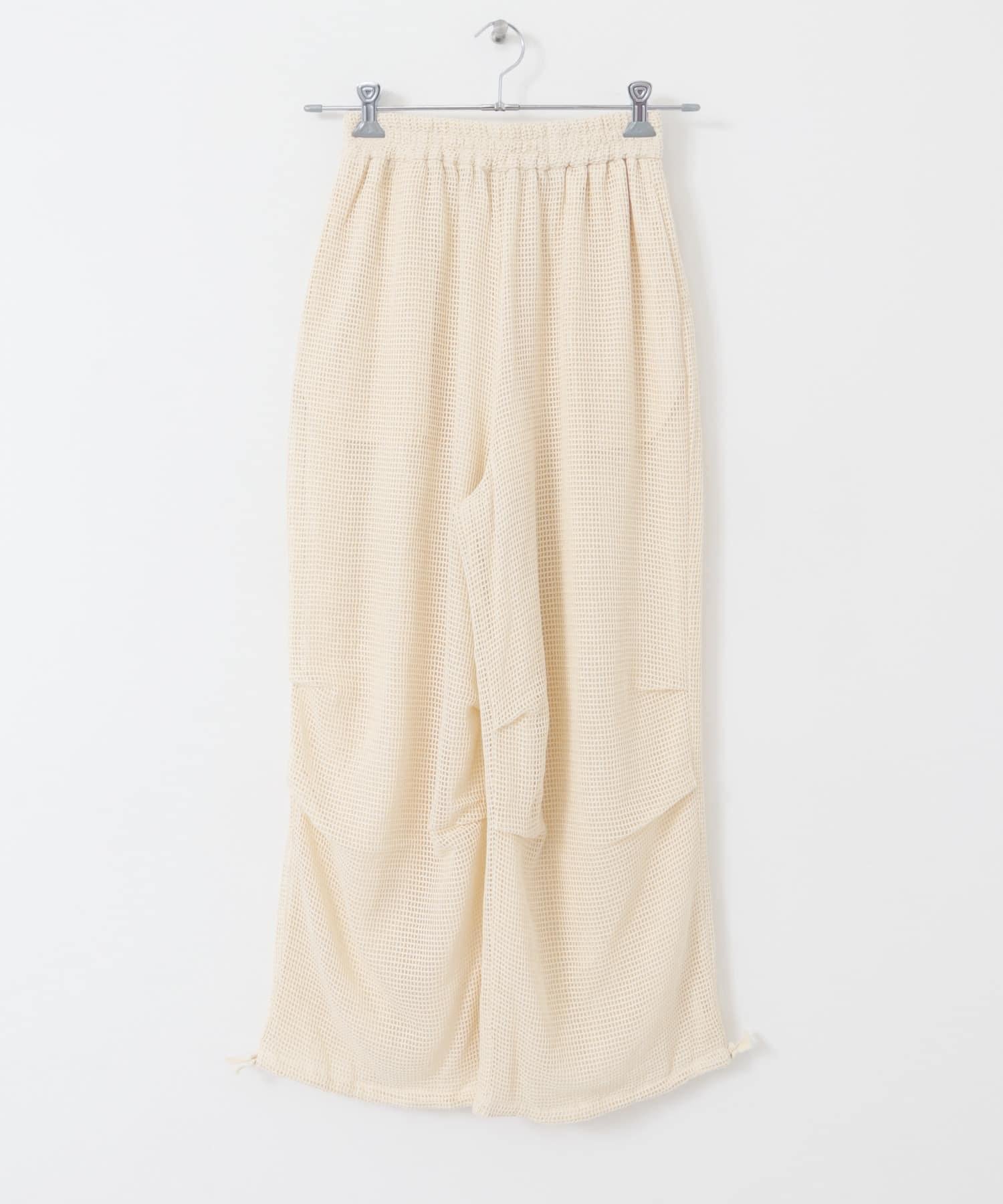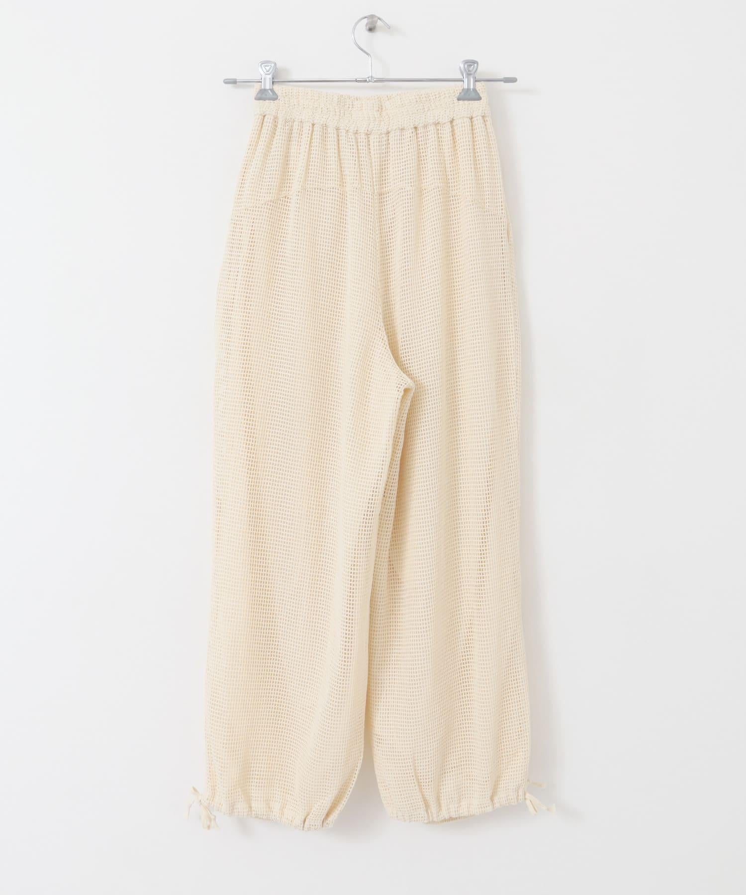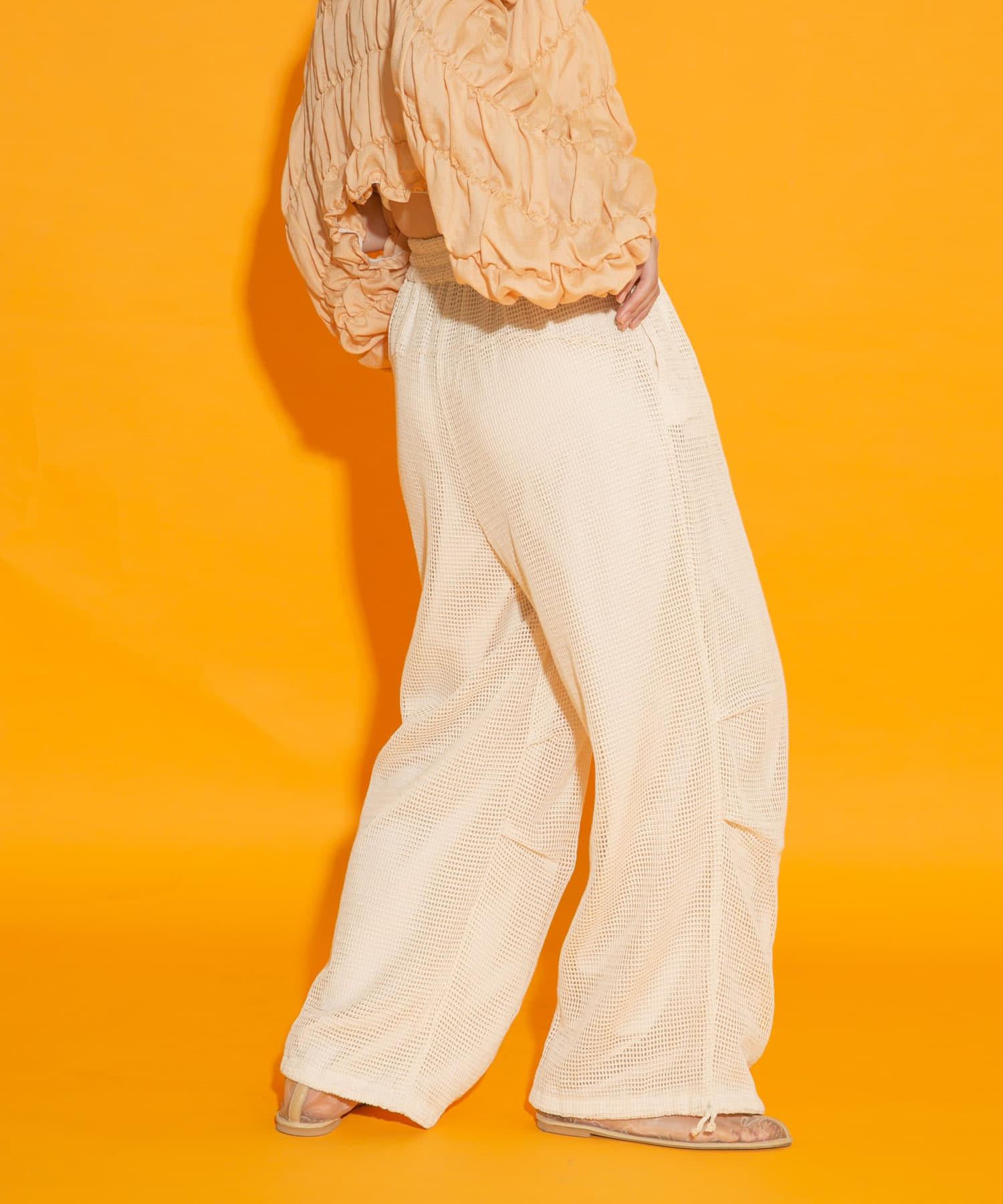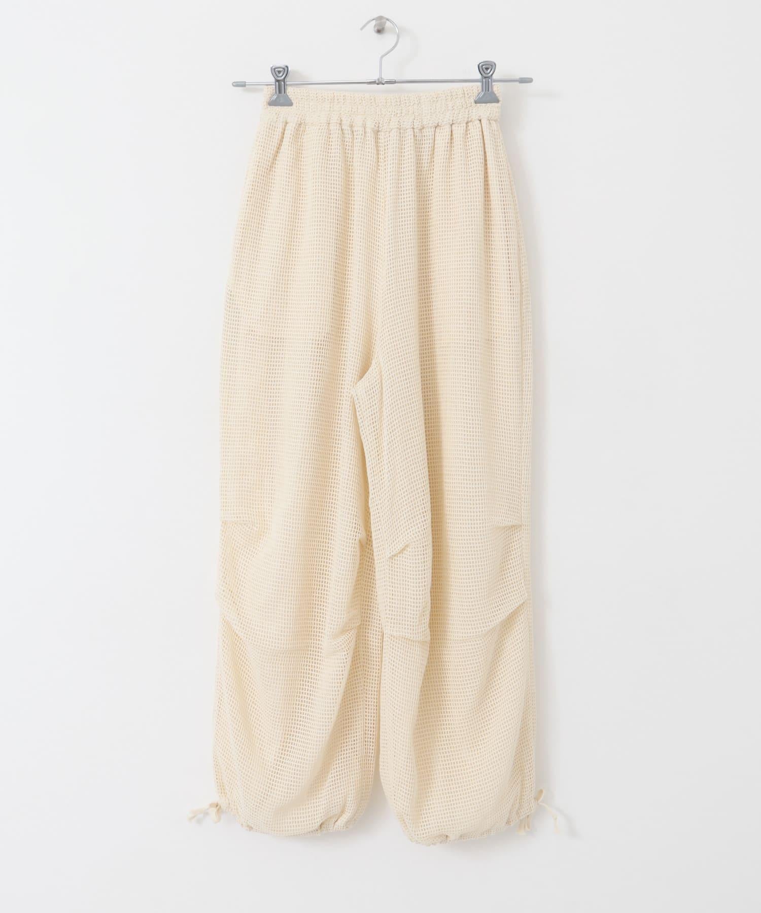 褲子採用網眼材料製成,質感自然。腰部鬆緊設計讓穿著毫無壓力,內襯確保腿部線條不會過於臃腫。下襬可收緊,膝部採用收褶設計,打造自然的立體輪廓。