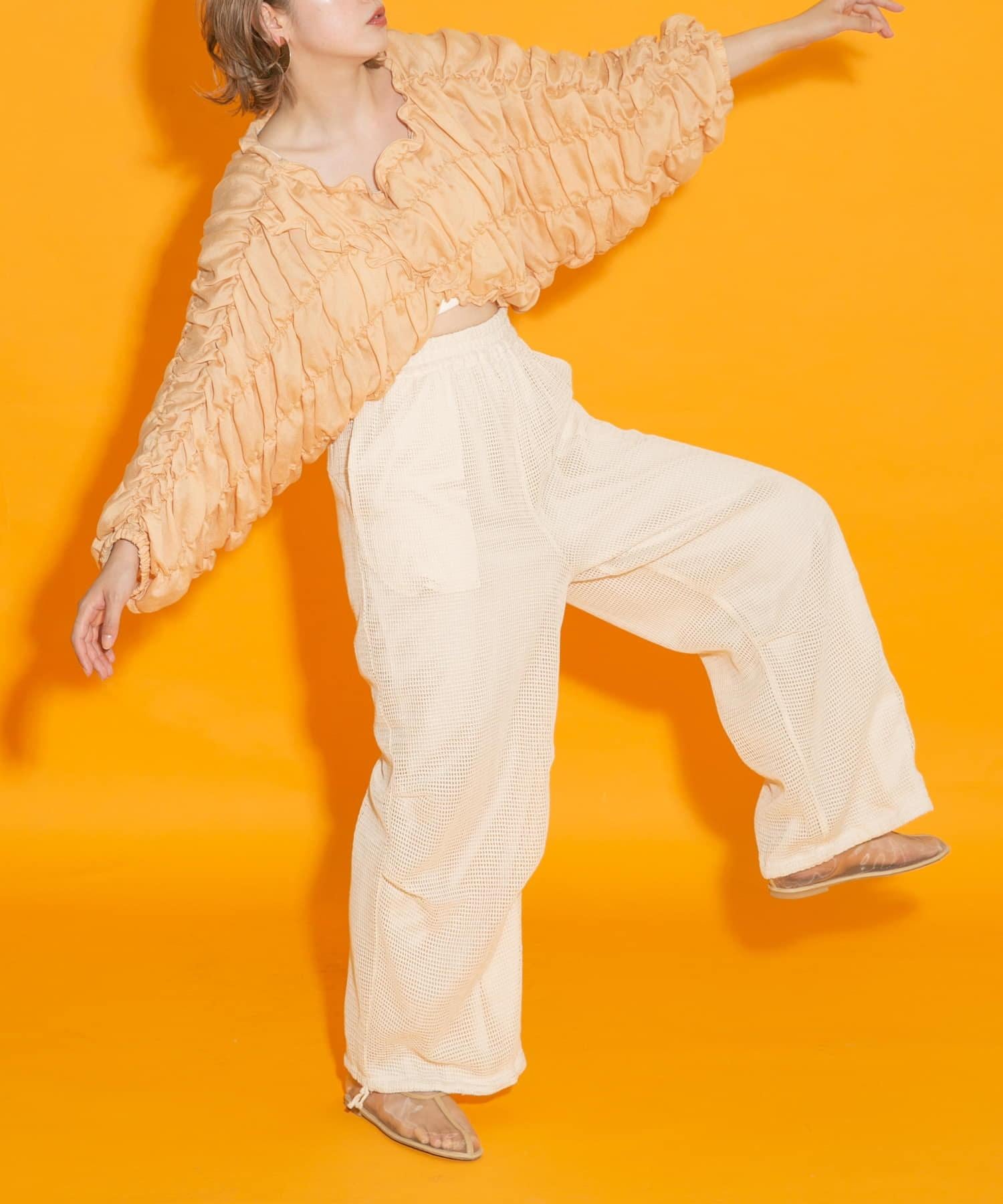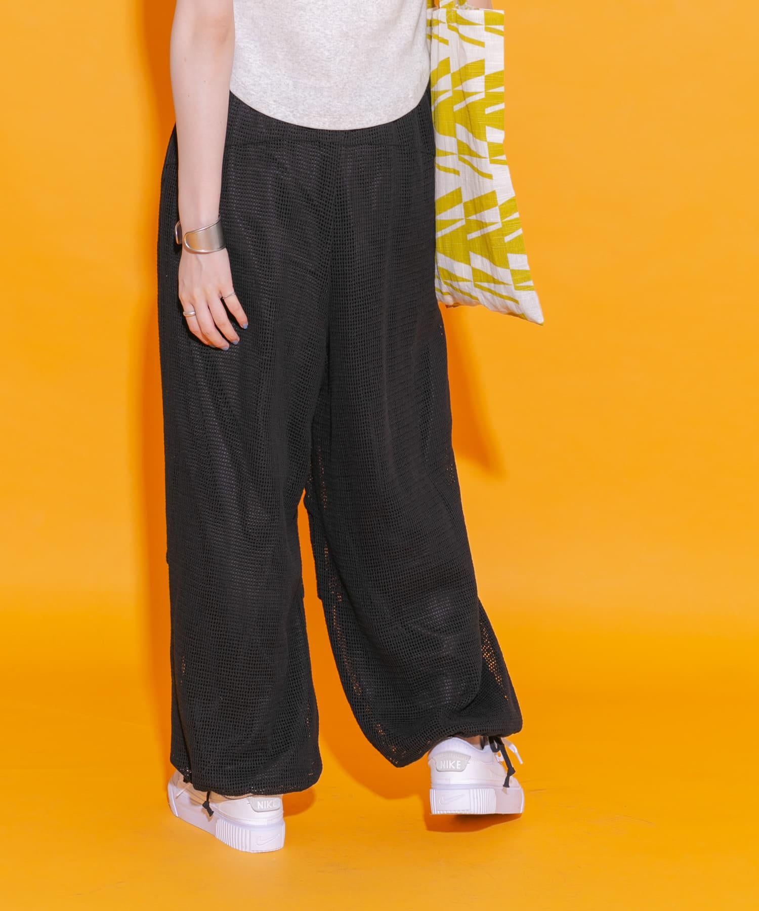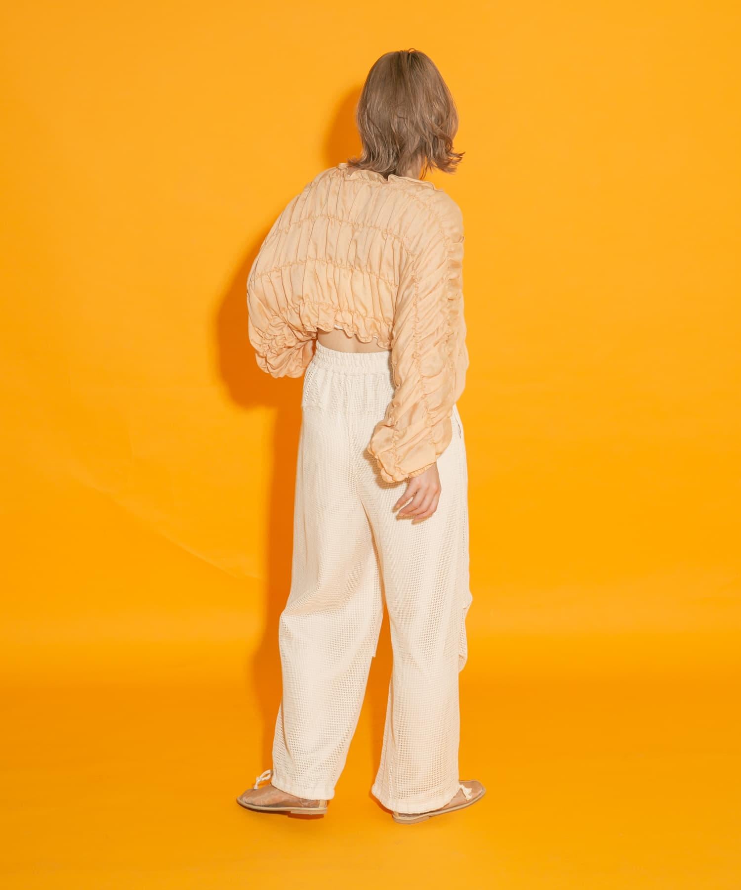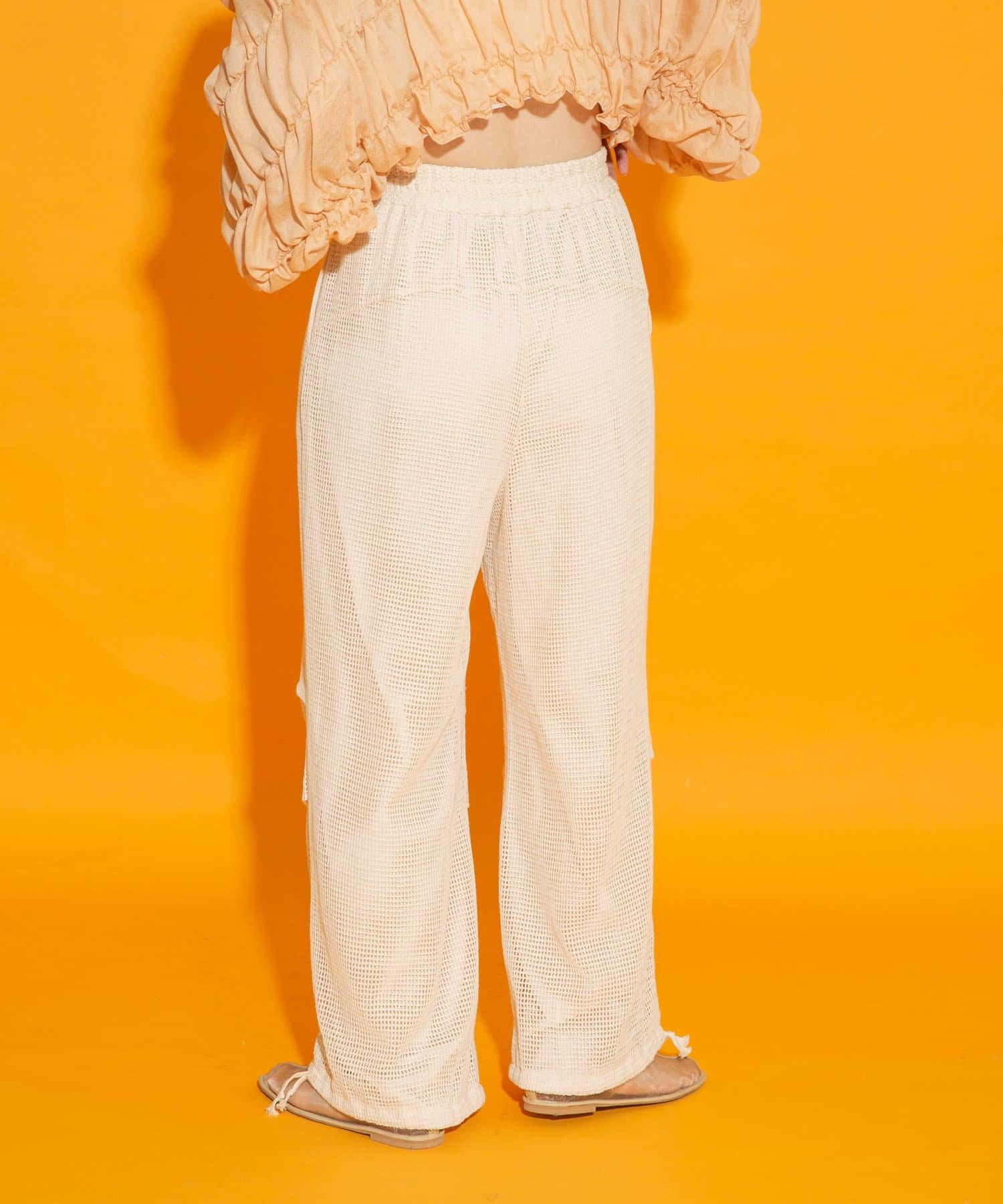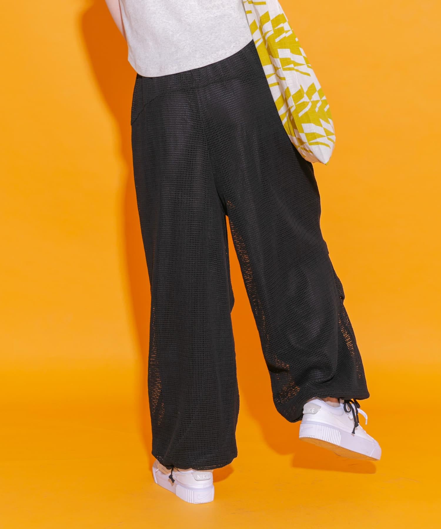 褲子採用網眼材料製成,質感自然。腰部鬆緊設計讓穿著毫無壓力,內襯確保腿部線條不會過於臃腫。下襬可收緊,膝部採用收褶設計,打造自然的立體輪廓。