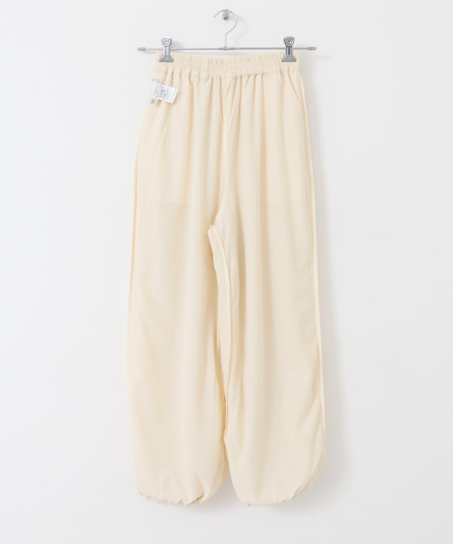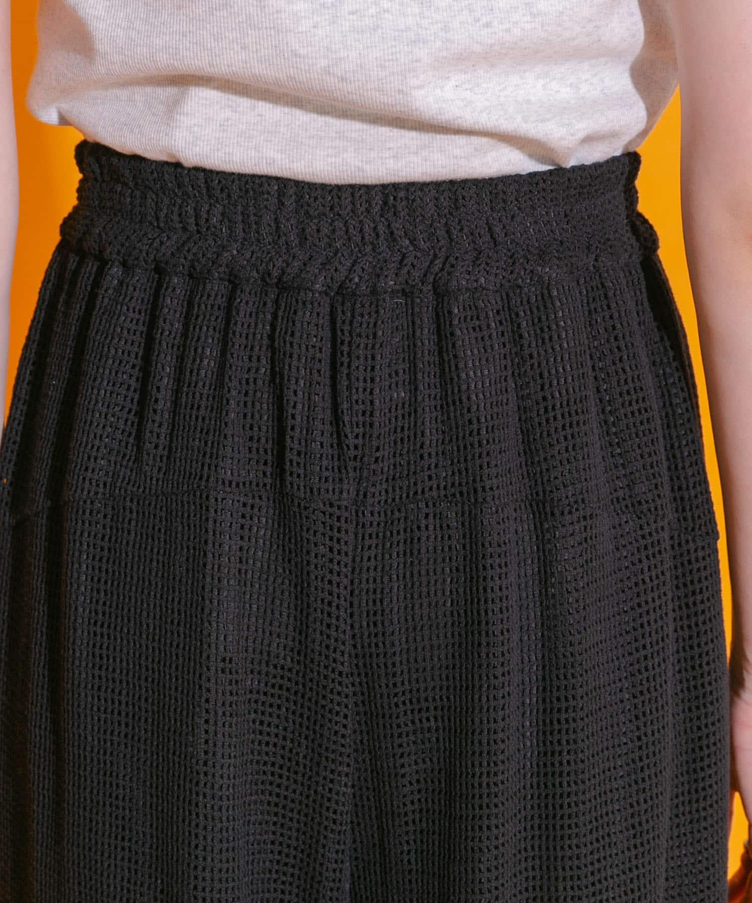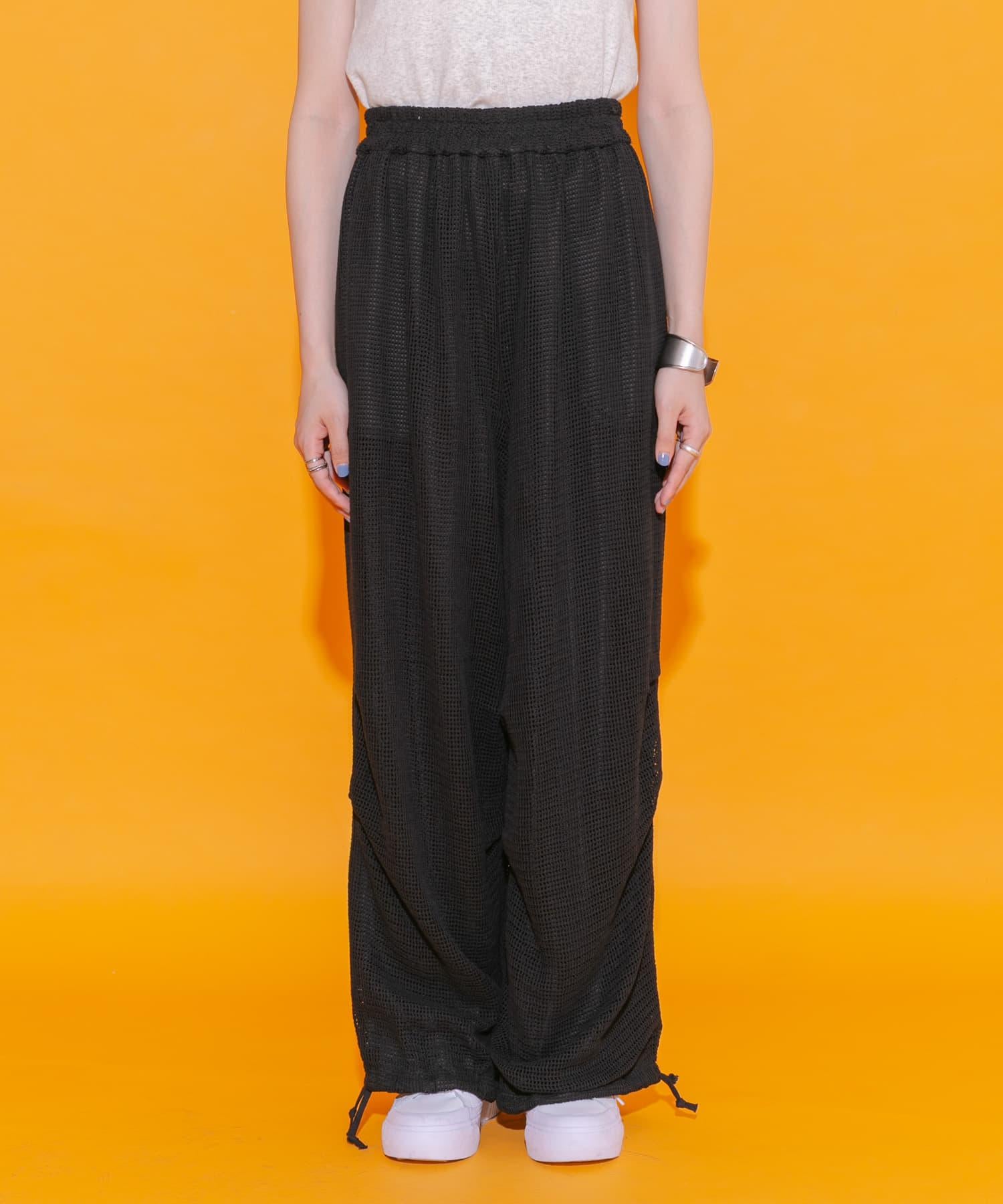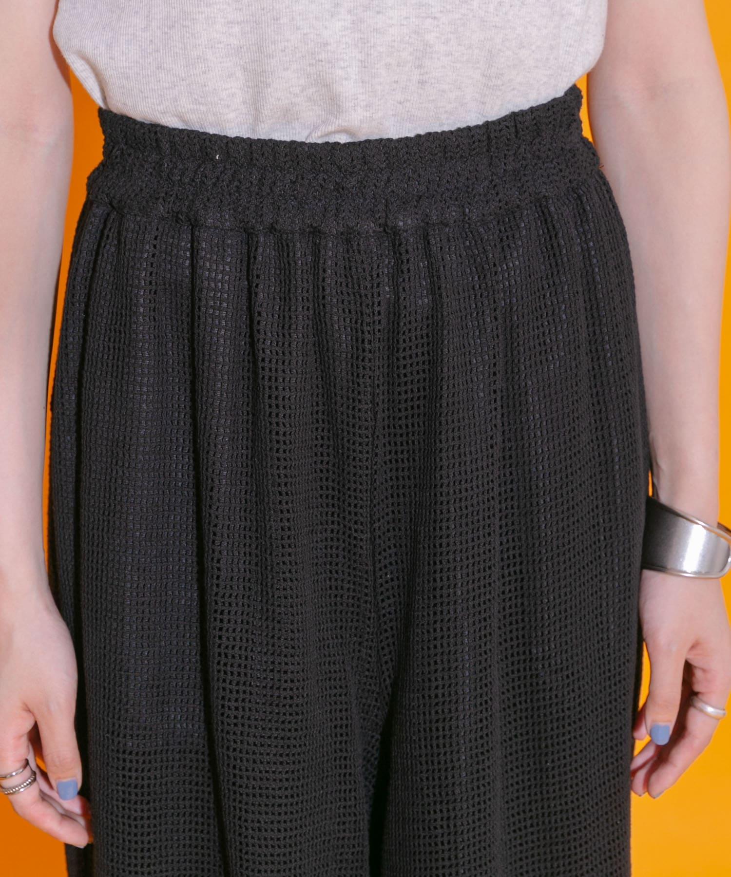 褲子採用網眼材料製成,質感自然。腰部鬆緊設計讓穿著毫無壓力,內襯確保腿部線條不會過於臃腫。下襬可收緊,膝部採用收褶設計,打造自然的立體輪廓。