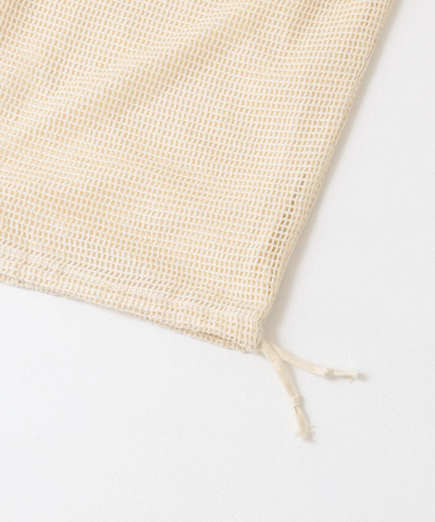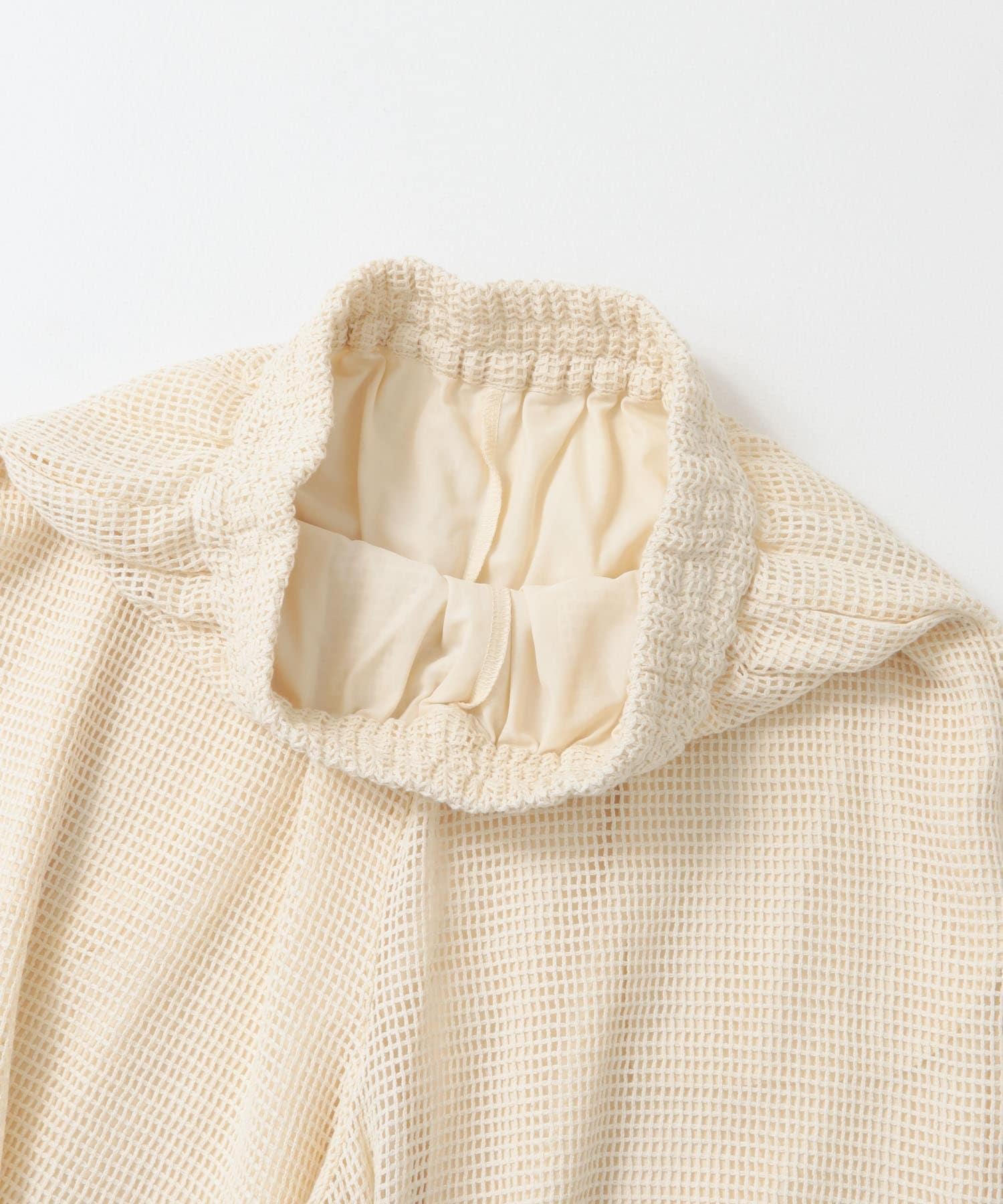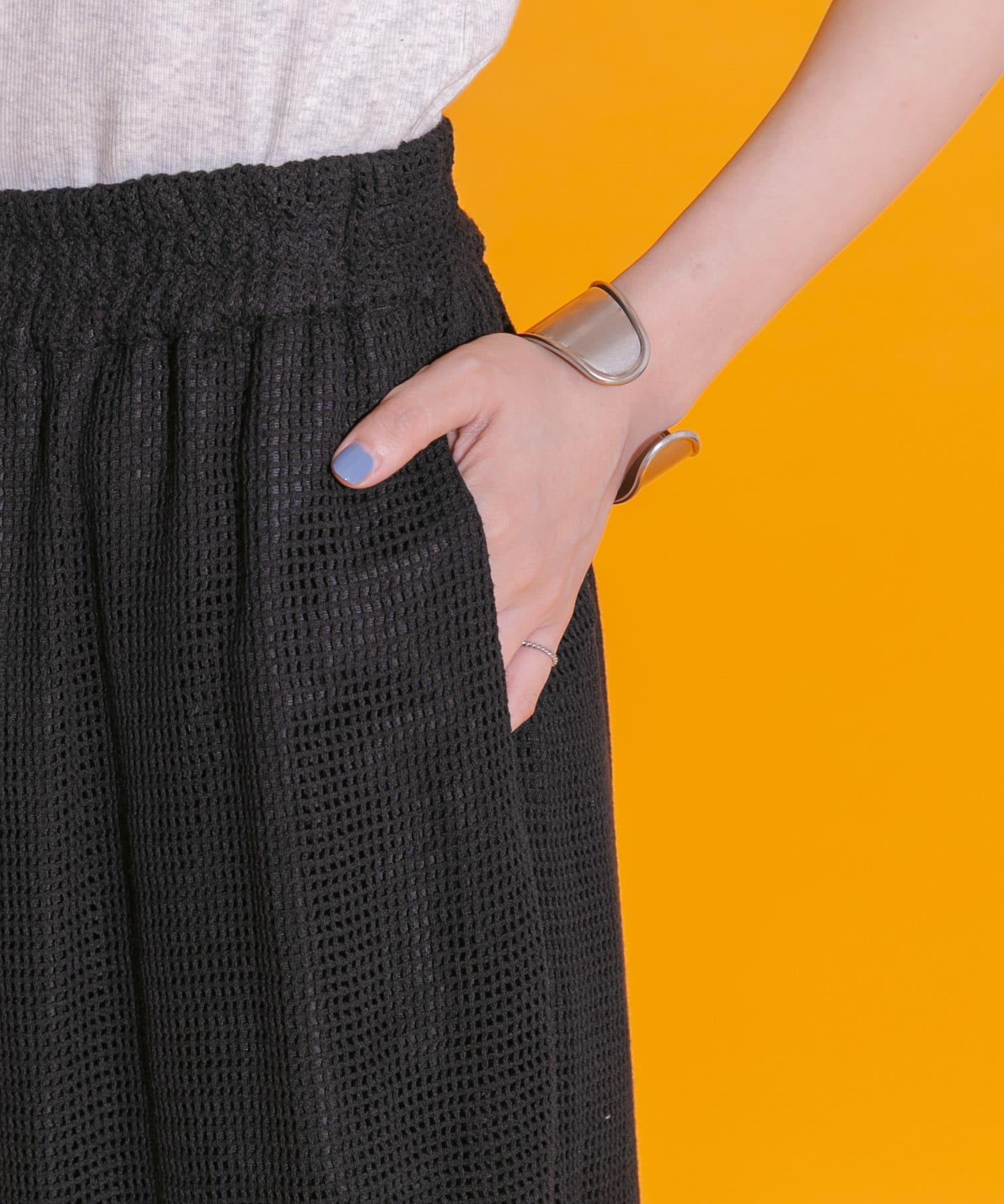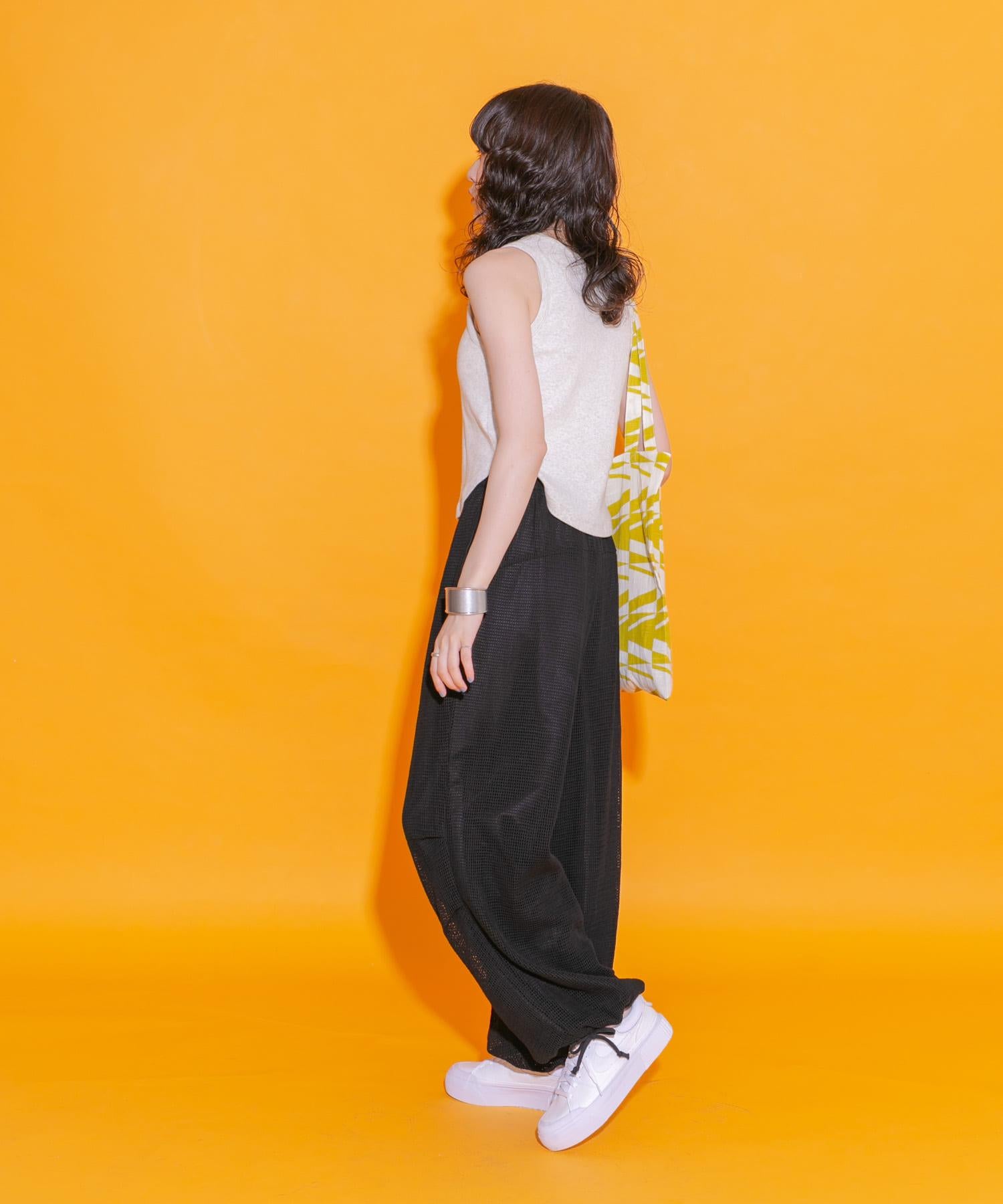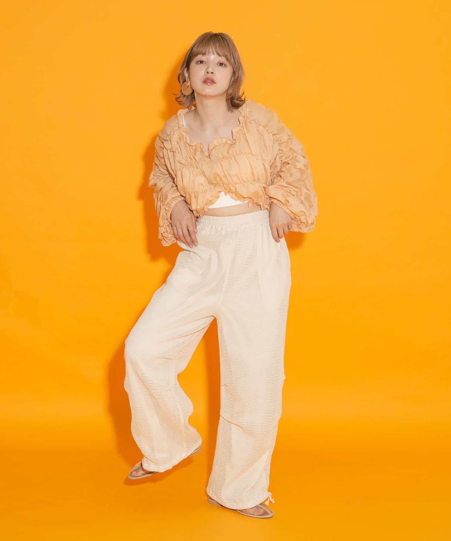 褲子採用網眼材料製成,質感自然。腰部鬆緊設計讓穿著毫無壓力,內襯確保腿部線條不會過於臃腫。下襬可收緊,膝部採用收褶設計,打造自然的立體輪廓。