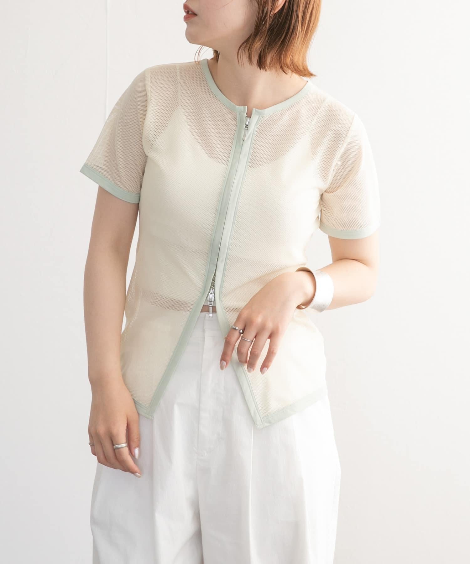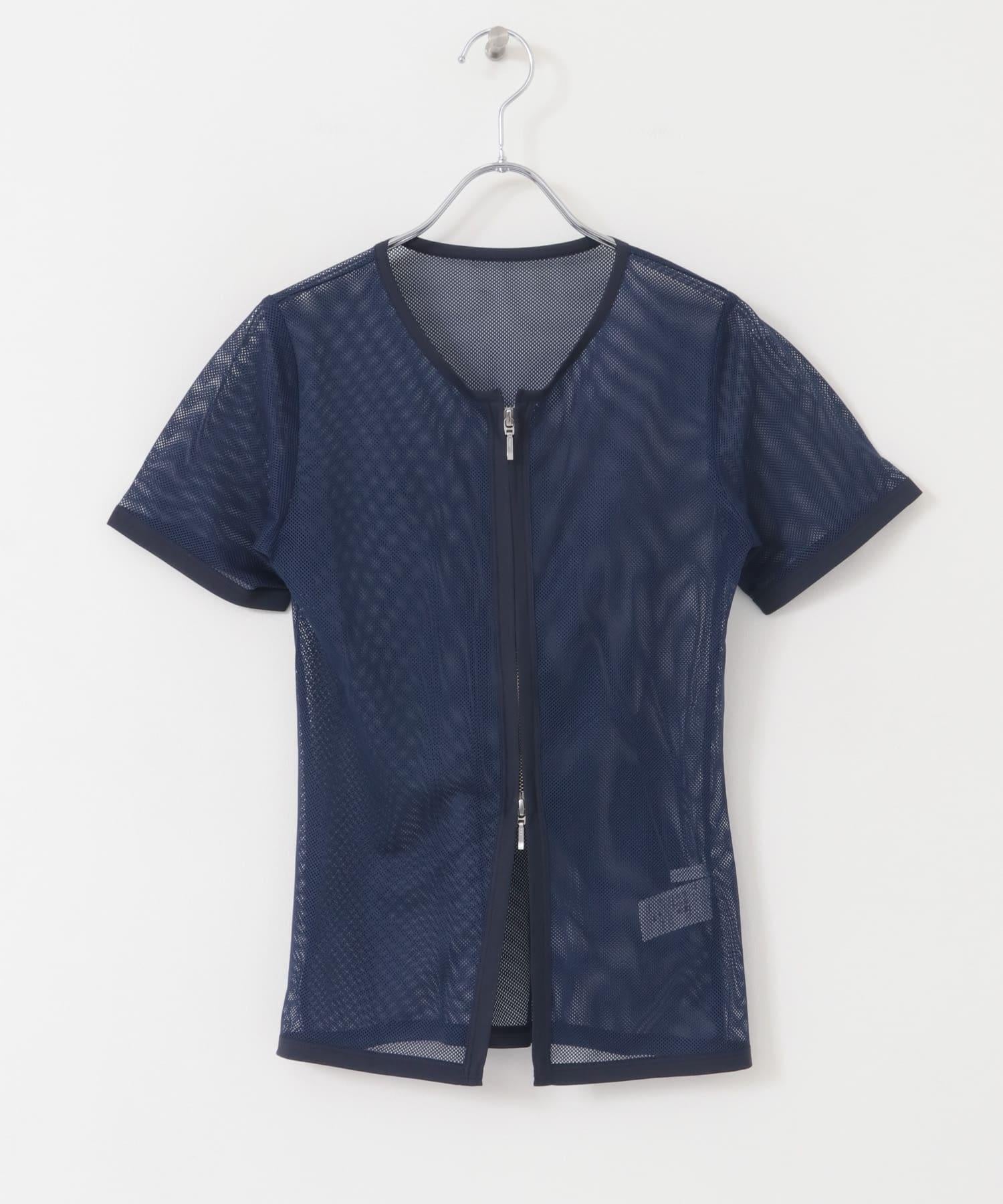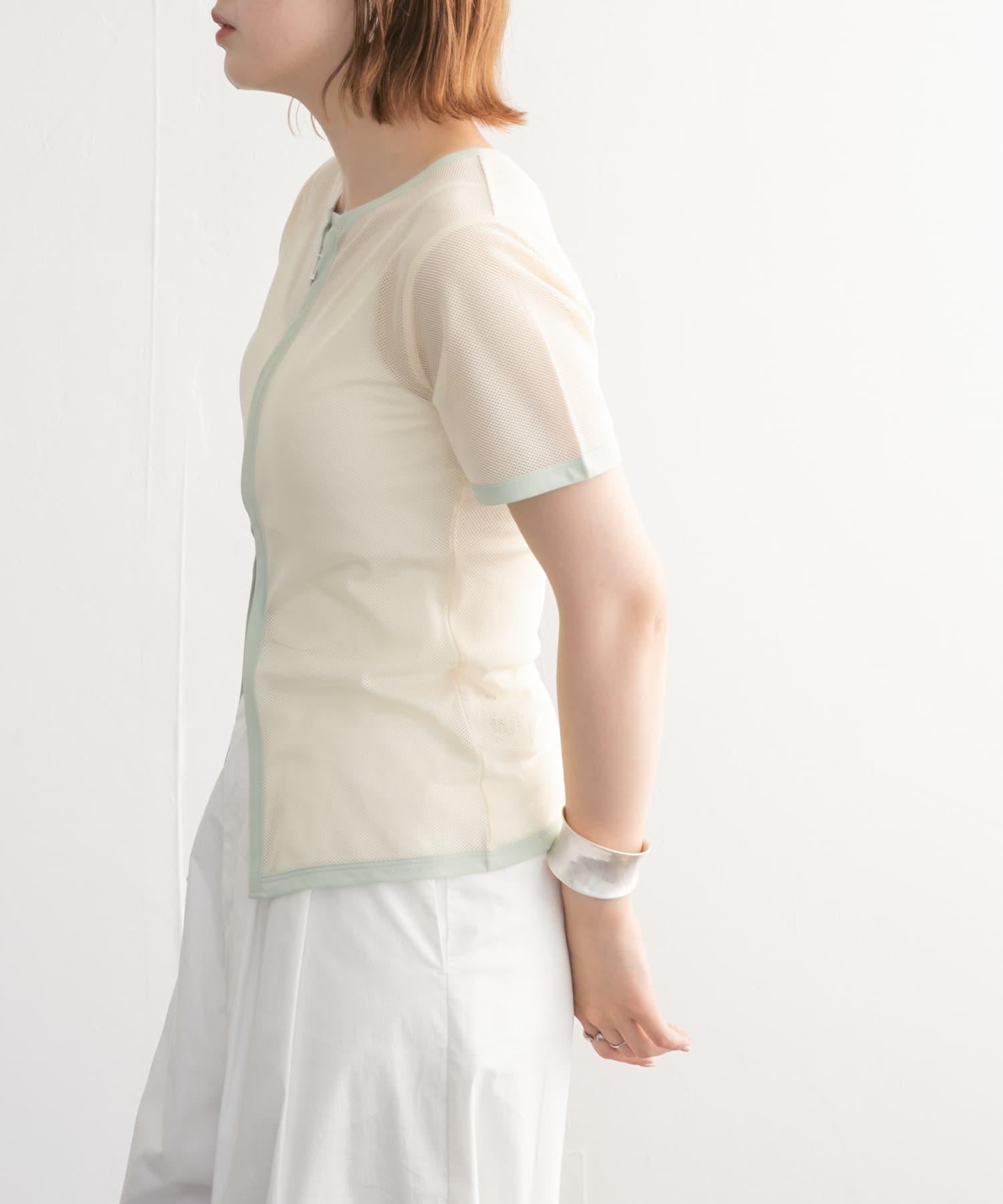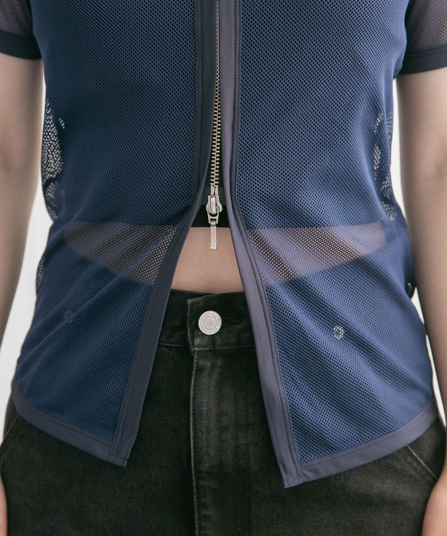 適度緊身的網眼上衣,散發時尚氣息。衣領、袖口和下襬處均有鑲邊,避免過於隨意。前襟扣為反向開口,便於搭配寬鬆的下裝。