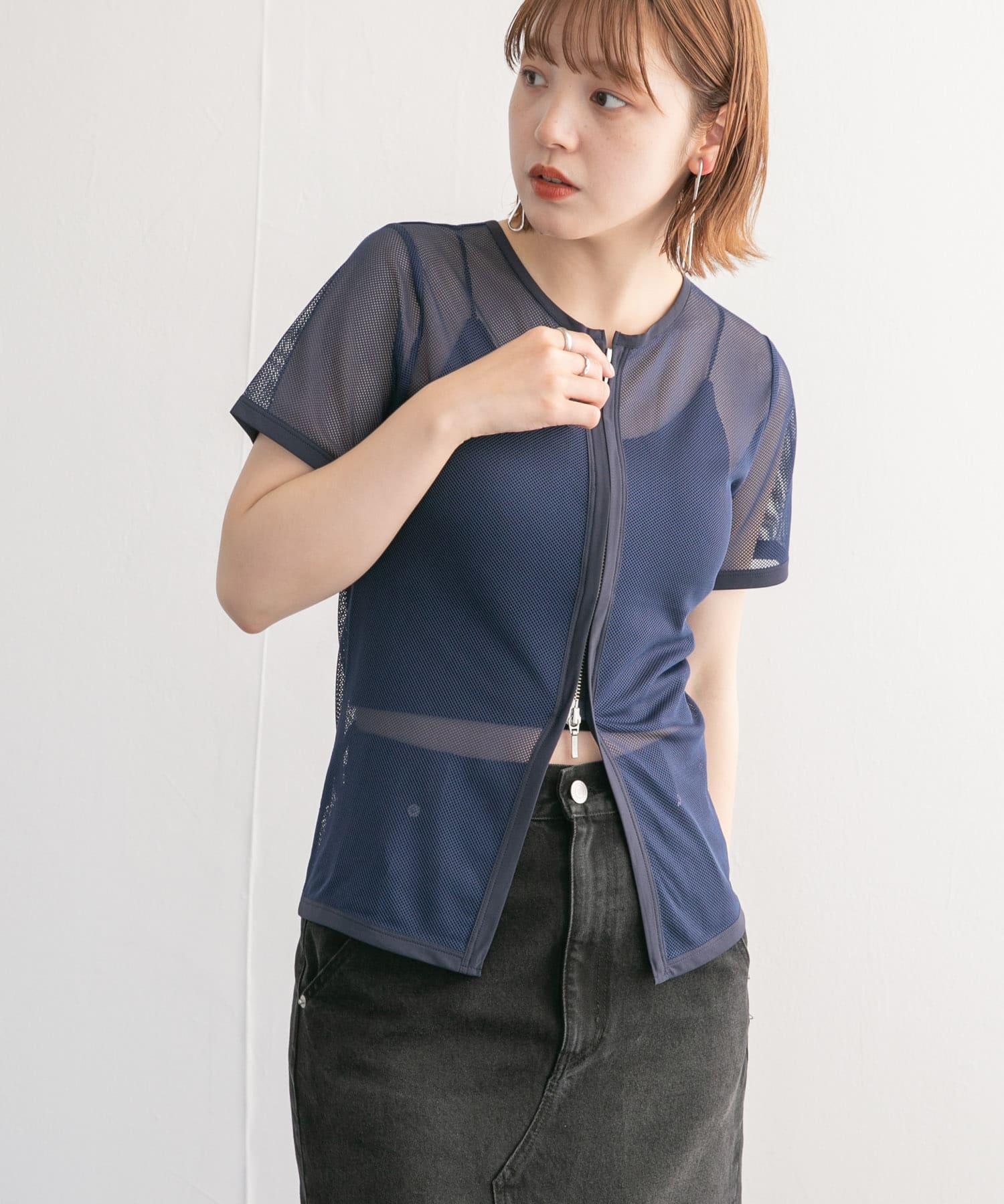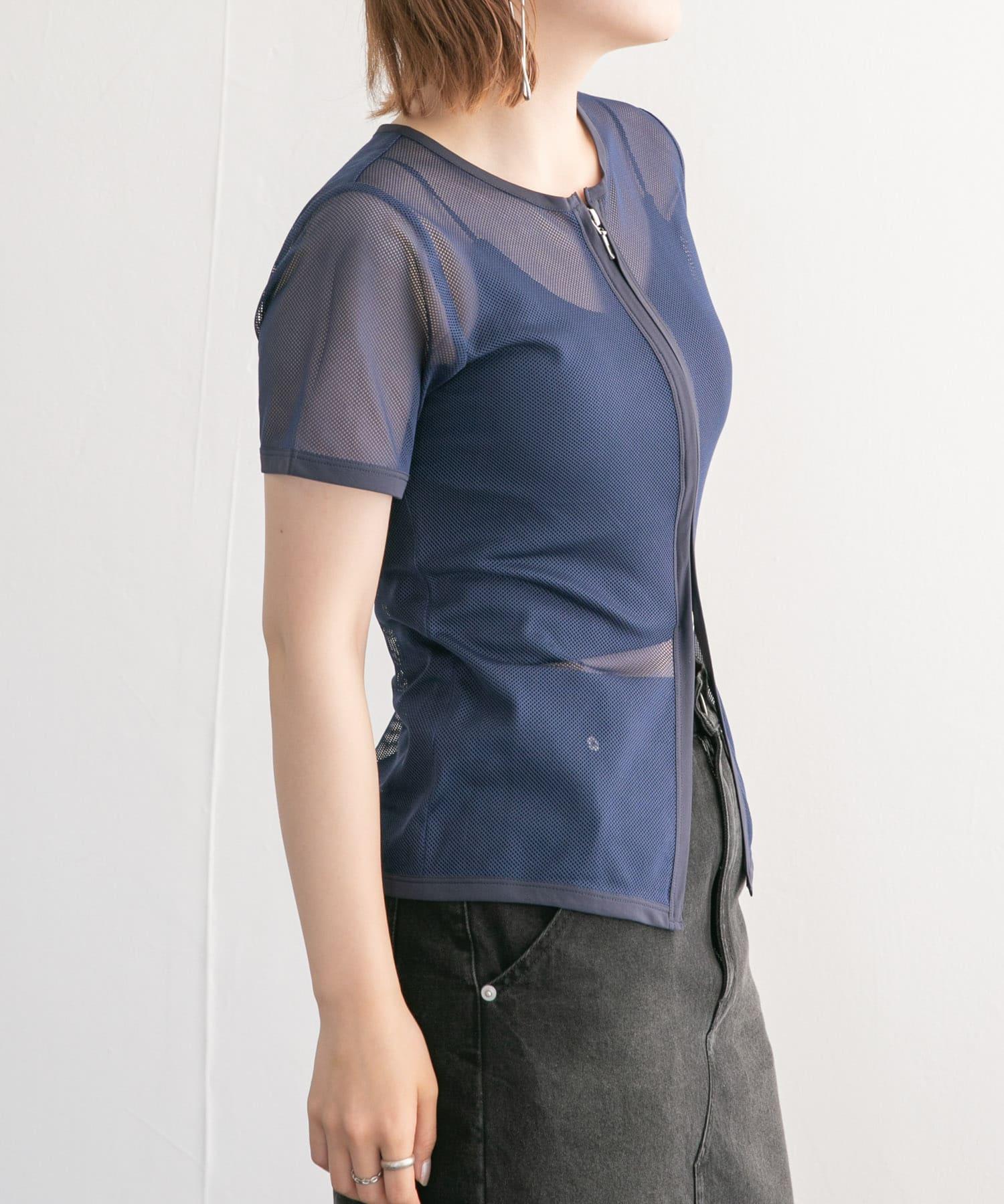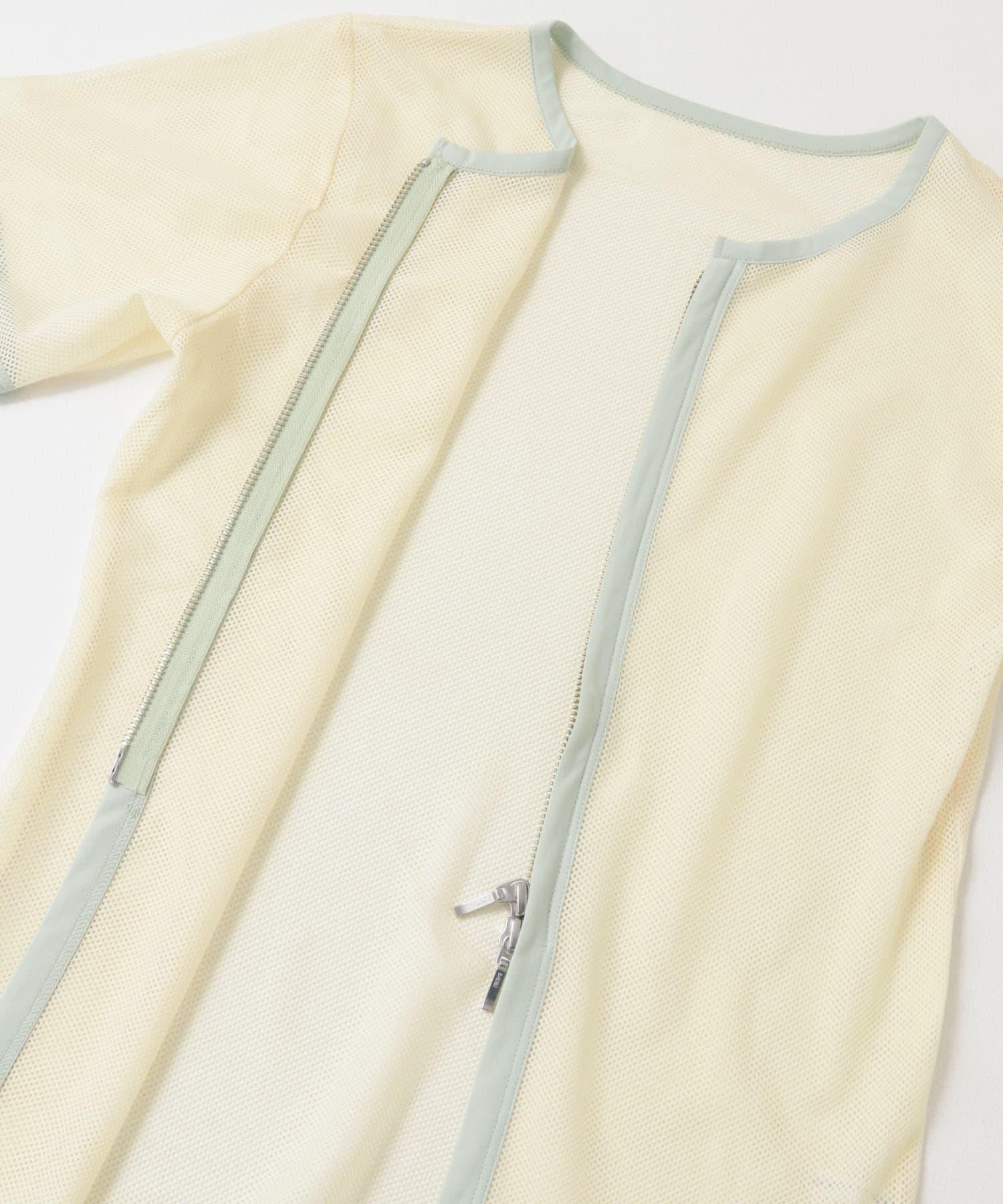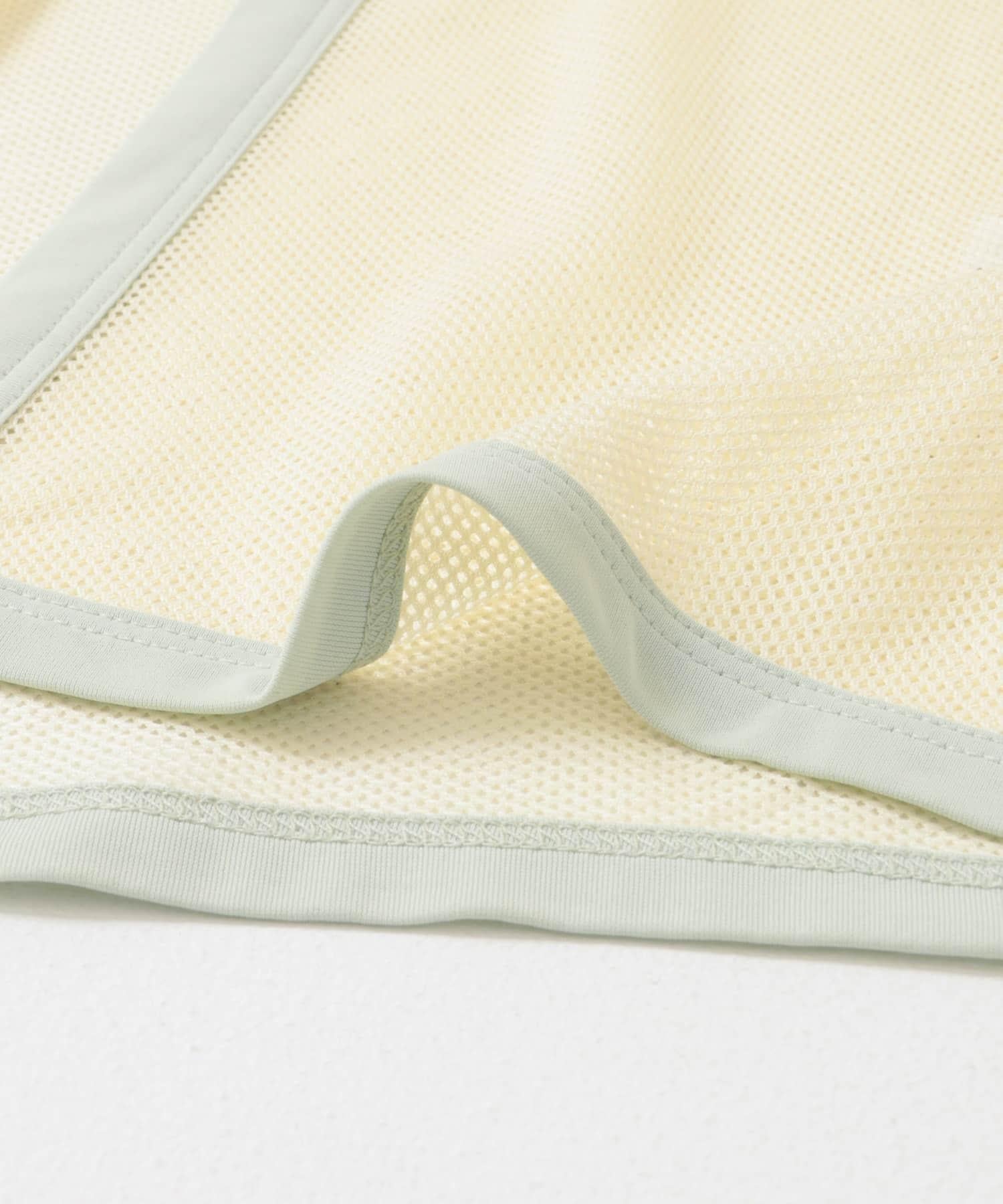 適度緊身的網眼上衣,散發時尚氣息。衣領、袖口和下襬處均有鑲邊,避免過於隨意。前襟扣為反向開口,便於搭配寬鬆的下裝。