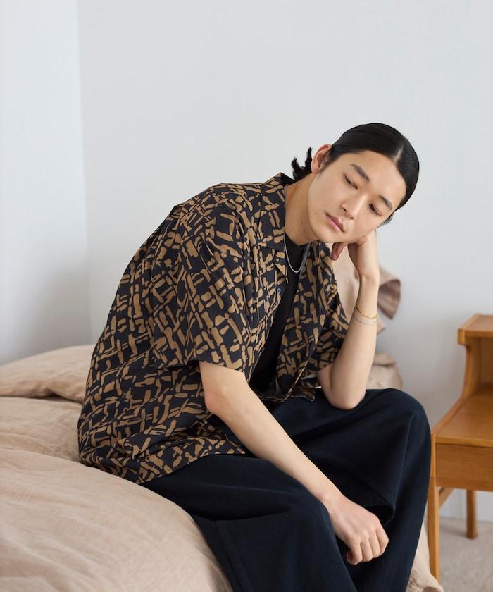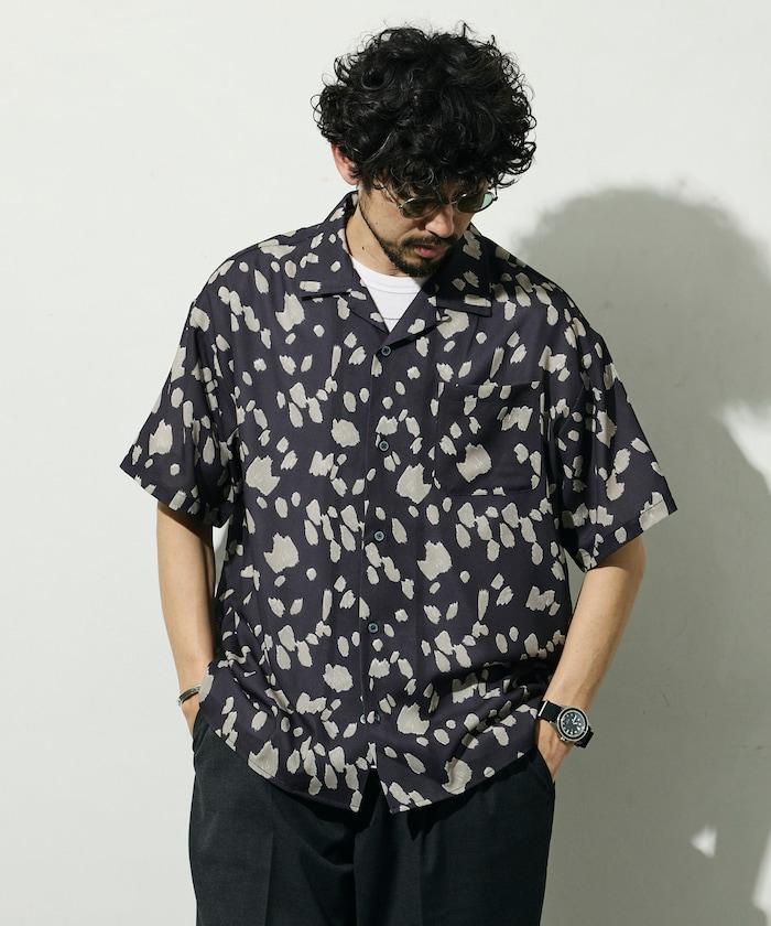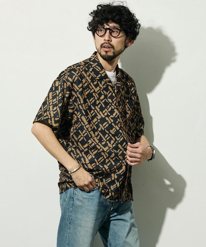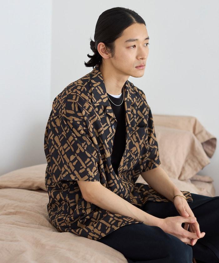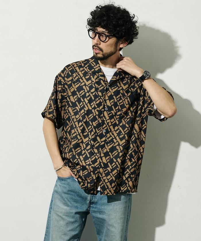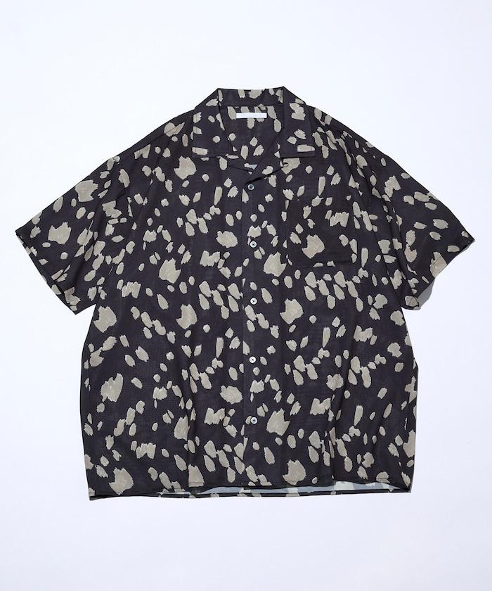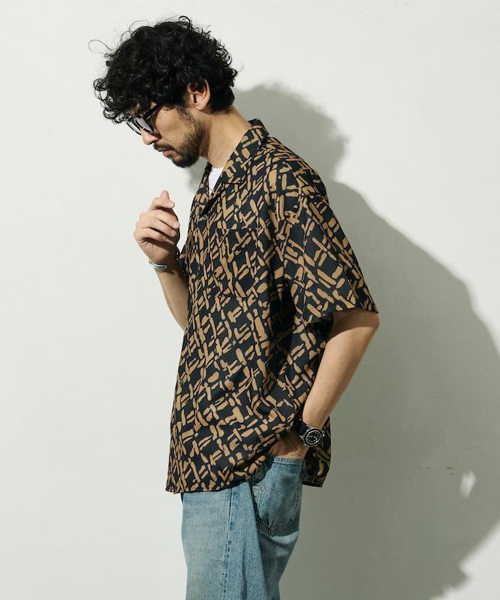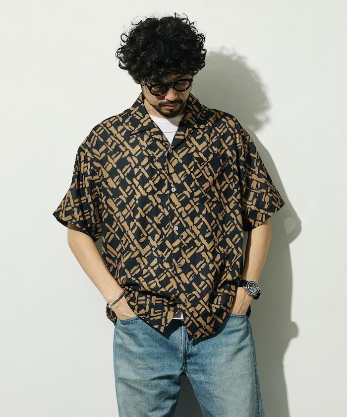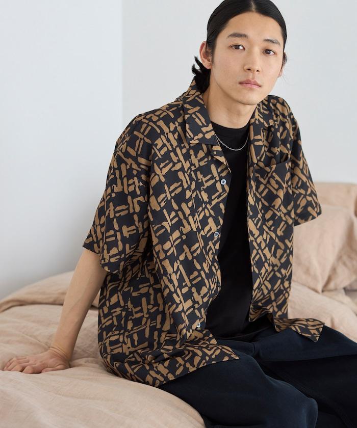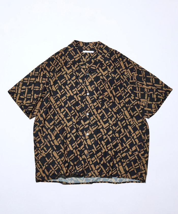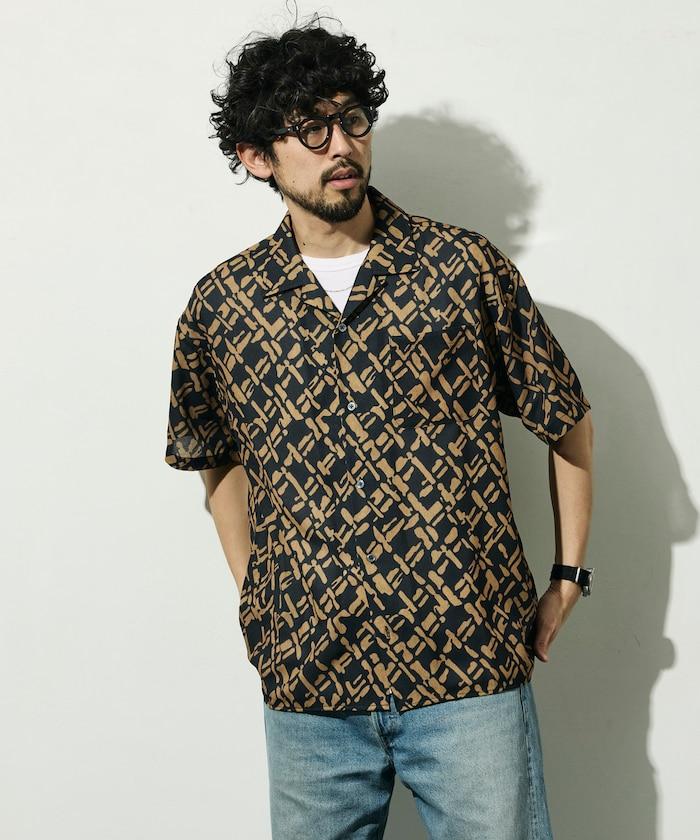 網眼材質 + 寬鬆廓形 + 滿版圖案設計 + 開襟 + 短袖襯衫 最終商品名: 網眼寬鬆廓形滿版圖案開襟短袖襯衫