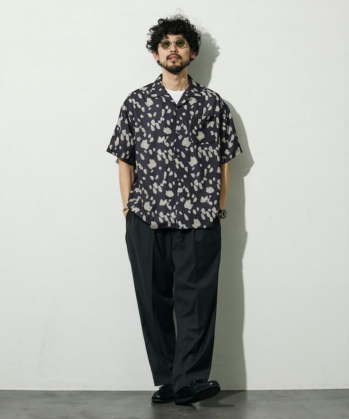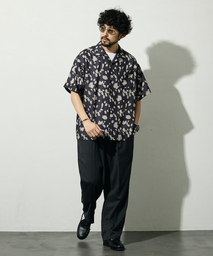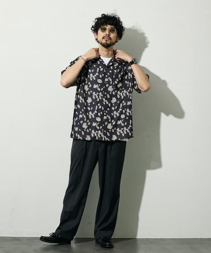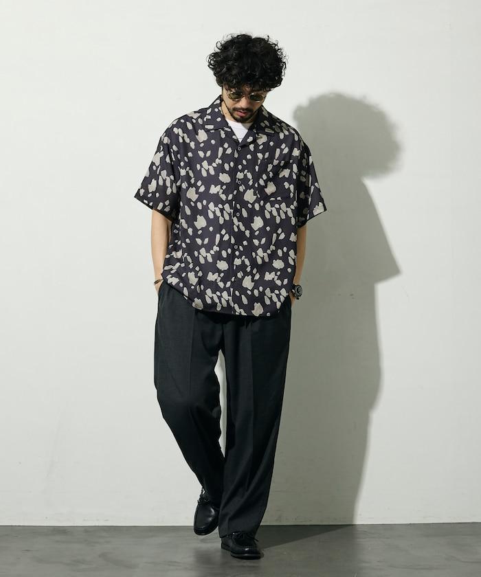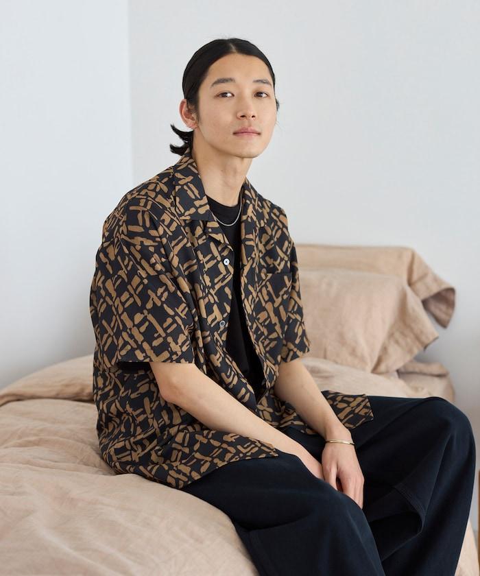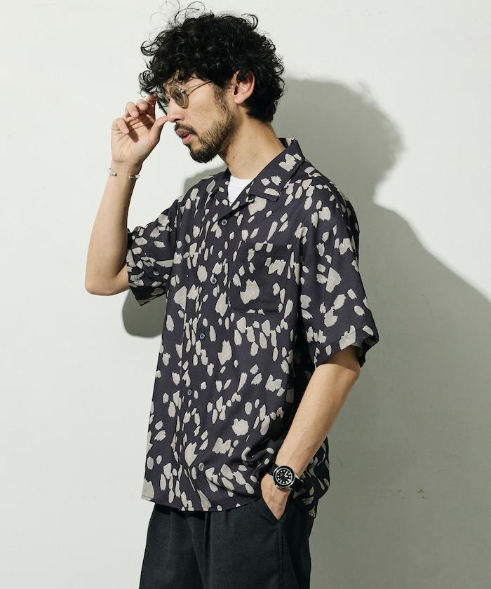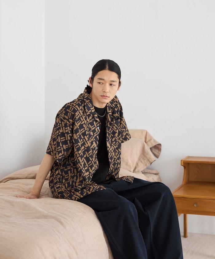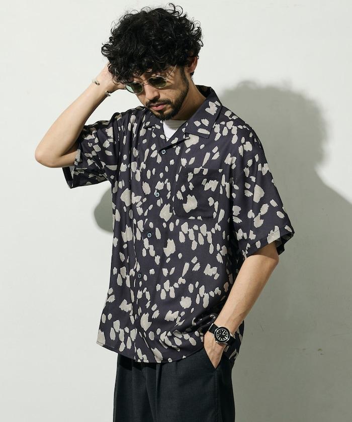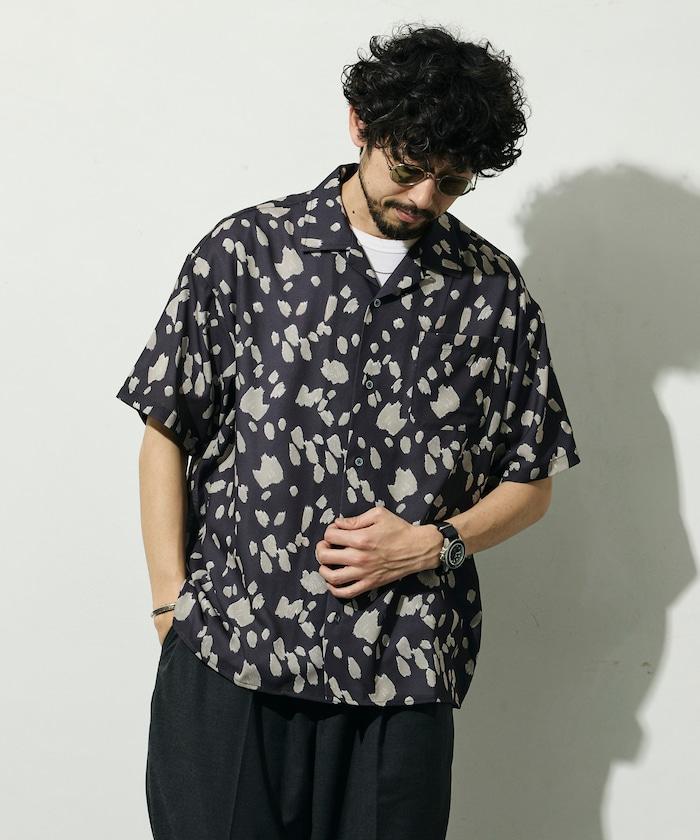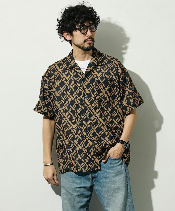 網眼材質 + 寬鬆廓形 + 滿版圖案設計 + 開襟 + 短袖襯衫 最終商品名: 網眼寬鬆廓形滿版圖案開襟短袖襯衫