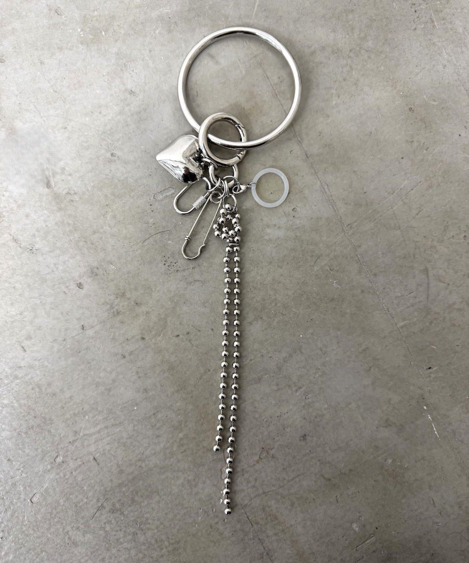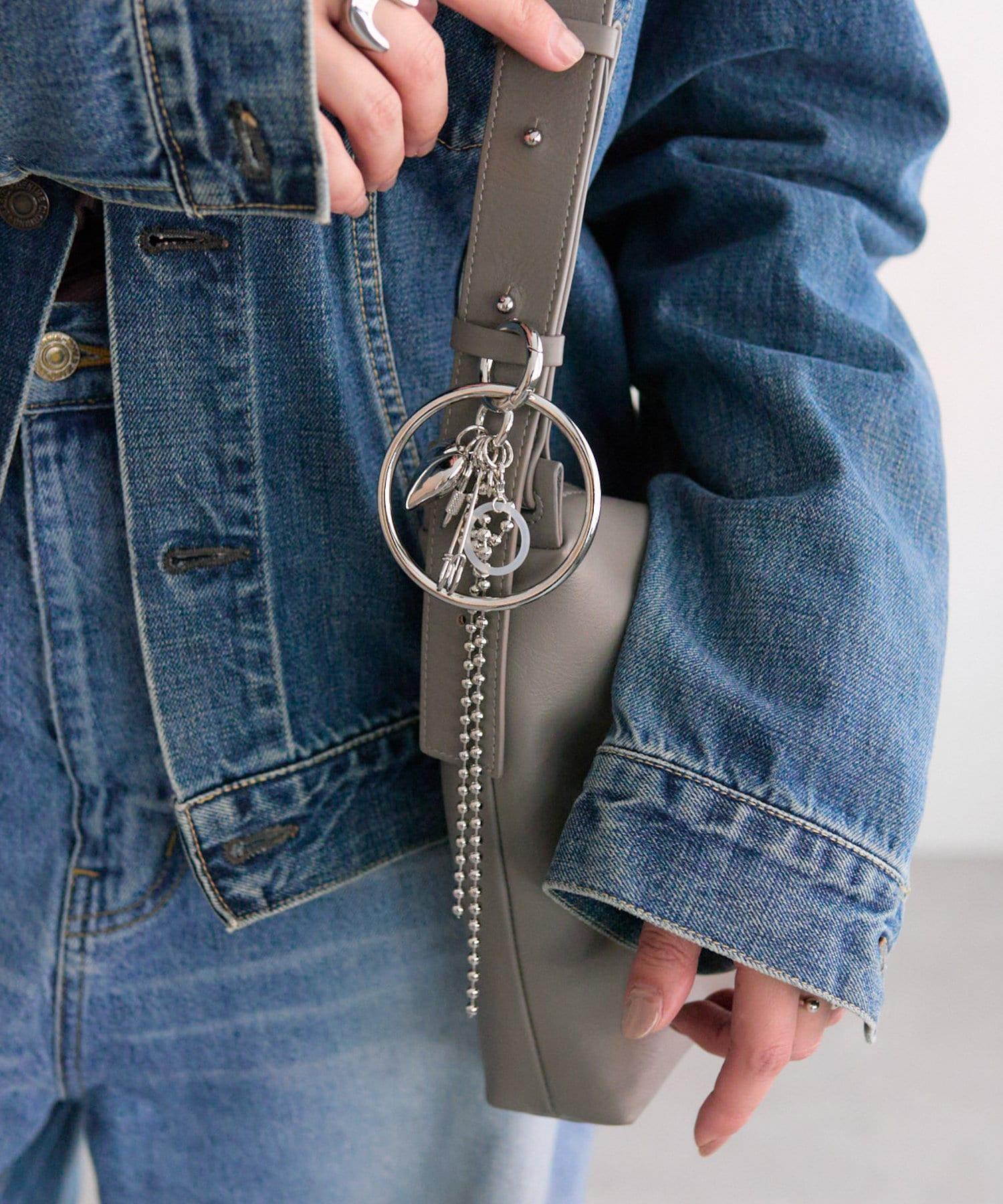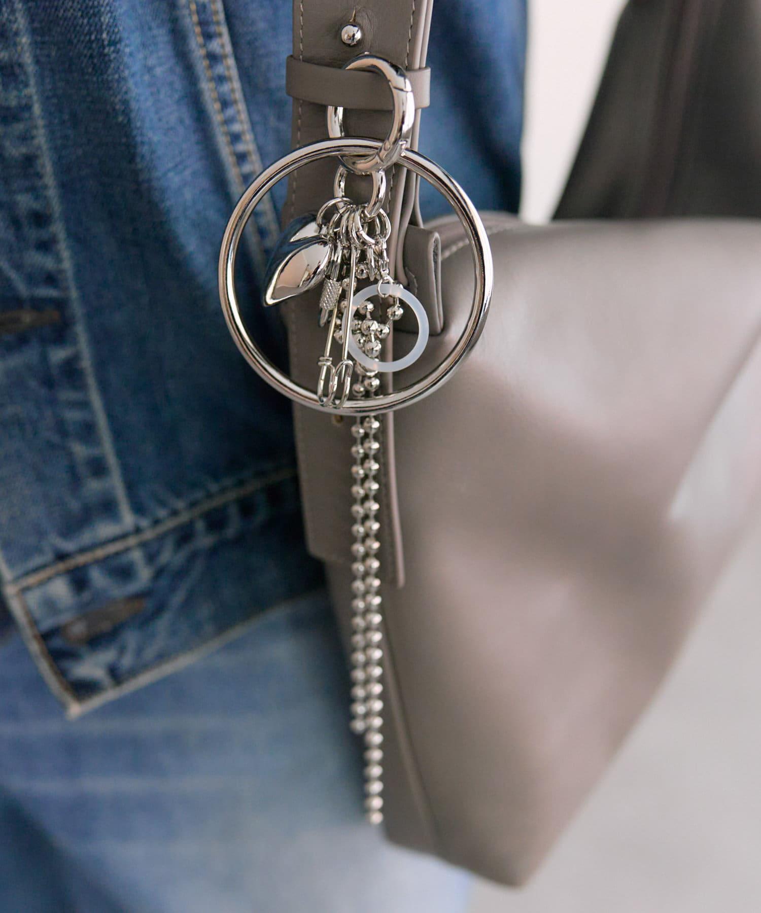 這款手袋吊飾以長長的球形鏈條和大大的吊環為特色。