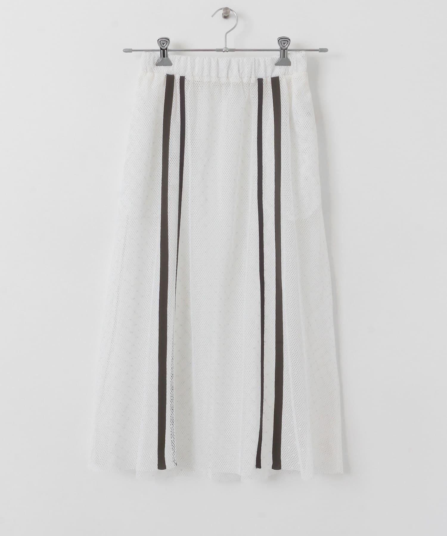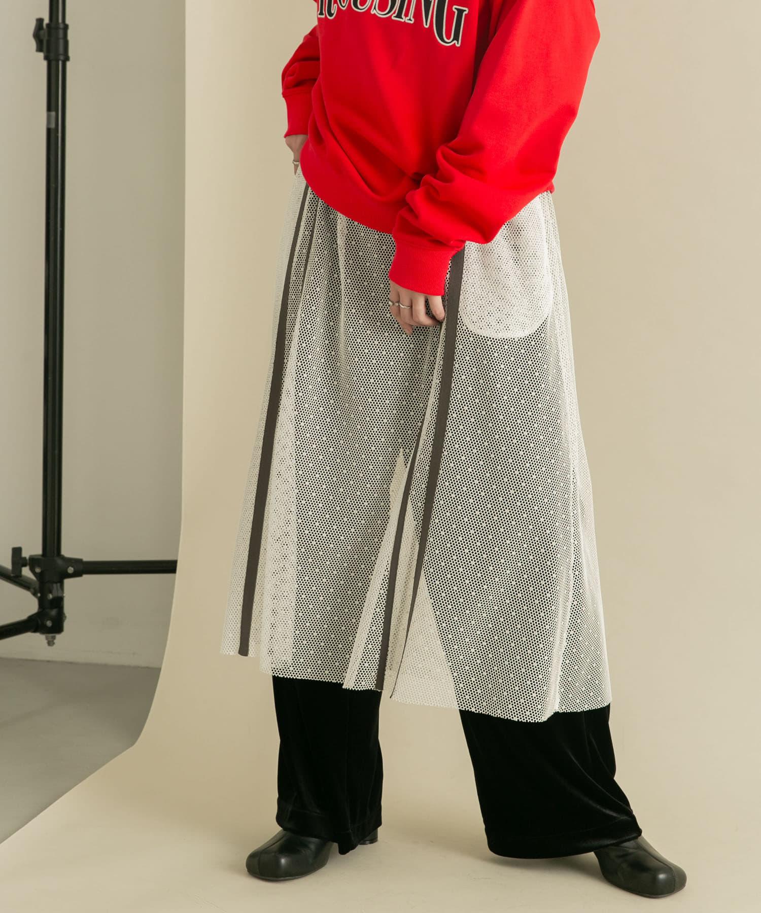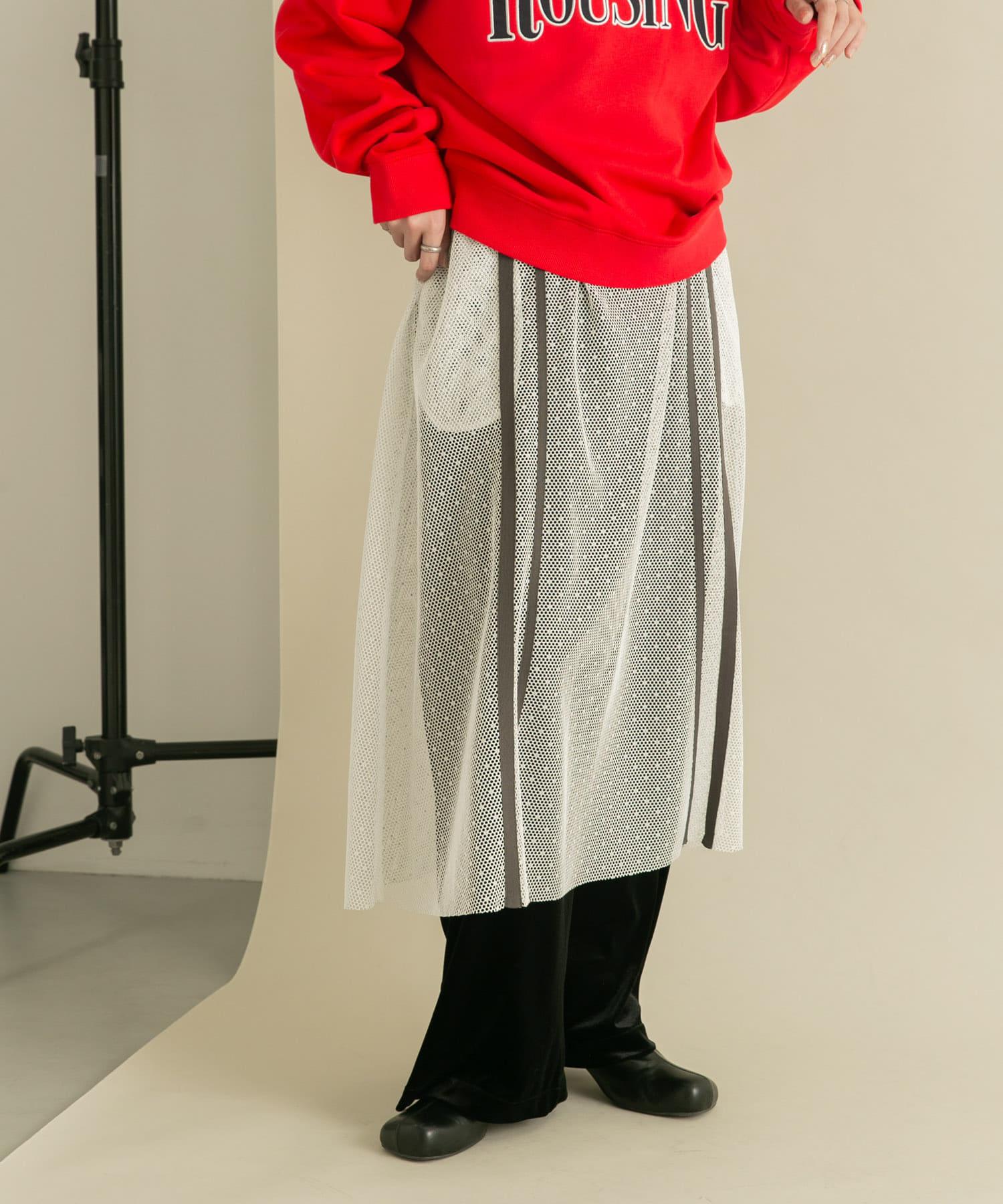 這款裙子一定會為你的造型錦上添花。採用網眼布材質,配以薄紗裝飾,前幅以同色系膠帶點綴。隨性的口袋也是一大亮點。建議多層搭配。