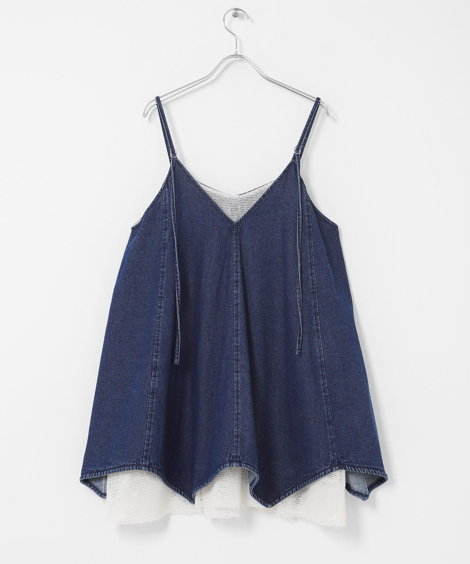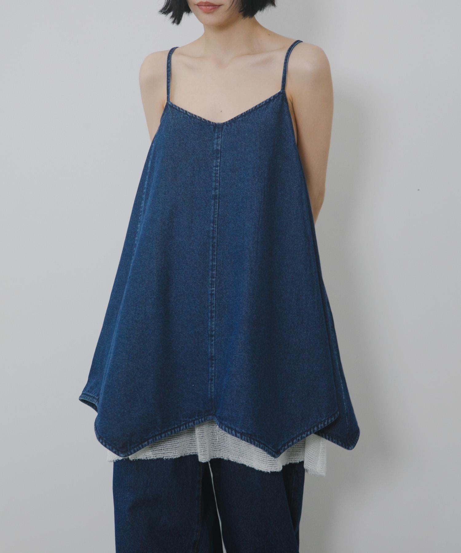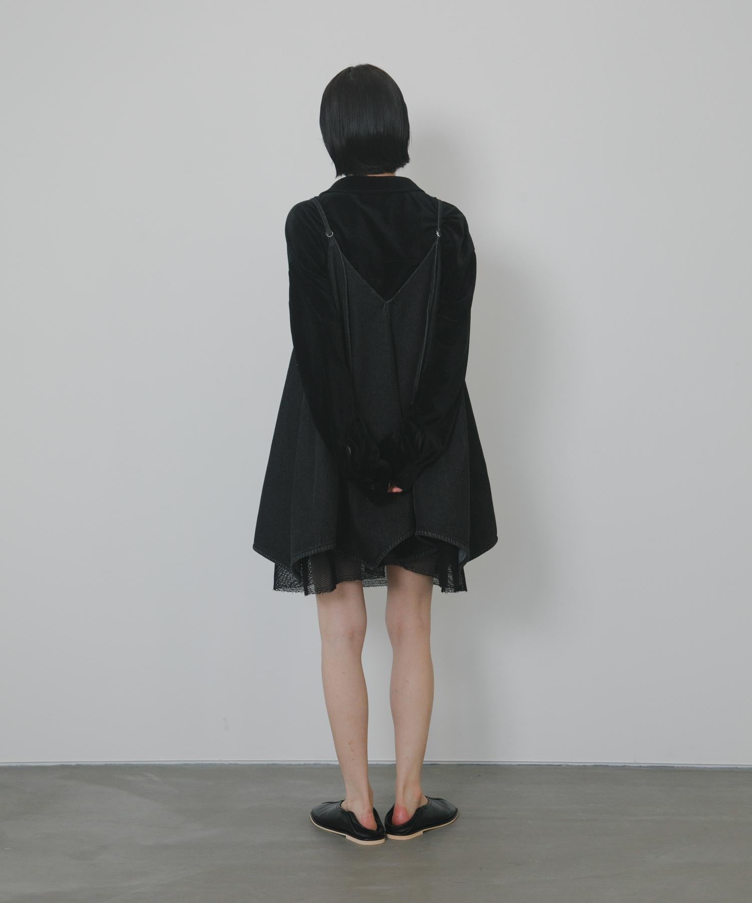 牛仔吊帶連衣裙,下襬採用多層網紗設計。每當你移動時,設計都會改變表情。後背的款式還採用了深 V 領設計,讓人感覺輕鬆愜意。可調節的調節器讓它可以根據身高進行調節,根據疊穿單品的不同,你可以享受不同的裝扮,這也是一大亮點。